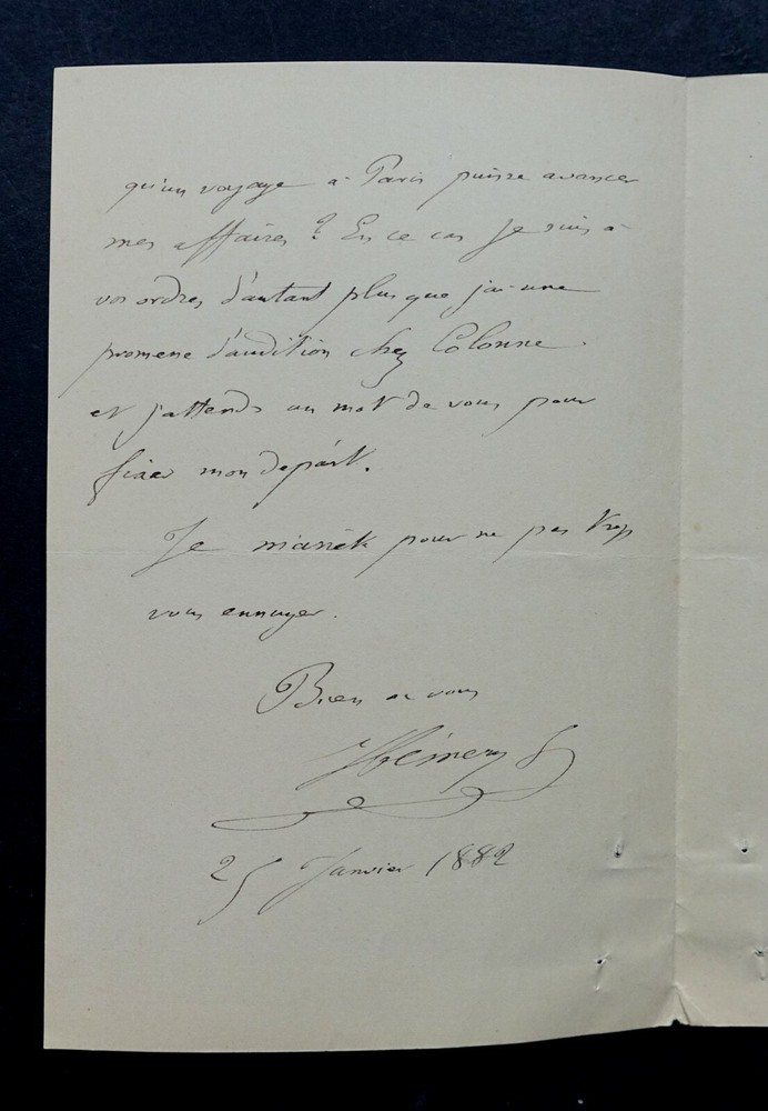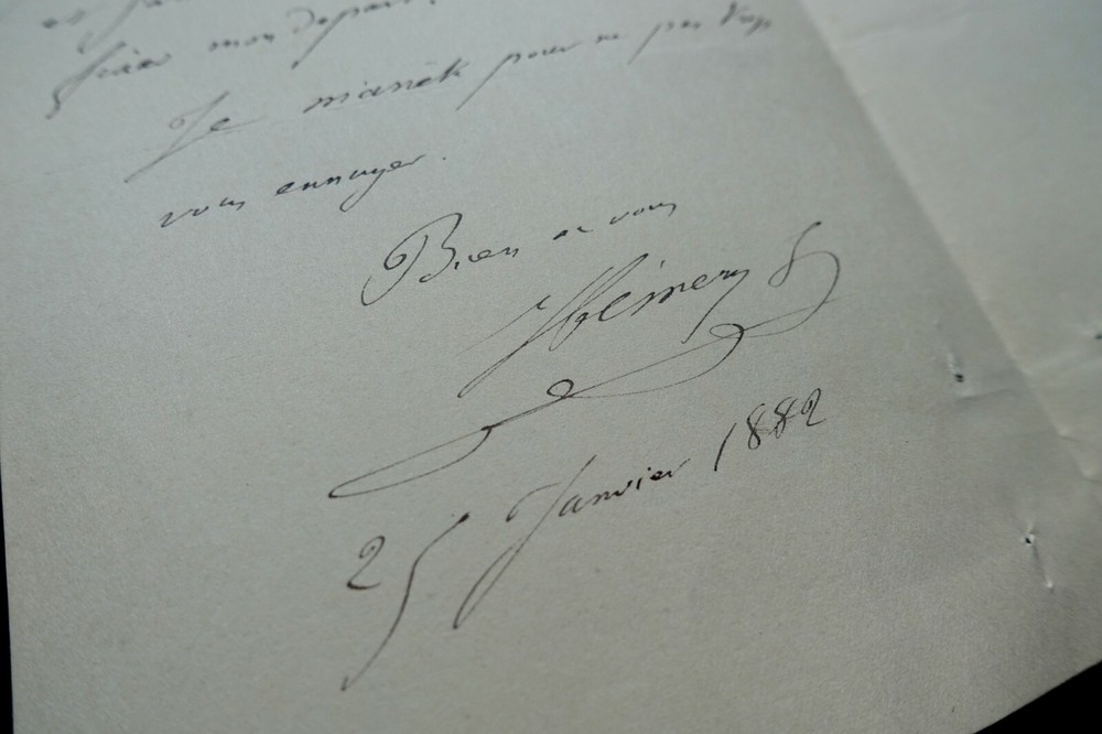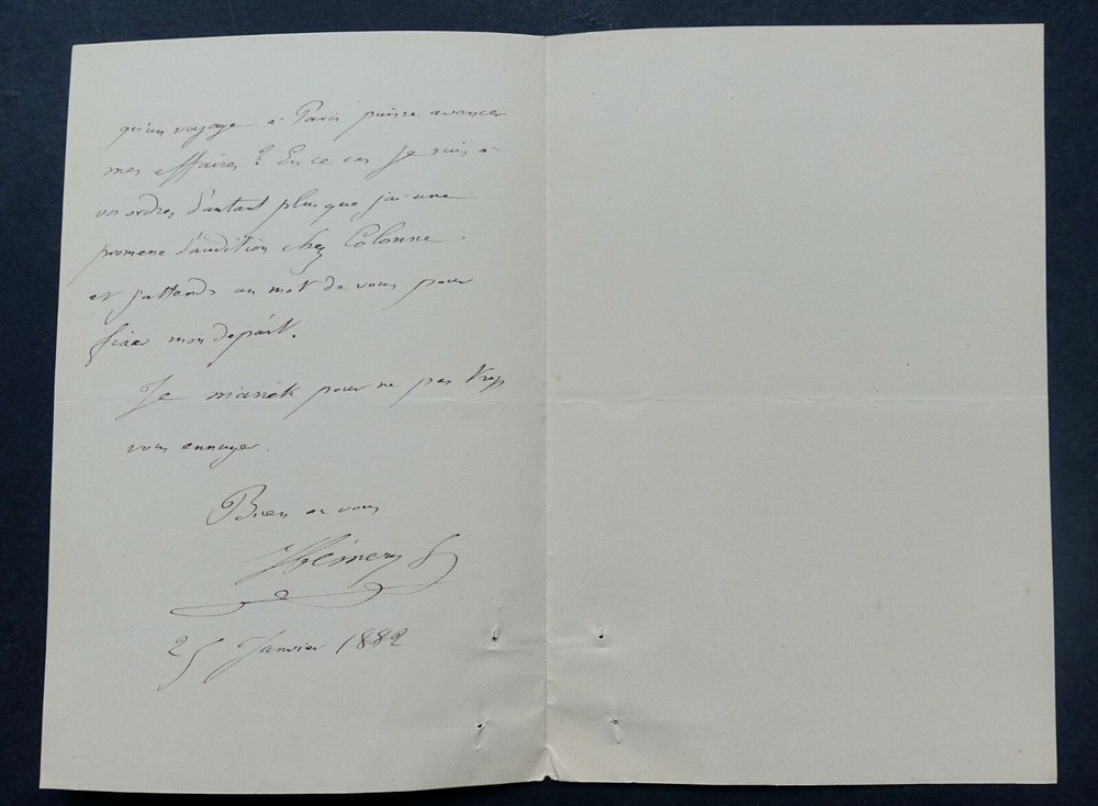 Hemery Etienne - Autographed Letter Signed to Louis Gallet, Opera Comique 1882 The description of this item has been automatically translated. If you have any questions, please feel free to contact us. Etienne HEMERY. Autograph letter signed and dated January 25, 1882. Two-page letter addressed to Louis Gallet to whom he announces that he is impatient regarding their comic opera. He mentions Juliette Bilbaut-Vauchelet. State : Very good state of conservation. Dimensions : 11 x 16.5 cm. 2 pages. Etienne Hémery, born in 1842 and died in 1897, is a composer of French operas and comic operas. Louis Gallet (February 14, 1835 in Valence, Drôme – October 16, 1898) was a French writer of opera librettos and plays. Careful delivery in rigid, waterproof packaging. Satisfaction guaranteed or your money back. If you are not completely satisfied, I will take back the goods with return at my expense for Europe and at the buyer's expense for the rest of the world. Do not hesitate to visit my store and refine your searches according to the categories that interest you. My store Delivered Art. Autograph letters, old papers, old books, photographs, engravings, stamps… We appraise and/or buy your letters, collections of letters and old books throughout France. Thank you for your visit. Jerome KAYSER. Two-page letter addressed to Louis Gallet to whom he announces that he is impatient regarding their comic opera. He mentions Juliette Bilbaut-Vauchelet. Etienne Hémery, born in 1842 and died in 1897, is a composer of French operas and comic operas. Louis Gallet (February 14, 1835 in Valence, Drôme – October 16, 1898) was a French writer of opera librettos and plays. Satisfaction guaranteed or your money back. If you are not completely satisfied, I will take back the goods with return at my expense for Europe and at the buyer's expense for the rest of the world. Do not hesitate to visit my store and refine your searches according to the categories that interest you. My store Autograph letters, old papers, old books, photographs, engravings, stamps… We appraise and/or buy your letters, colle