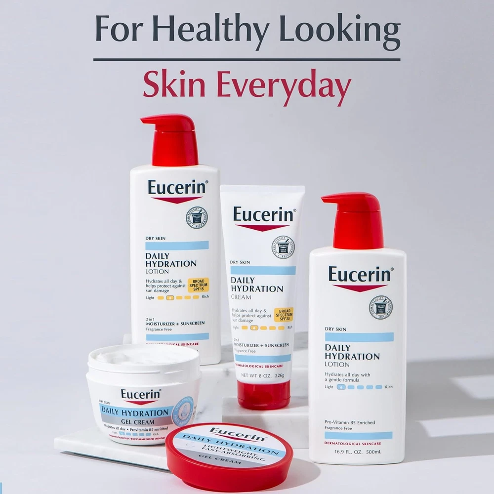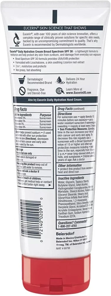 Eucerin Daily Hydration Broad Spectrum SPF 30 Sunscreen Body Cream for Dry Skin, Fragrance Free Sunscreen Moisturizer, 8 Oz Tube Product Details Is Discontinued By Manufacturer : No Product Dimensions : 3.07 x 1.97 x 8.03 inches; 9.44 ounces Manufacturer : Beiersdorf, Inc. Country of Origin : Mexico Brand: Eucerin Item Volume: 236.5 Milliliters Item dimensions L x W x H: 3.07 x 1.97 x 8.03 inches Age Range (Description): Adult, Kid Special Feature: Lightweight 2-in-1 Formula: This Eucerin body cream is a 2-in-1 formula that moisturizes dry skin while helping protect from sun exposure UV Protection: Daily Hydration body moisturizer with SPF 30 Broad Spectrum UVA/UVB protection helps defend against sunburn and long-term skin damage when used as directed Enriched Moisturizing Sunscreen: This Eucerin cream is enriched with Sunflower Oil and Pro-Vitamin B5, and is fast absorbing and non-greasy Sensitive Skin Safe: Eucerin Daily Hydration fragrance free sunscreen is dye free and is safe for sensitive skin, perfect as a very dry skin cream Includes one (1) 8 ounce tube of Eucerin Daily Hydration Broad Spectrum SPF 30 Sunscreen Body Cream, 2-in-1 Sunscreen Moisturizer Eucerin Daily Hydration Cream SPF 30 provides 24-hour moisture to dry skin while protecting it from sunburn and long-term skin damage with Broad Spectrum UVA/UVB protection. UV light is the main cause of sun-induced skin damage and a major risk factor for most skin cancers. This fast-absorbing sunscreen moisturizer for dry skin is non-greasy, and is enriched with Pro-Vitamin B5 and Sunflower Oil. This Eucerin body cream for dry skin is a lightweight 2-in-1 moisturizer and Broad Spectrum sunscreen that is fragrance free and dye free, and the sunscreen SPF 30 is safe for sensitive skin. This body moisturizer SPF is perfect for those looking for a dry skin body sunscreen that helps protect skin from sunburn and long-term skin damage when used as directed. For sunscreen use, apply this Eucerin sunscreen cream liberally 15 minutes before sun exposure. Use a water resistant sunscreen if swimming or sweating. Reapply at least every 2 hours. Eucerin is a dermatologist-recommended skincare brand that is based on an uncompromising approach to science. With skin care products designed to restore and sustain healthy-looking skin, families everywhere look to Eucerin to enhance outer beauty and self-confidence.