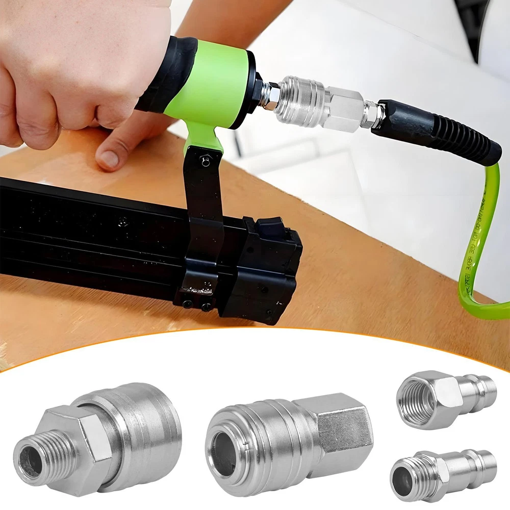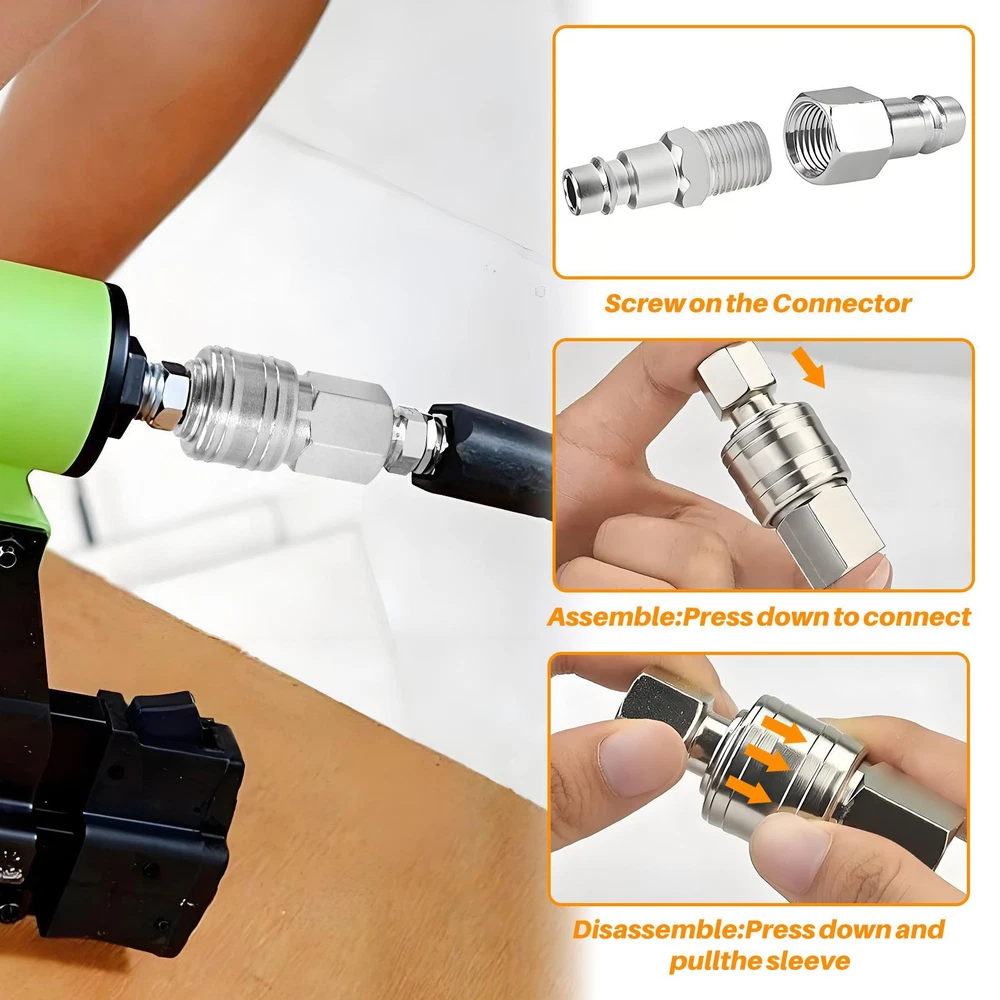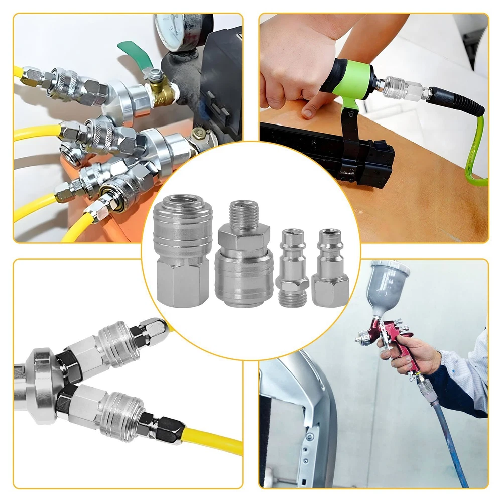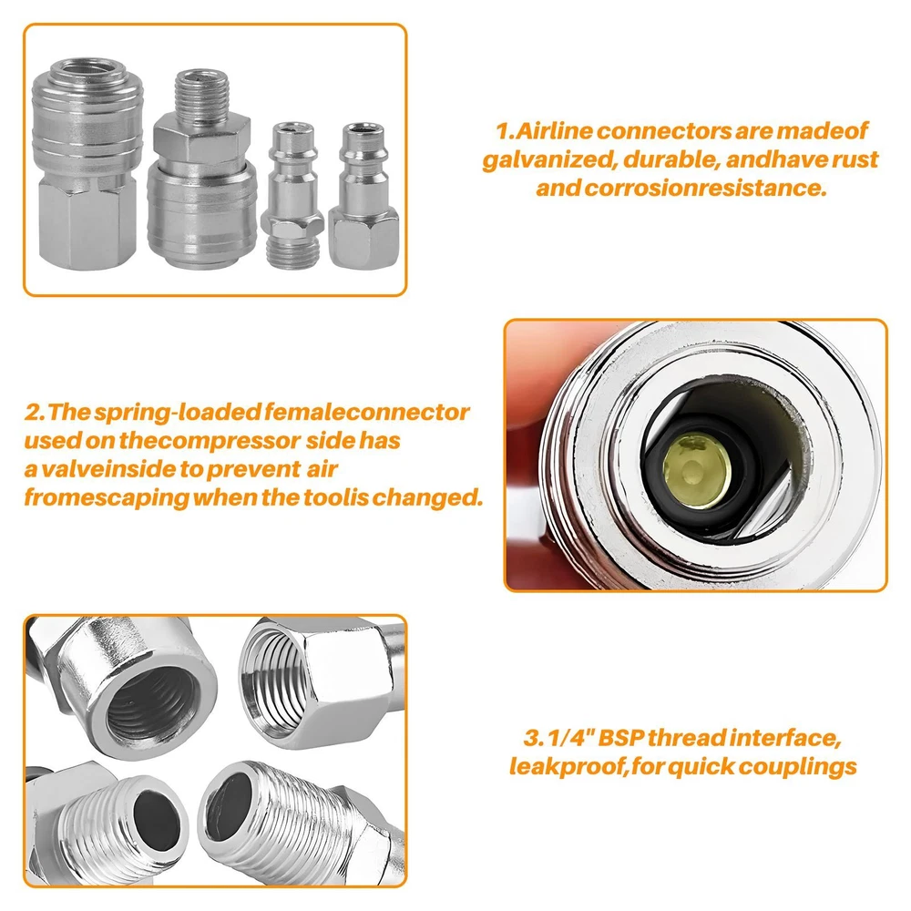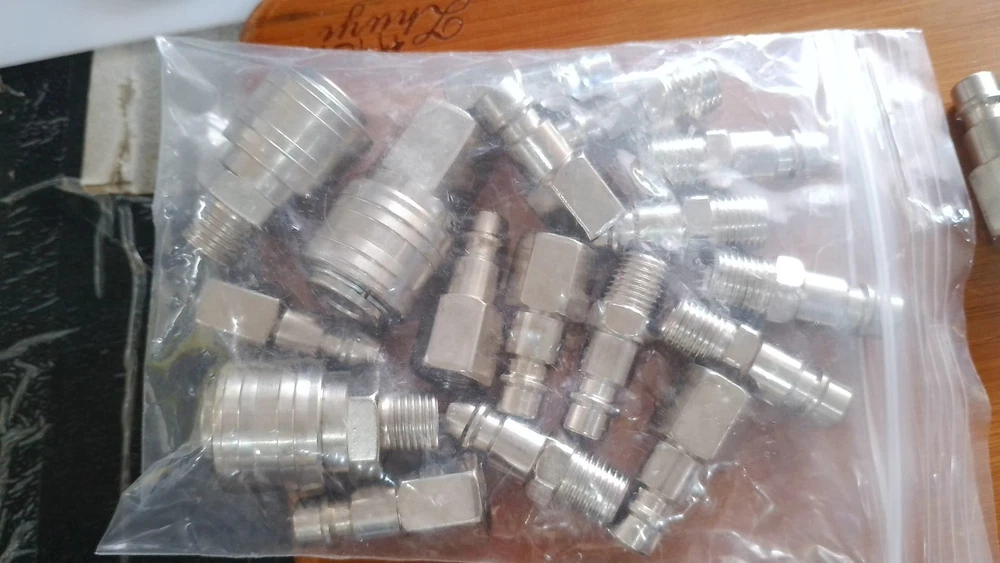 product Store Home Shipping Payment Warranty and Guarantee Other Policies Item Description 20 Pcs Euro Air Line Hose 1/4" Fitting Connectors Male Female Quick Release The Air Hose Couplings Can be Used for Pneumatic Tools, Air Compressors, Air Nail Guns, Air Guns, Hight Pressure Cleaners, Air hoses, etc. Enables tools and airlines to be quickly connected / disconnected. Reduces accidental airline disconnection. Specifications: Size: 1/4'' Material: Nickel Plated ( Corrosion Resistant) A3 Iron ( Strength & Durability) Main Colour: Sliver Type: Air Line Fitting, Air Compressor 20 Pcs in the Package Quick Release Easy to Operate Instructions: Assemble: 1. Screw on the Connector 2. Press Down to Connect Disassemble: 1. Press Down and Pull the Sleeve Package included: 8 x 1/4" BSP Female Thread 8 x 1/4" BSP Male Thread 2 x 1/4" BSP Fitting with Female Thread 2 x 1/4" BSP Fitting with Male Thread Item Pictures More Shipping 1.We ship to worldwide,except Hong Kong,Taiwan,Macao,China,Guemsey,Puerto Rico and we do not ship to APO/FPO, etc. 2.Item will be shipped within 3 business day on payment received. 3.Items are shipped from China using Airmail,reach most of countries within 10-20 business days. 4.sDelivery time depends on destination and other factors,it may takes up to 20 business days. Payment 1.We accept Paypal only. 2.All major credit cards are accepted through secure payment processor PayPal. 3.Payment must be received with 7 days of auction closing 4.If you have bought multiple items from us,you can send us one payment for all the items instead of paying for them individually. When you click the Pay Now button,eBay will automatically determine if there are other items you have won of purchased from us and will combine them for your review. Warranty and Guarantee 1.One year warranty!30 days money back!Buy with confidence! 2.If you are not satisfied when you receive your item,please return it within 30 days for a replacement or money back.Please contact us before you return the item. 3.If item is defective in 3 months,we will send you a replacement without extra charger,or offer refund after we receive the defective item. 4.If item is defective after 3 months,you can still send it back to us.We will send you a new one after after receiving the defective item,but you have to pay the extra shipping fee. Other Policies 1.We are not responsible for any custom duty or import tax. 2.We will leave Positive Feedback after receiving the payment.Please contact us if you are not satisfied with the item after receiving it. 3.All emails will be answered within 1 business day.If you do not receive our reply,please kindly re-sent your email and we will reply you as soon as possible. 4.Serious Buyer Only!Please place bid only if you agree with all the terms.