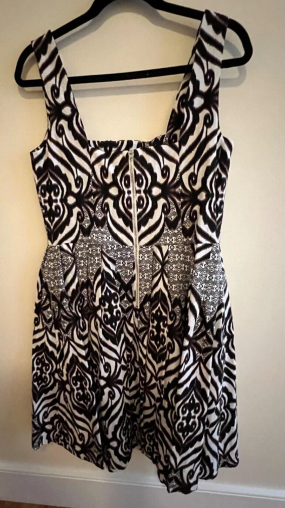 This stunning Eva Mendes dress is a must-have for any fashion-forward woman. The unique ethnic design in black, brown, and white, along with the square neckline and sleeveless fit, make it perfect for a variety of occasions, from travel to business to parties. The dress is made from a comfortable and breathable blend of cotton and woven linen, and it features a zipper closure and pockets for added convenience. The knee-length dress has a fit and flare style that is flattering on any body type, and it comes in size 10. The dress is machine washable and easy to care for, making it a practical addition to any wardrobe. Whether you're dressing up or down, this dress is sure to turn heads and make you feel confident and stylish.