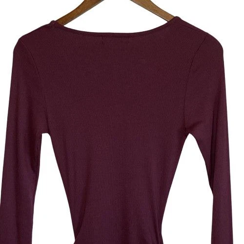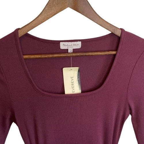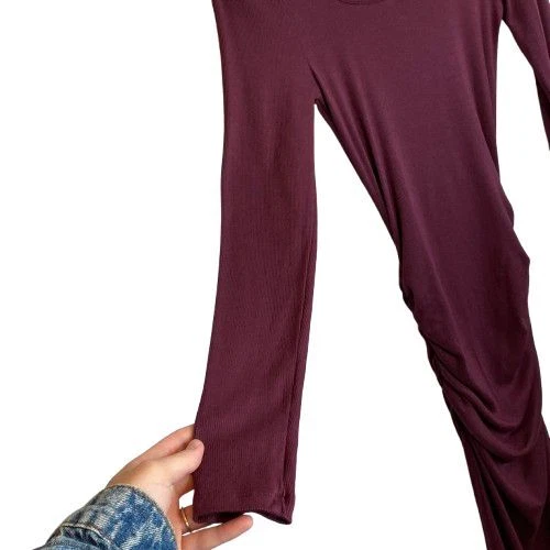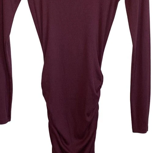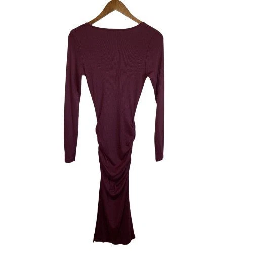 New With Tags Elevate your evening look with this stunning burgundy bodycon dress. Perfect for cocktail parties, date nights, or formal events. The ruched design flatters your curves, while the rich color exudes sophistication. Pair with statement jewelry and heels for a head-turning ensemble that's sure to impress. Pullover style Square neckline Long sleeves Fitted Ruched Midi length Left side slit Soft, comfy tee shirt feel Stretch Made in USA Original retail - $108 48% cotton, 48% modal, 4% spandex Machine washable Style profile - date night, cocktail party, evening, night out, flirty Approximate flat lay measurements: Shoulder to bottom hem length - 46" Pit to pit width - 14" Please compare measurements to something you already own to verify size and fit We are happy to answer any questions! We ship the next business day!