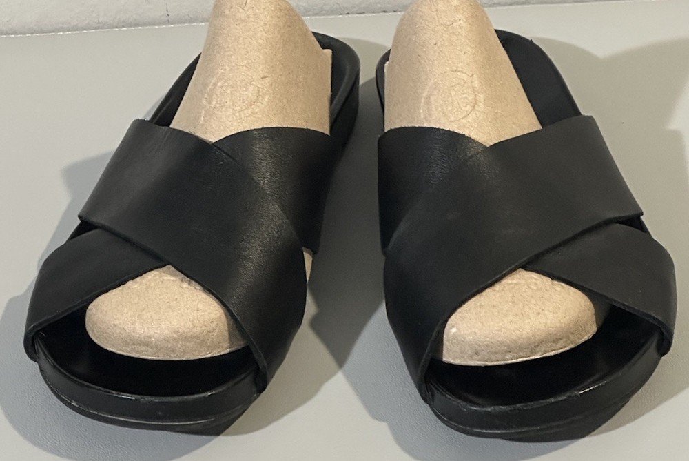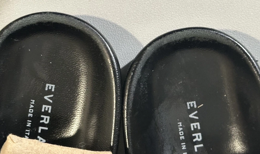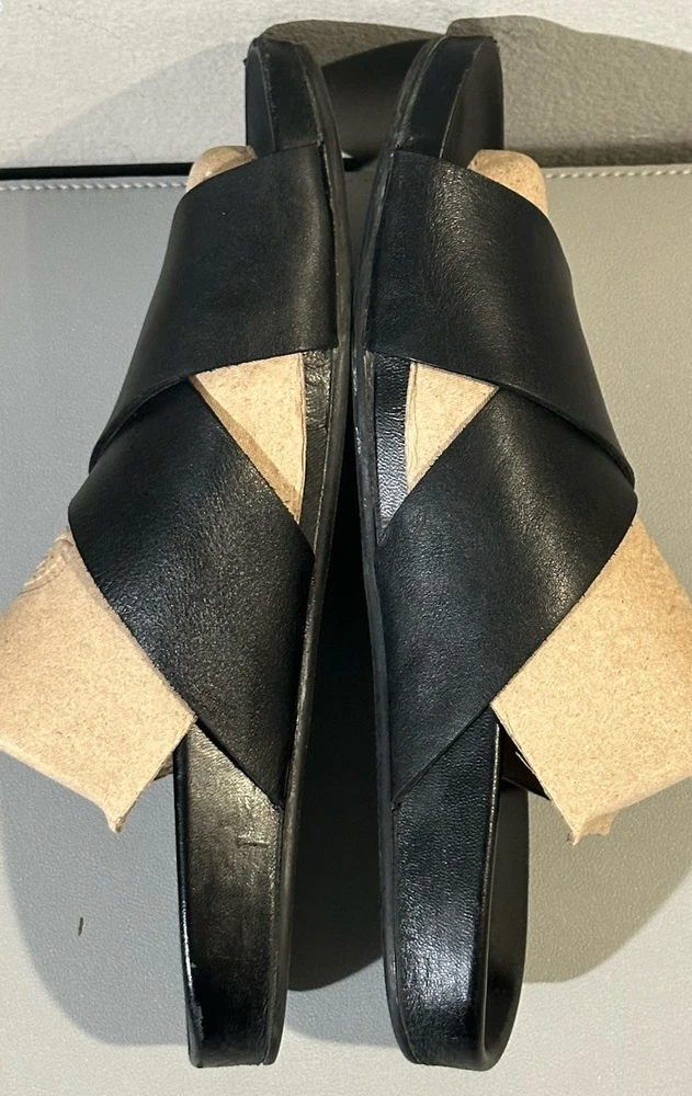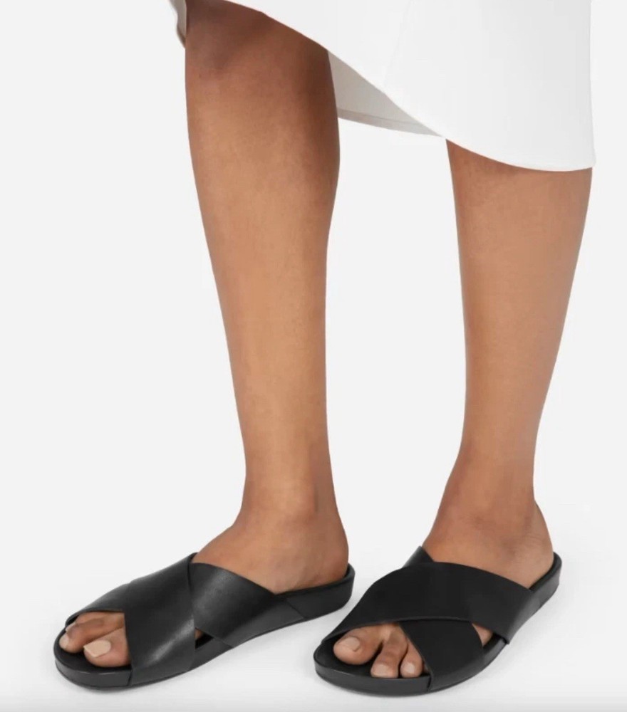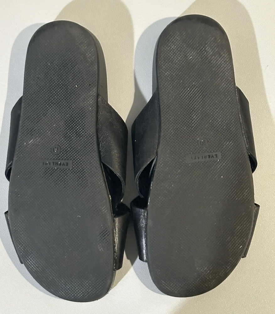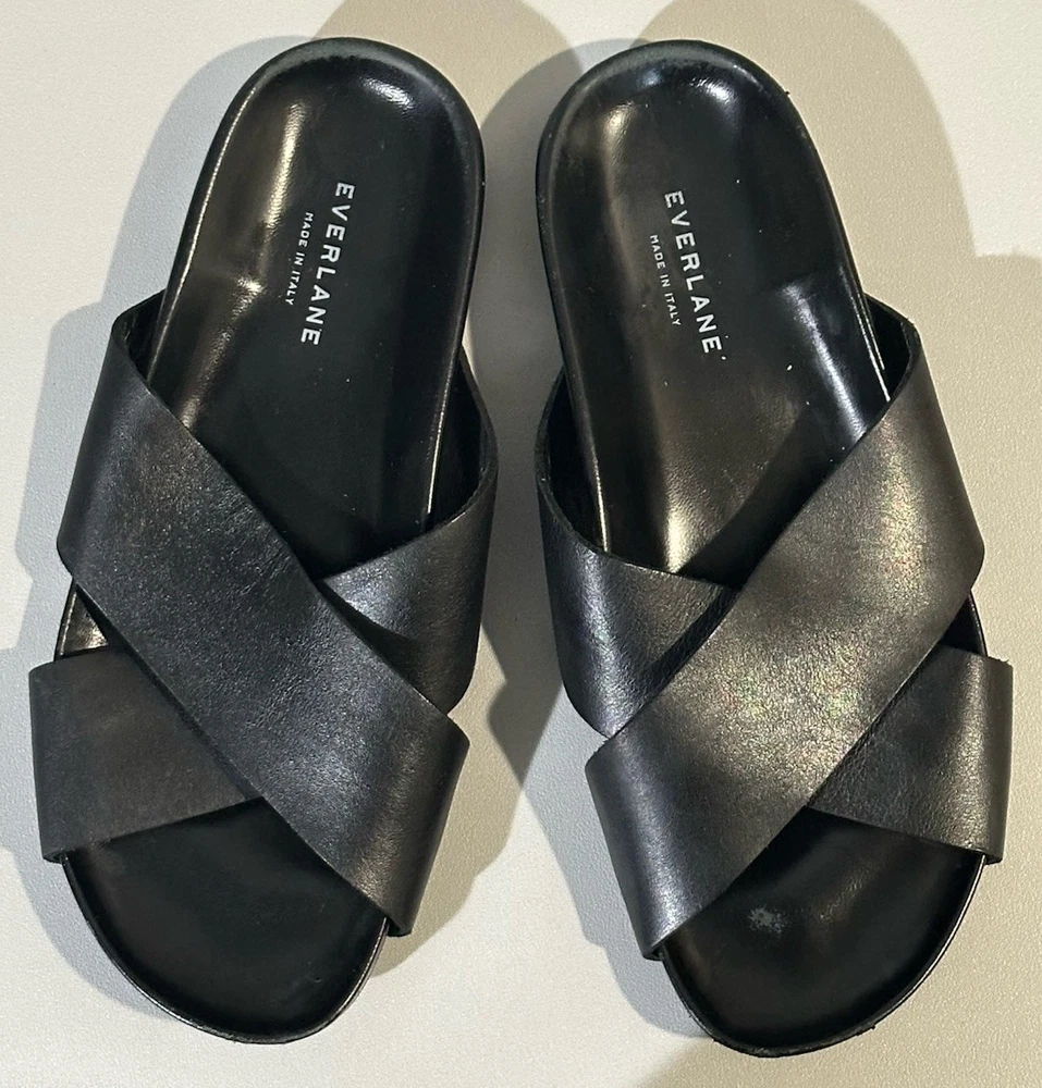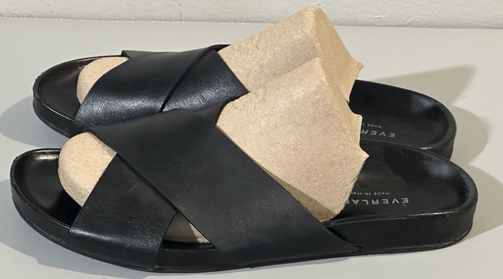 With sign of imperfections see pictures. Sold as is. The Everlane Women's Black The Form Crossover Sandal in size 10 is a minimalist and modern slip-on sandal perfect for casual occasions. Made of leather and featuring a flat heel, this sandal offers comfort and style. The solid black color and classic design make it a versatile option for the summer and spring seasons. Its vintage feel and Everlane brand add a touch of luxury to your wardrobe.