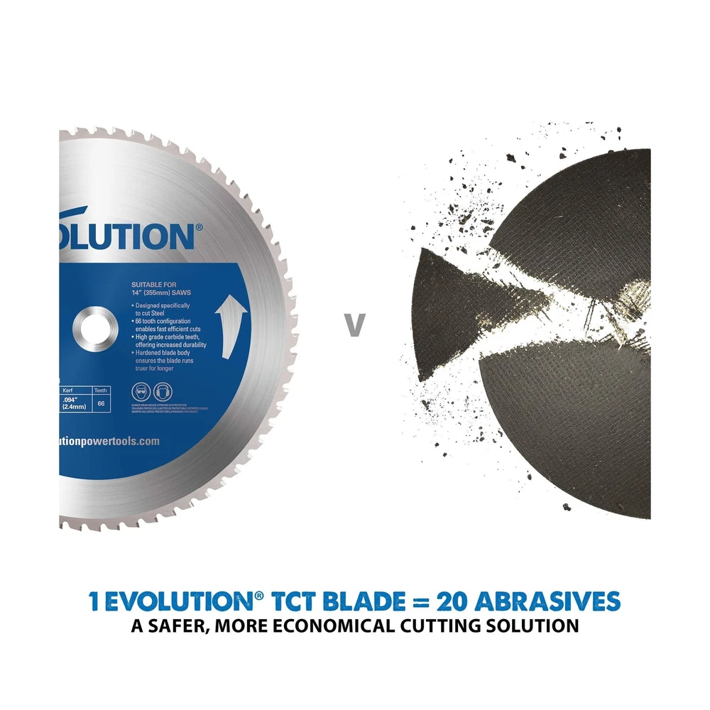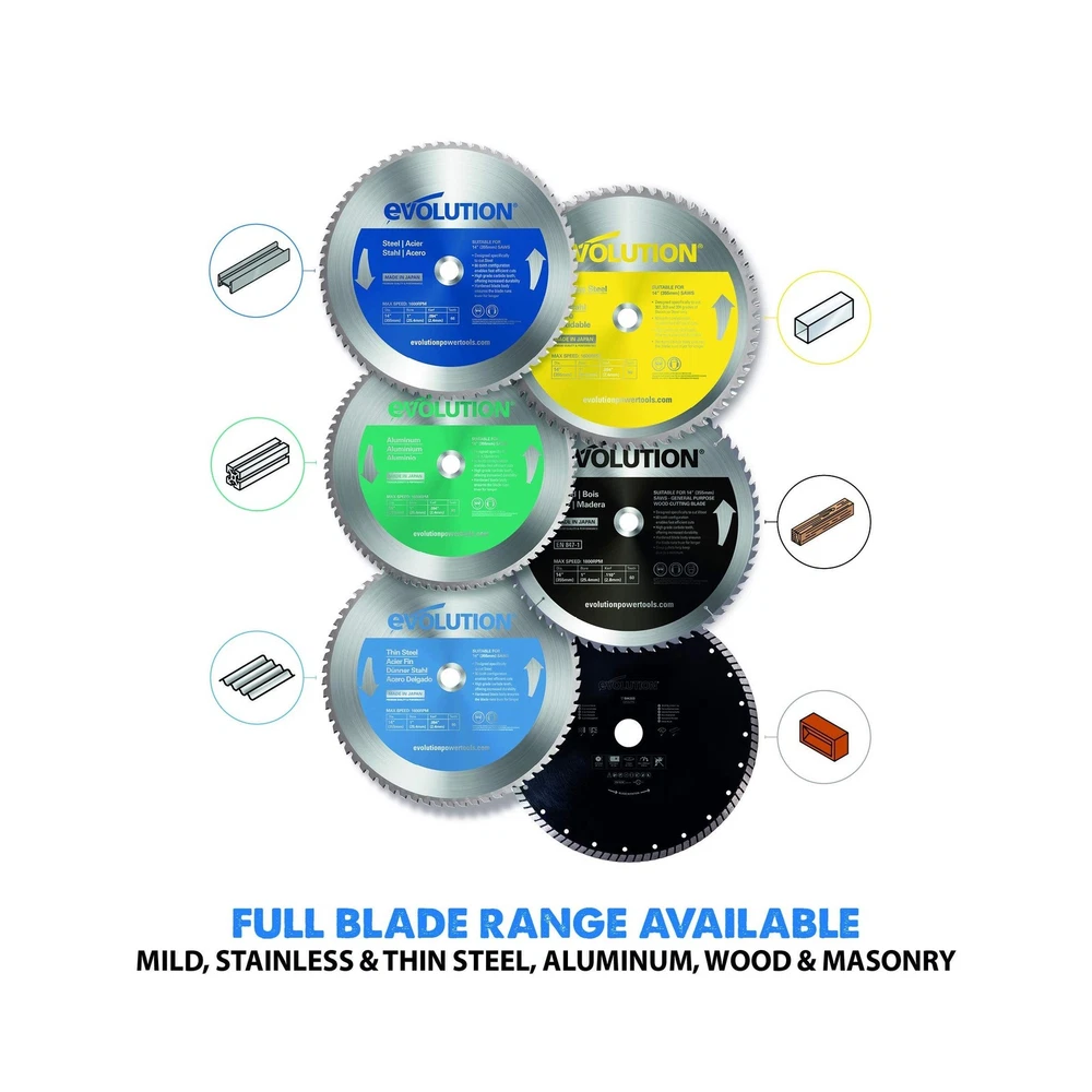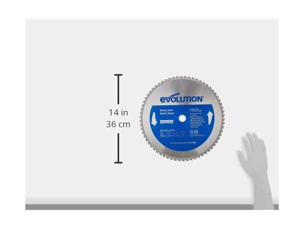 Evolution Power Tools 14BLADEST Blade for Cutting Mild Steel, For Circular and Chop Saws, No Heat, No Burrs & Virtually No Sparks, Carbide-Tipped TCT Blade For Cold Metal Cutting,14-Inch x 66-Tooth Description Designed for cutting mild steel, Evolution metal cutting blades use dry cut technology, cutting with very little heat and few burrs. Features: 14BLADEST: 14 inch mild steel saw blade with 66 teeth for chop saws (*Designed to cut mild steel only, do not use this blade for galvanized, hardened, or high-carbon steel) MILD STEEL CUTTING BLADE: Evolution's unique blades are designed for cutting mild steel and ferrous metal - Made from high-quality Japanese carbide and heat-treated for added durability NO HEAT, NO BURRS & VIRTUALLY NO SPARKS: Our TCT blades allow you to touch the finished cut within moments of cutting, unlike other blades that make the material too hot to touch, Evolution blades produce virtually no sparks LONG BLADE LIFE: Premium Tungsten Carbide Teeth (TCT) ensure maximum longevity and durability, hardened steel body minimises vibration, thin kerf design for accurate cuts and extended tool life FULL RANGE OF BLADES AVAILABLE: Evolution Power Tools offers a range of specialist blades for cutting different materials: stainless steel, mild steel and thin steel, aluminum, wood, masonry and a multi-material cutting blade 1600 RPM 66 Carbide Teeth, .094-Inch Kerf 1-Inch Arbor Size Product Details: Brand: EVOLUTION Product Dimensions: 14"L x 14"W Color: Blue Number of Teeth: 66 Style: Mild Steel Item Thickness: 2.4 Millimeters Item Weight: 16 ounces UPC Global Trade Identification Number: 27 Brand: EVOLUTION Product Dimensions: 14"L x 14"W Color: Blue Number of Teeth: 66 Style: Mild Steel Item Thickness: 2.4 Millimeters Item Weight: 16 ounces UPC: 849713011527 Global Trade Identification Number: 27 Item Weight: 1 pounds Department: Unisex Adult Manufacturer: Evolution Power Tools Item model number: 14BLADEST Is Discontinued By Manufacturer: No Date First Available: January 21, 2009 Delivery We Do Not Ship Outside of the Continental US. Return Policy All items qualify for returns within 30 days of receipt. Seller is responsible for return shipping on any item that is not damaged. Feedback We take our reputation seriously, we buy and sell online, so we understand the value of trust. If you are unsatisfied with your order, please contact us and we will work with you to resolve it to your satisfaction.