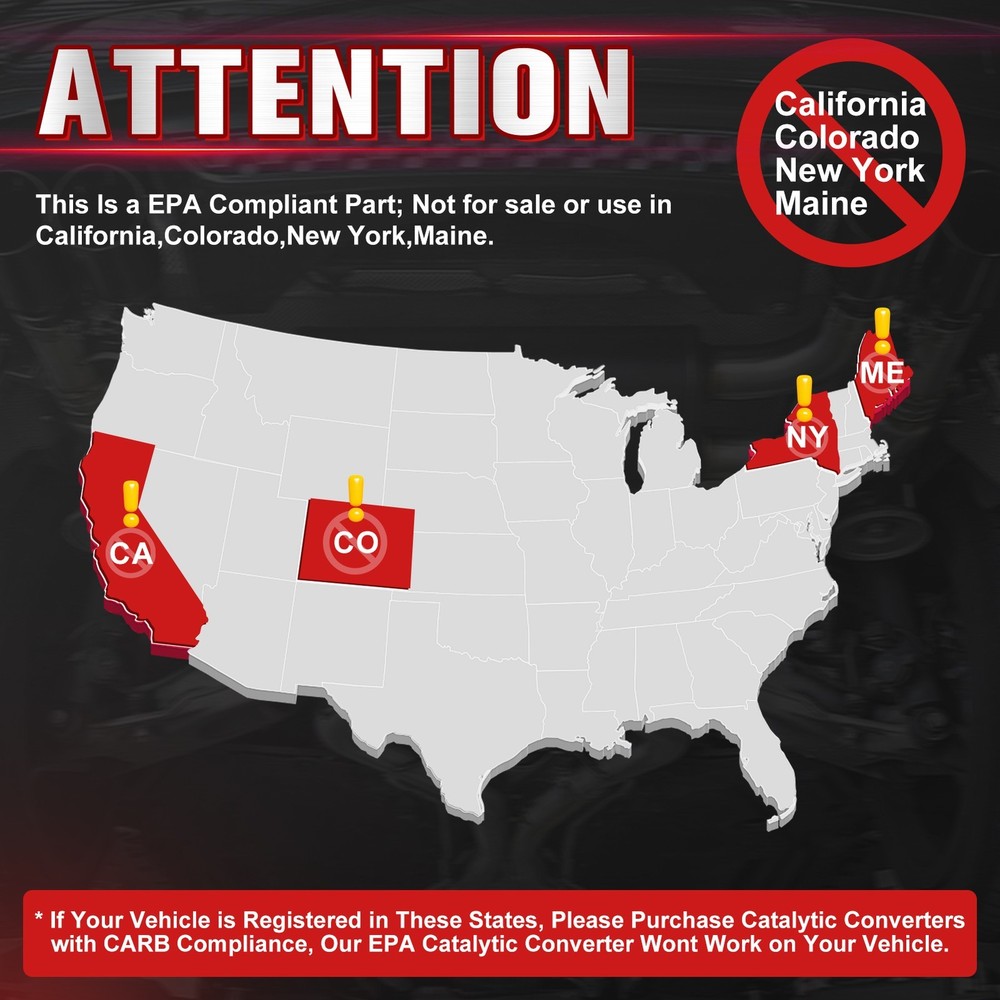 Specification: Type: Catalytic Converter Placement on Vehicle: Front Labels & Certifications: EPA Body Material: Stainless Steel Substrate Material: Ceramic Inlet Type: 5-bolt welded flange Outlet Type: 3-bolt welded flange Fitment Type: Direct Replacement Part Number: 12498616, 16593, 18258, 40800 58278, 641302, 674-933, 72594, 753006 327-50268, 327-50639, 140E2ZX31E, 140E2JA02E Fitment: For 2007-2012 Nissan Altima L4 2.5L For 2013 Nissan Altima S Coupe 2-Door L4 2.5L For 2013 Vehicles, Only Fits S Coupe 2-Door L4 2.5L models Package Included: 1x Catalytic Converter Note: Not legal for sale in California, New York, Colorado & Maine! If your vehicle is registered in California, New York, Colorado & Maine, do not purchase this part. If your vehicle meets California requirements, but is not registered in California, New York, Colorado & Maine, this converter will work on your vehicle.