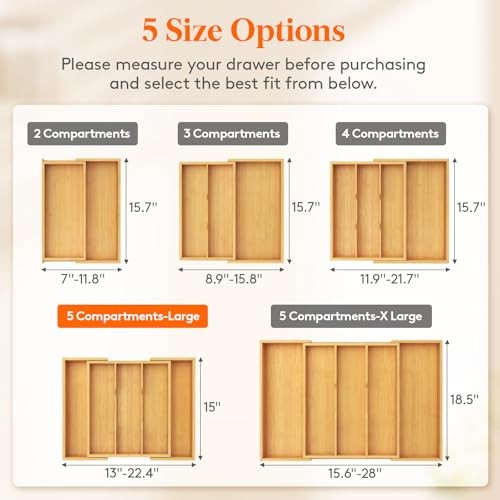 Return Policy Fast Delivery Trusted seller Utensil Organizer for Kitchen Drawer, Expandable Cooking Utensil Tray, Bamboo Cutlery Silverware Flatware Holder, Adjustable Spatula Tools and Gadgets Storage Divider, Large, Natural Product Description Perfect Organizer: This silverware organizer is designed to keep your utensils in perfect order. With a height of 2 inches, it features 3 large compartments (13.4" D x 3.5" W) and 2 expandable slots on the sides (14" D x 4.7" W). This provides ample space to store most of your cooking tools such as knives, long-handled spoons, tongs, cutlery sets, and whisks, saving you time searching for the right utensil. Expandable Design: This kitchen drawer organizer can be expanded from 3 to 5 slots, providing additional storage space for your utensils. It is designed to fit different drawer sizes, with a width range of 13 - 22.4 inches. When folded, it measures 13" x 15" x 2", but can expand up to 22.4" x 15" x 2" to create ample space for storing and separating your utensils. Humanized Design: The drawer dividers feature well-designed grooves that allow you to easily retrieve your cutlery, no more digging through messy drawers or struggling to find the right tools for your cooking needs. At the same time our cutlery drawer organizer is very easy to clean, just wipe it gently and it will be like new. Elegant and Sturdy: The smooth surface is not only beautiful, adding a touch of warmth and elegance to your kitchen decoration, but also has a sturdy structure, resistant to scratches and damage, say goodbye to fragile and Easily damaged storage boxes meet the reliability of our cutlery boxes. Efficient and Versatile: This multifunctional drawer organizer is perfect for any room drawer in your home. Not only can you use this drawer organizer to organize your kitchen tools, but it's also a great storage solution for a variety of small items. From tools to stationery, cosmetics to daily essentials, this versatile organizer can hold a wide range of items, keeping everything within reach and neatly organized. Shipping Returns Payment Shipping Shipping is FREE to all addresses other than APO/PO boxes in the lower 48 states. All our stock ships from US-based warehouses. Shipped via USPS or UPS (depending on location and package weight) Unless stated otherwise, all orders will ship within 24-72 hours of your payment being processed. Check our feedback to see the great reviews of FAST shipping we offer. Returns Seller does not accept returns Payment We currently accept payment via eBay managed payments only. Once payment is cleared, we will dispatch your shipment within 1-3 business days. Please refer to the "Shipping" tab for more information regarding shipping speed to your destination.