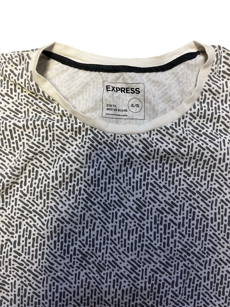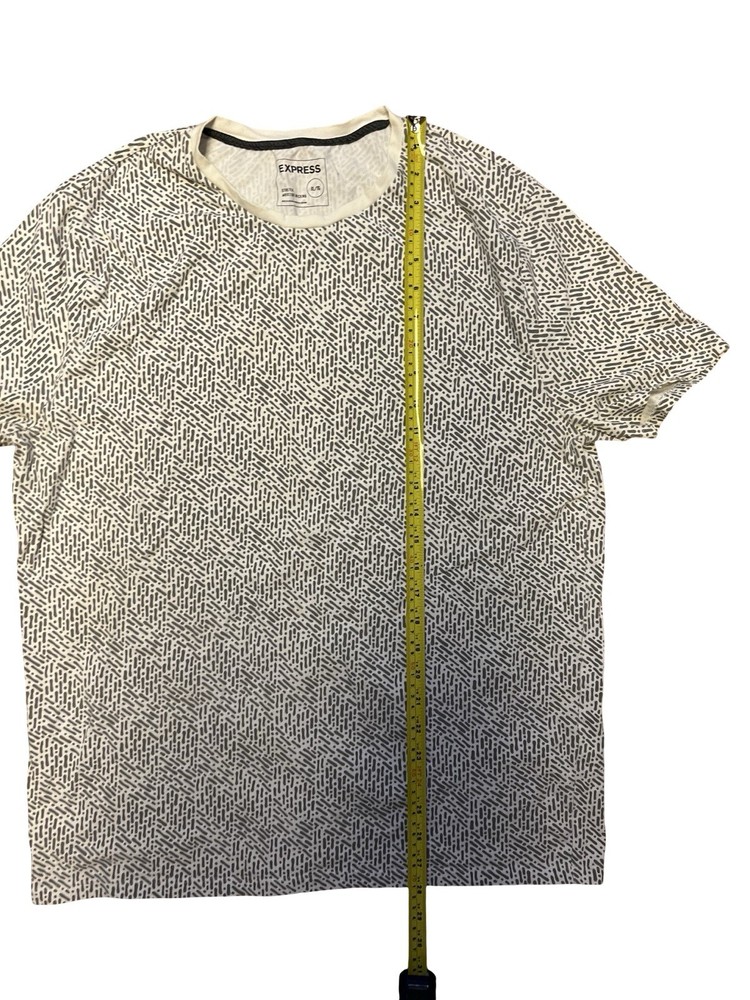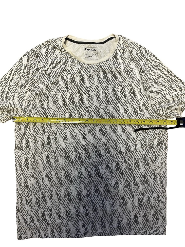 The Express Men's Graphic T-Shirt in black and white with an abstract pattern is a stylish and comfortable option for men looking for a unique addition to their wardrobe. Made with stretch fabric, this XL size shirt is designed to provide a comfortable and flexible fit. The colorful theme adds a contemporary touch to the classic black and white color scheme, making it a versatile piece that can be dressed up or down for any occasion.