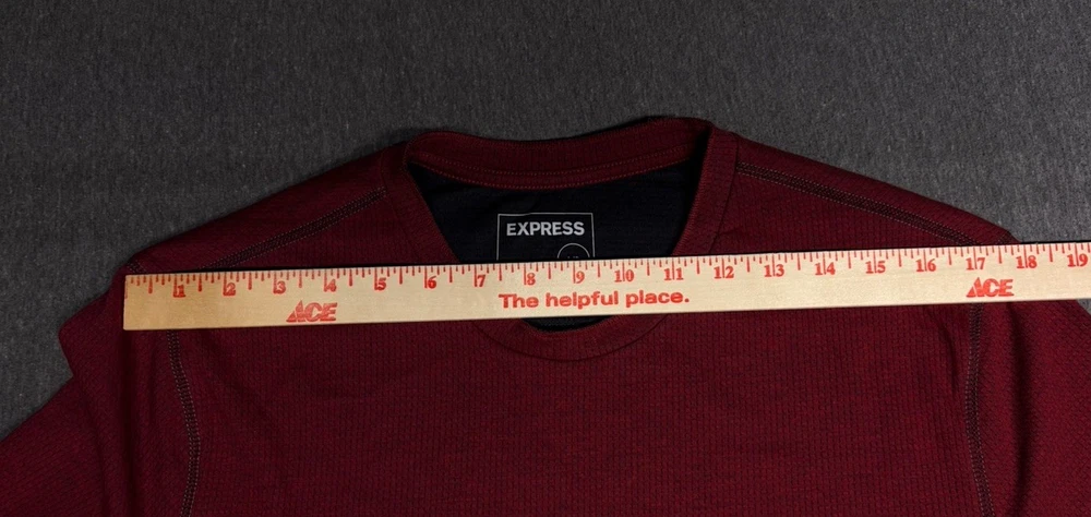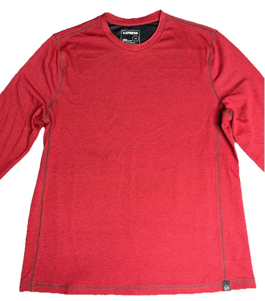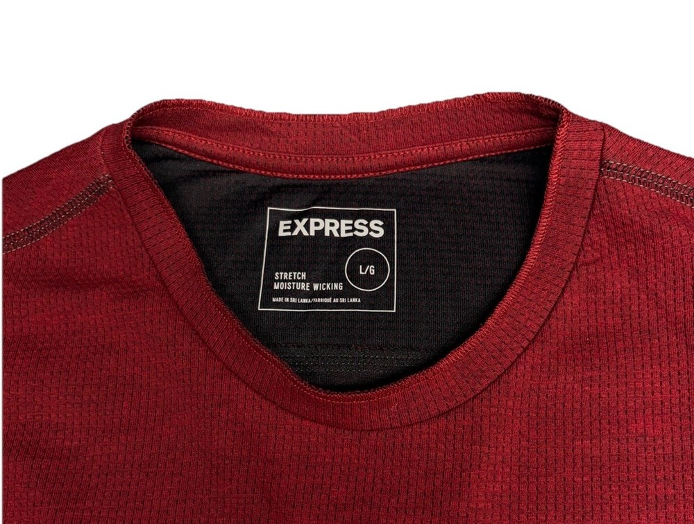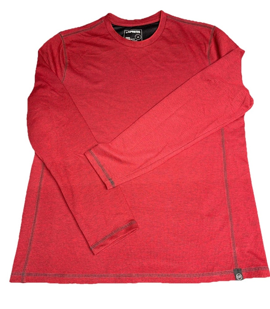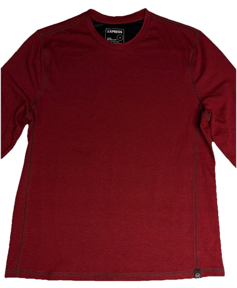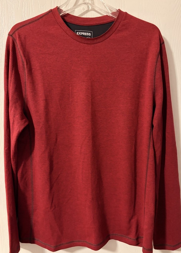 The product is an Express Men’s Long Sleeve Shirt in Burgundy, Size Large. It features a crew neckline and is designed for moisture-wicking performance. The shirt is in a rich red color and is perfect for men looking for a stylish and comfortable option for everyday wear. The long sleeves provide added coverage and warmth, making it a versatile choice for various occasions.