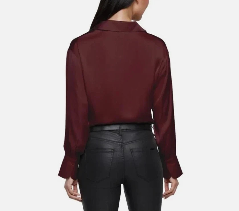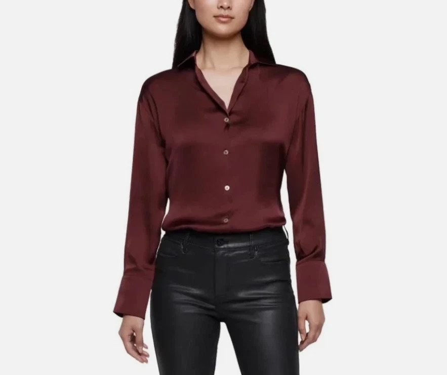 Express Women's Button Down V-Neck Long Sleeves Satin Shirt Size: Large Color: Dark Red Content: 100% Polyester