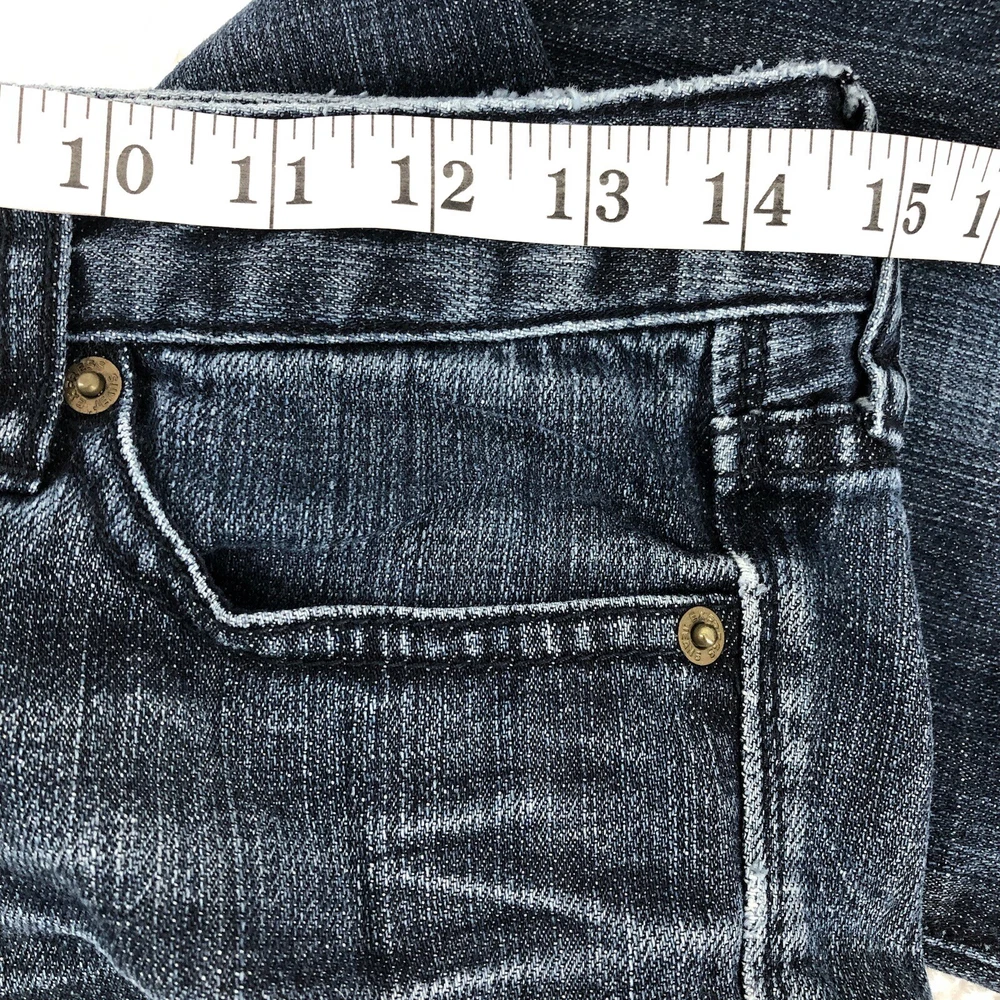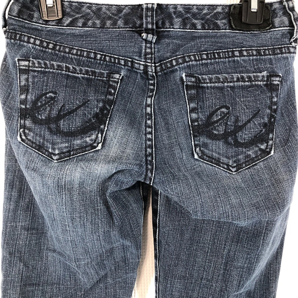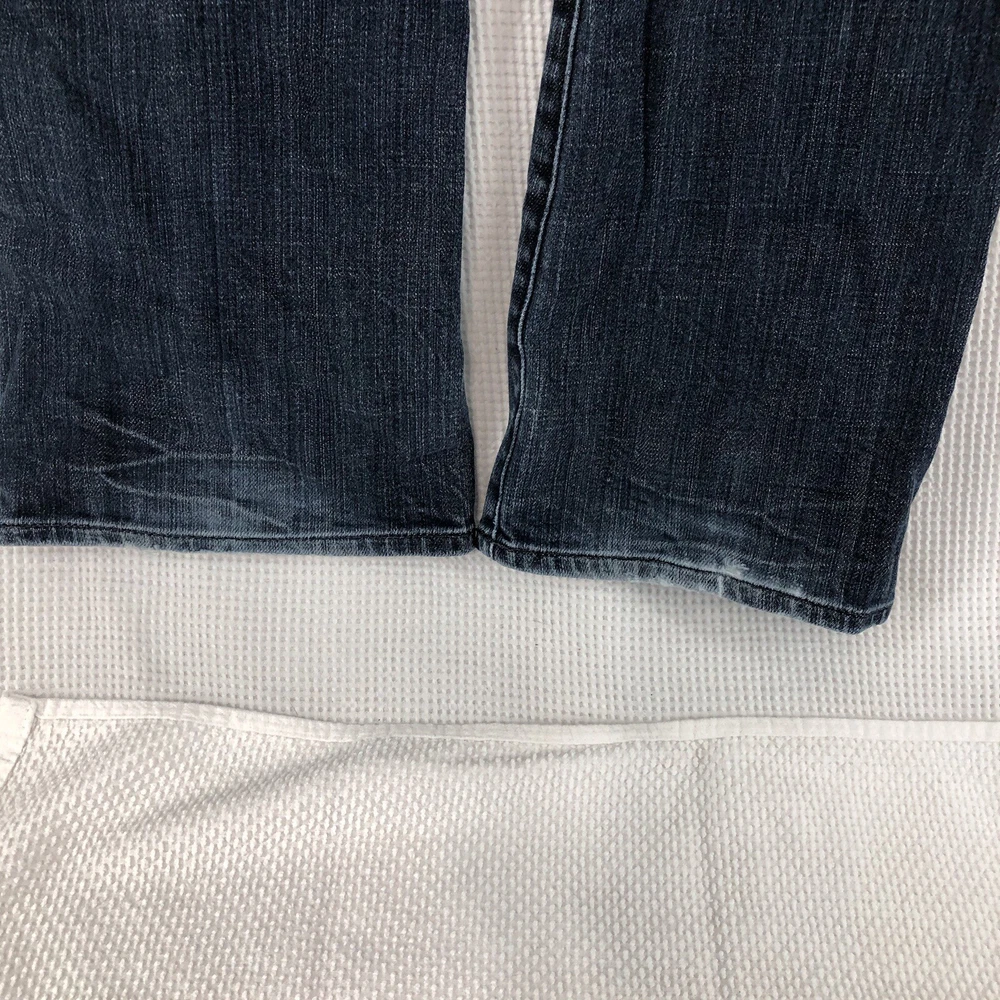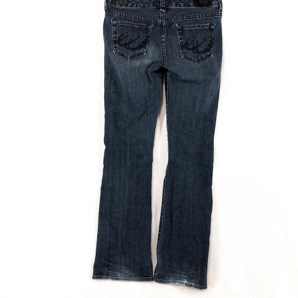 Elevate your denim collection with these Express bootcut jeans for women. The dark wash and solid pattern of these jeans make them a versatile addition to your wardrobe. The denim fabric with a touch of stretch provides comfort and ease of movement, while the button, zipper, and logo accents add a touch of style. These jeans are perfect for any casual occasion and can be paired with a variety of tops and shoes.