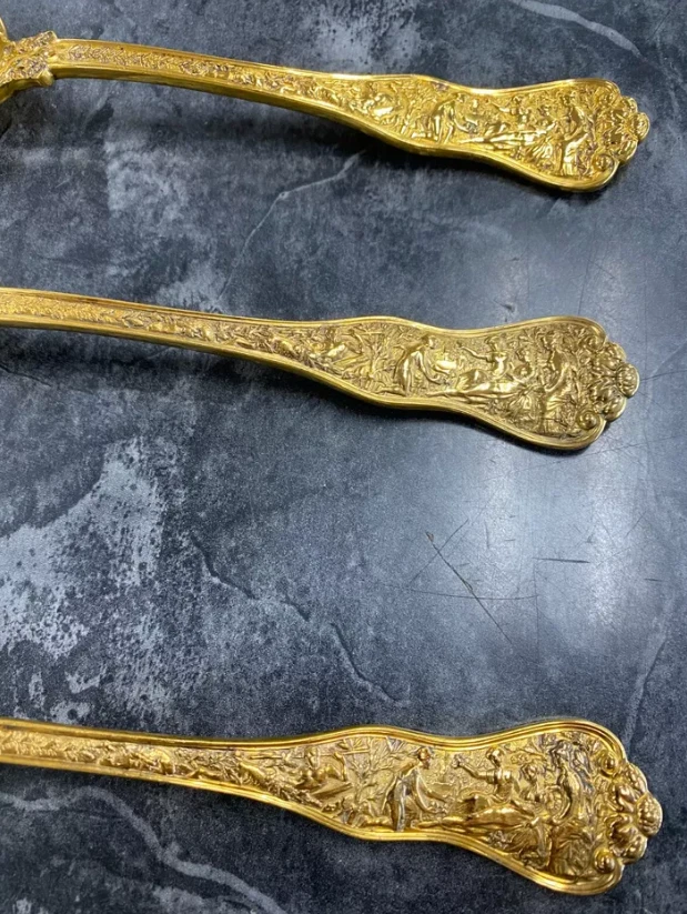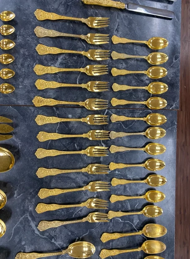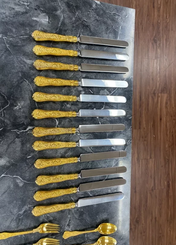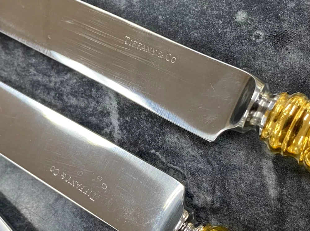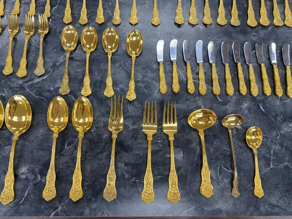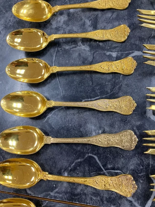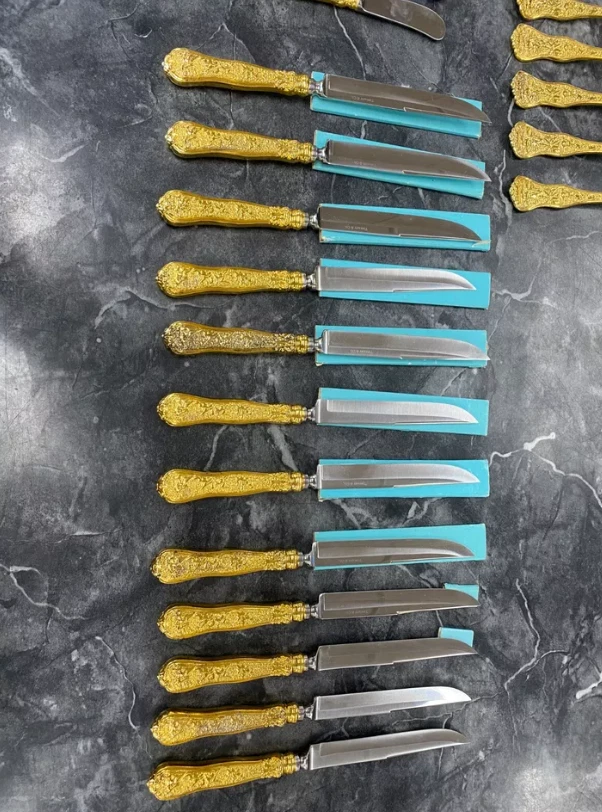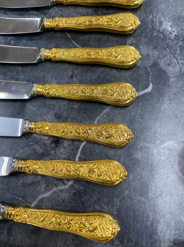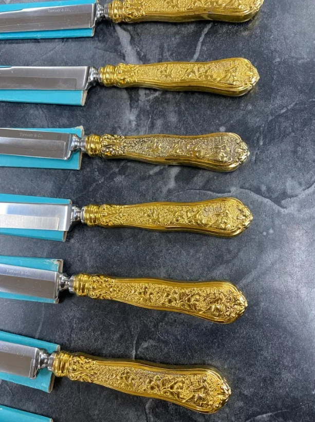 Here is a very impressive 109-piece flatware setting from Tiffany & Co., in the highly regarded "Olympian" pattern. This outstanding set, made from gold vermeil over solid sterling silver (.925), is dated 1878 and weighs 7,328.87 grams (235.6 troy ounces). It is presented in a plain wood flattare storage box and remains monogram-free, ensuring its condition is pristine. **Set Includes:** - **12 Place Spoons** - Length: 6 inches - Weight: 45.5 grams each - **6 Dessert Oval Soup Spoons** - Length: 7 inches - Weight: 82.96 grams each - **4 Large Jelly Spoons** - Length: 7 1/4 inches - Weight: 83.0 grams each - **2 Serving Tablespoons** - Length: 8 5/8 inches - Weight: 117.23 grams each - **2 Solid Serving Spoons** - Length: 9 inches - Weight: 151.0 grams each - **1 Solid Salad Serving Spoon** - Length: 10 inches - Weight: 154.15 grams - **1 Solid Salad Serving Fork** - Length: 10 inches - Weight: 147.76 grams - **1 Sugar Spoon** - Length: 5 7/8 inches - Weight: 52.79 grams - **12 Demitasse Spoons** - Length: 4 1/8 inches - Weight: 18.74 grams each - **1 Long Cream Ladle with Plain Round Bowl** - Length: 7 inches - Weight: 57.01 grams - **1 Solid Gravy Ladle** - Length: 7 3/8 inches - Weight: 126.45 grams - **13 Salad Forks** - Length: 6 3/4 inches - Weight: 62.18 grams each - **12 Dinner Forks** - Length: 8 inches - Weight: 104.58 grams each - **2 Solid Serving Forks** - Length: 8 1/2 inches - Weight: 107.74 grams each - **1 Large Pierced Cold Meat Serving Fork** - Length: 9 inches - Weight: 107.73 grams - **1 Pie/Cake Server (Stainless Steel Blade)** - Length: 10 3/4 inches - Weight: 116.23 grams - **1 Cheese Knife (Stainless Blade)** - Length: 7 1/8 inches - Weight: 51.66 grams - **12 Butter Spreaders (Stainless Steel Blade)** - Length: 6 inches - Weight: 35.72 grams each - **12 Steak Knives (Stainless Steel Blade)** - Length: 9 inches - Weight: 59.98 grams each - **12 Blunt Hollow Table Knives with Bolster (Stainless Steel Blade)** - Length: 10 3/8 inches - Weight: 79.23 grams each