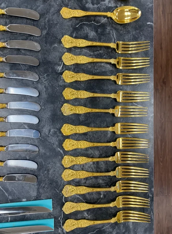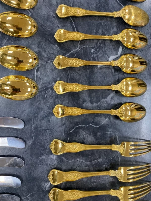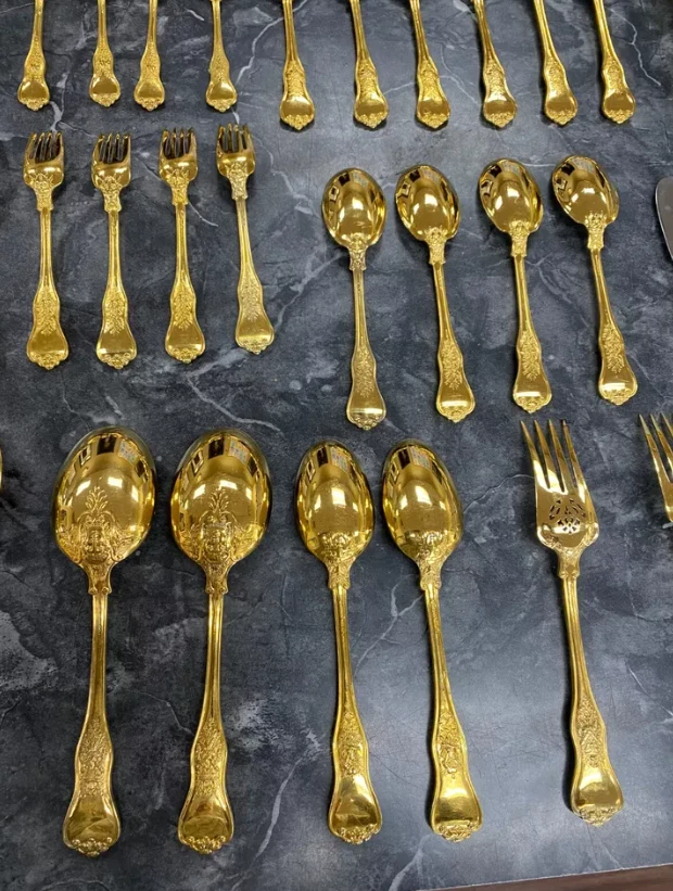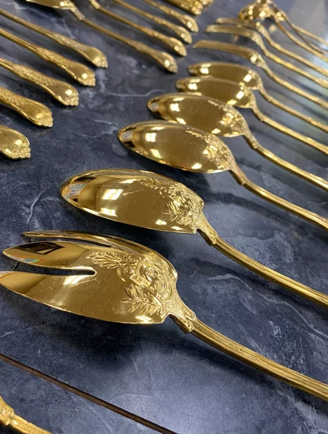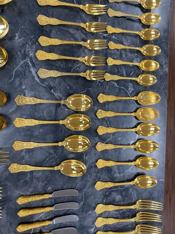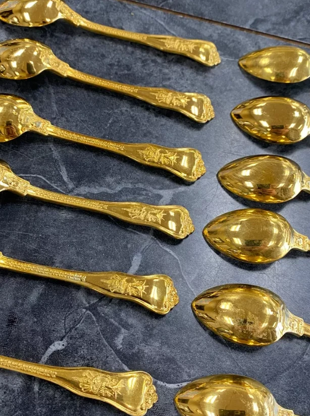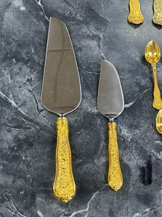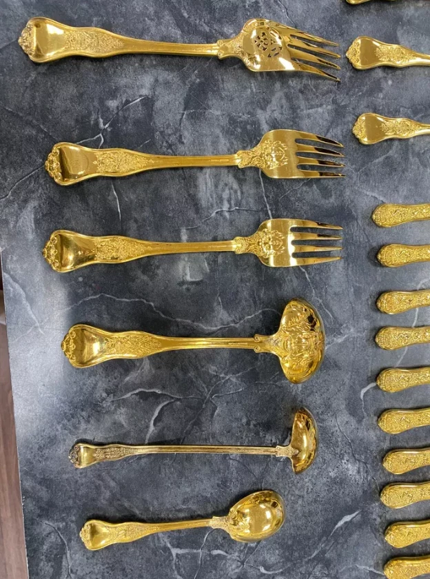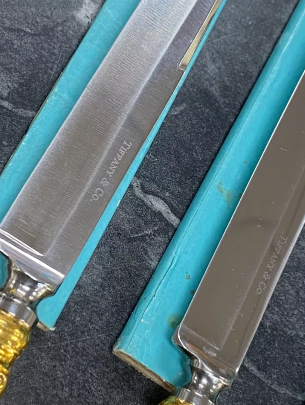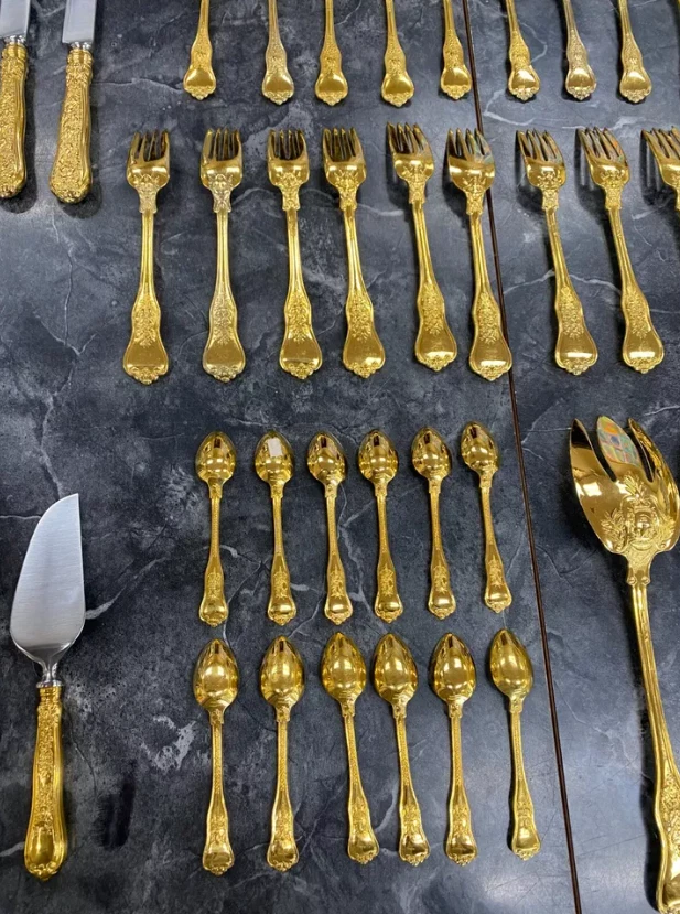 Here is a very impressive 109-piece flatware setting from Tiffany & Co., in the highly regarded "Olympian" pattern. This outstanding set, made from gold vermeil over solid sterling silver (.925), is dated 1878 and weighs 7,328.87 grams (235.6 troy ounces). It is presented in a plain wood flattare storage box and remains monogram-free, ensuring its condition is pristine. **Set Includes:** - **12 Place Spoons** - Length: 6 inches - Weight: 45.5 grams each - **6 Dessert Oval Soup Spoons** - Length: 7 inches - Weight: 82.96 grams each - **4 Large Jelly Spoons** - Length: 7 1/4 inches - Weight: 83.0 grams each - **2 Serving Tablespoons** - Length: 8 5/8 inches - Weight: 117.23 grams each - **2 Solid Serving Spoons** - Length: 9 inches - Weight: 151.0 grams each - **1 Solid Salad Serving Spoon** - Length: 10 inches - Weight: 154.15 grams - **1 Solid Salad Serving Fork** - Length: 10 inches - Weight: 147.76 grams - **1 Sugar Spoon** - Length: 5 7/8 inches - Weight: 52.79 grams - **12 Demitasse Spoons** - Length: 4 1/8 inches - Weight: 18.74 grams each - **1 Long Cream Ladle with Plain Round Bowl** - Length: 7 inches - Weight: 57.01 grams - **1 Solid Gravy Ladle** - Length: 7 3/8 inches - Weight: 126.45 grams - **13 Salad Forks** - Length: 6 3/4 inches - Weight: 62.18 grams each - **12 Dinner Forks** - Length: 8 inches - Weight: 104.58 grams each - **2 Solid Serving Forks** - Length: 8 1/2 inches - Weight: 107.74 grams each - **1 Large Pierced Cold Meat Serving Fork** - Length: 9 inches - Weight: 107.73 grams - **1 Pie/Cake Server (Stainless Steel Blade)** - Length: 10 3/4 inches - Weight: 116.23 grams - **1 Cheese Knife (Stainless Blade)** - Length: 7 1/8 inches - Weight: 51.66 grams - **12 Butter Spreaders (Stainless Steel Blade)** - Length: 6 inches - Weight: 35.72 grams each - **12 Steak Knives (Stainless Steel Blade)** - Length: 9 inches - Weight: 59.98 grams each - **12 Blunt Hollow Table Knives with Bolster (Stainless Steel Blade)** - Length: 10 3/8 inches - Weight: 79.23 grams each