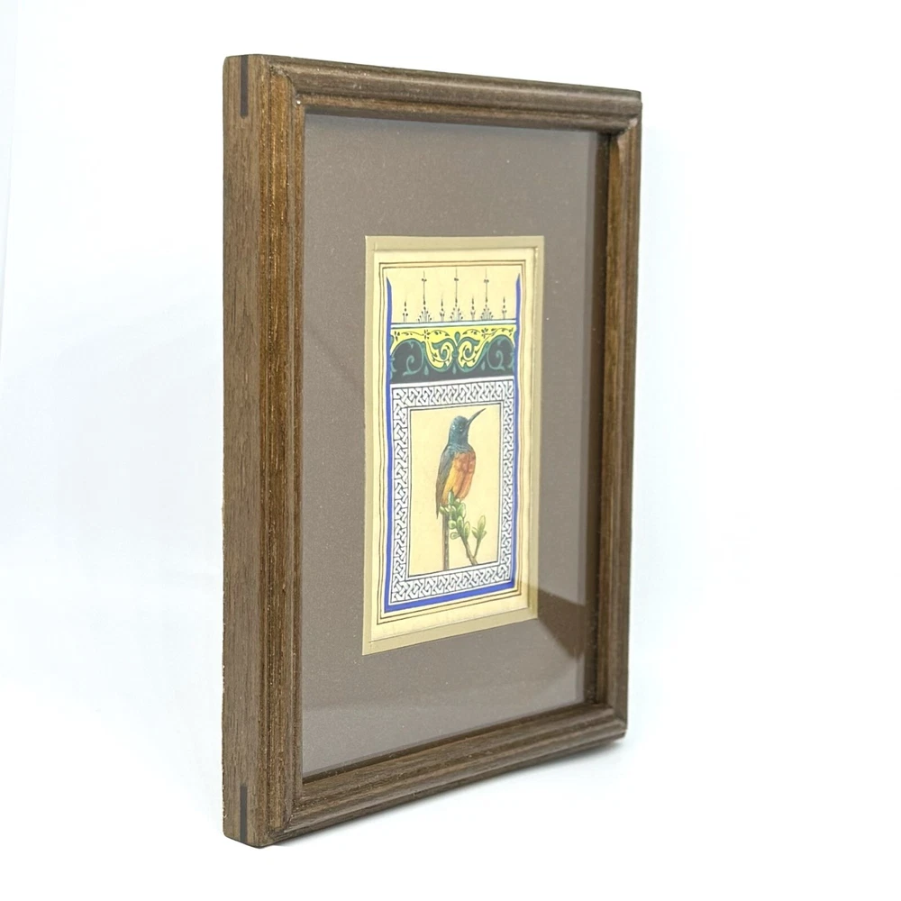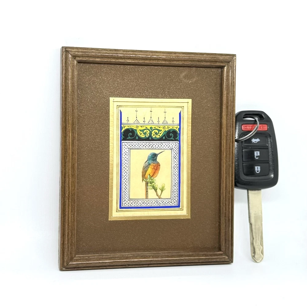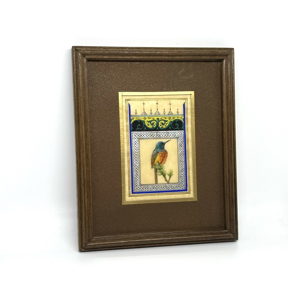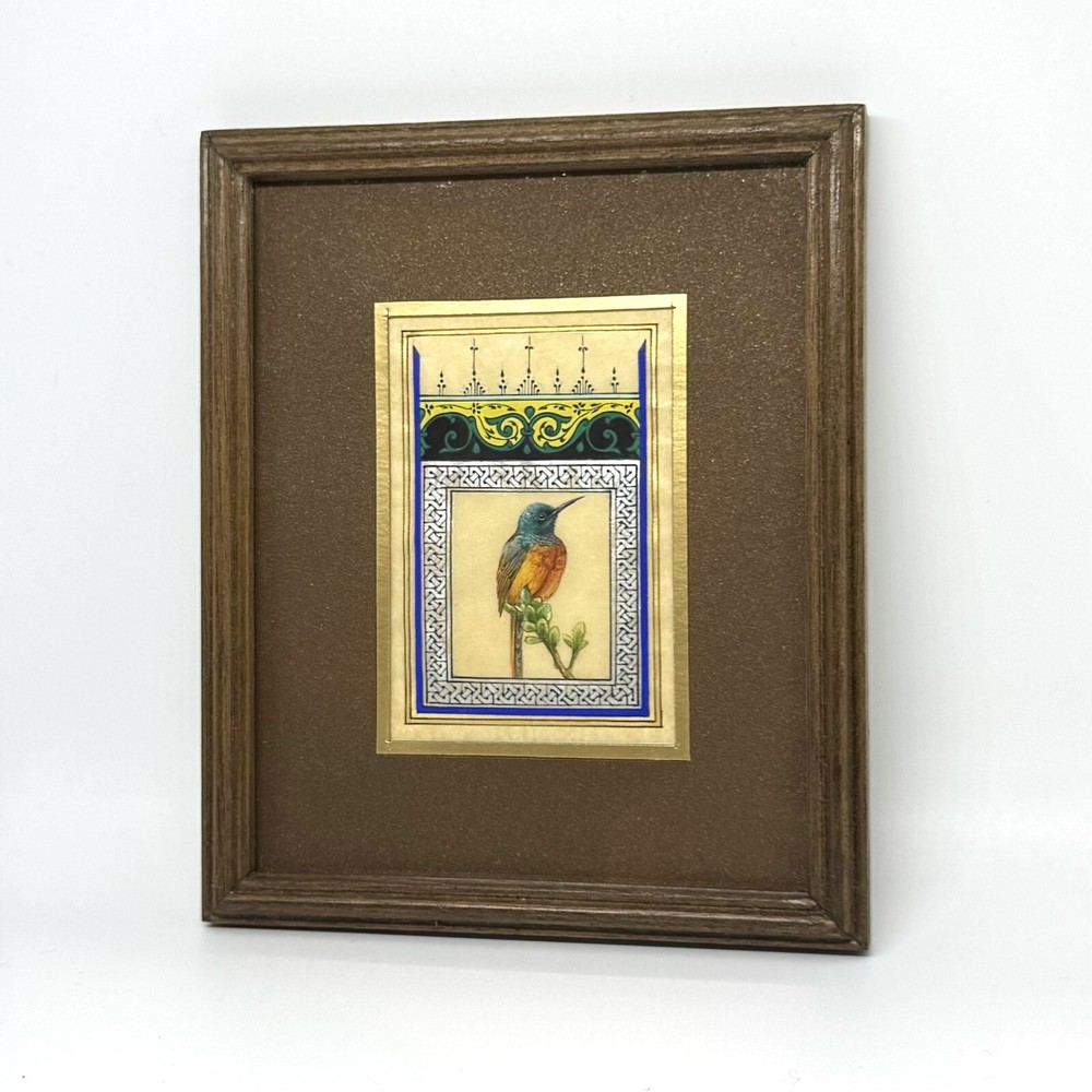 Framed Artwork: Tiny Bird Portrait ( Fine Walnut Frame, Protected with Glass, Hermetically Sealed ) An unparalleled masterpiece of miniature art, this framed portrait of a tiny bird is a testament to exceptional precision and timeless craftsmanship. Painted under a magnifying glass, the intricate details come alive through the use of a fine brush and a masterful combination of materials — including watercolor, gold leaf, gold gouache, acrylic, tempera, and liquid ink. Each element of this artwork is a harmonious fusion of nature’s beauty and ornamental design, brought to life on the finest silk paper. Encased in an elegant walnut frame, this piece is meticulously crafted to elevate any interior, exuding sophistication and artistic excellence. A true Collector’s Edition , this fine art painting embodies the spirit of luxury, rarity, and cultural richness. Ready to hang, it is perfect for collectors seeking to own a piece of extraordinary artistry. Brought to life by ARTBEHZODIYUS — where the spirit of timeless artistry and unrivaled craftsmanship unite. We also are pleased to offer a custom ( framing, sizes, colors, composition) made-to-order piece, so we encourage customers to contact us before any customizations. This ensures we provide an accurate timeline for completion and customize the piece to your preferences.