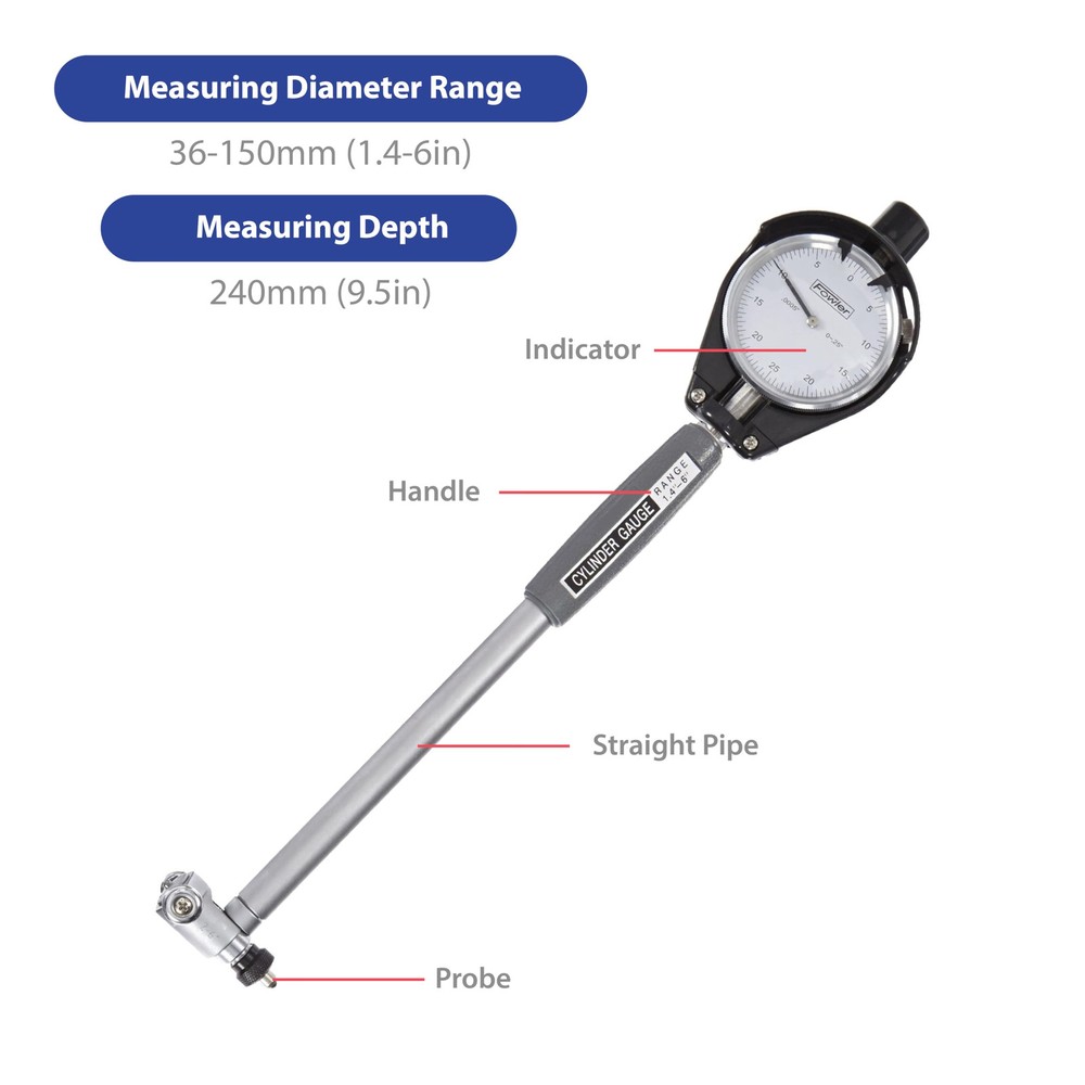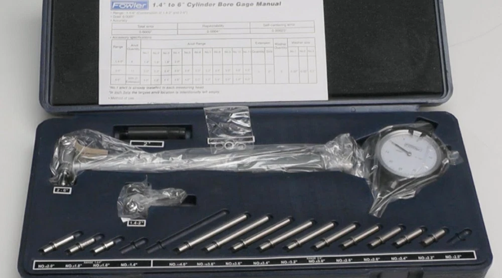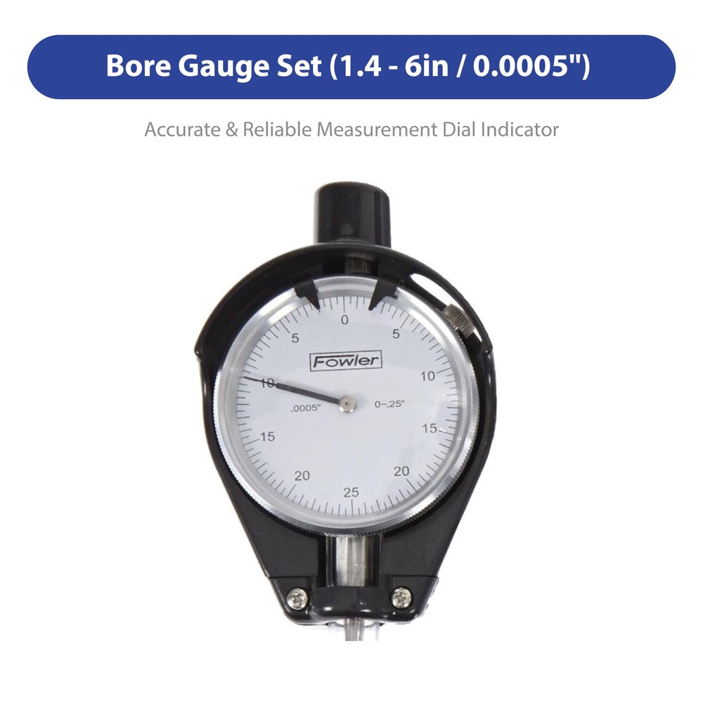 Cylinder Dial Bore Gage with carbide tipped anvils has a measurement range of 1.4 to 6 ". This product has a 1-year warranty offered by High Precision. Bore gages measure holes, or bores, in a workpiece. They can measure the interior diameter of a hole at any depth (within its reach), while internal micrometers can only measure to the depth of their contacts. Bore gages are typically calibrated with a setting ring and come in two types: simple and direct measuring. Simple bore gauges are used with a caliper to transfer the hole measurement, while the more complex gauges take the measurement directly and display it through a vernier, dial, or digital display. Bore gages have a two- or three-point contact, indicating how many points on the gage head touch the inside of the bore. Two-point contacts are better at measuring ovality, while three-point contacts are used to measure lobing or triangular form error. Pistol-grip bore gages are used for fast, single-handed operation with repeatable results from one operator to another. Bore gages can also be used in special applications, such as measuring threads, spline pitch diameters, and deep bores. , an American company, manufactures premium inspection and measurement instruments like electronic indicators, calipers, bore gages, and micrometers. The company, founded in 1946, is headquartered in Newton, MA. ACCURATE MEASUREMENTS: This bore gage features a dial indicator with a graduations of 0.0005" and a measuring depth of 9.5" EXTENDED RANGE: This 1.4-6" range bore gage, with a two-point contact system, is used for measuring hole diameters and also to detect geometry abnormalities such as ovality and taper; carbide-tipped anvil contact points provide extended wear and improved abrasion resistance SELF CENTERING: The easily adjustable bore gauge is self-centering for fast, accurate measurements EASY AND EFFICIENT: This bore gage comes with an insulated grip and a chrome plated handle for easy use. SET INCLUDES: Set comes with two self-centering measuring heads, an extension holder, spacers, and a fitted case