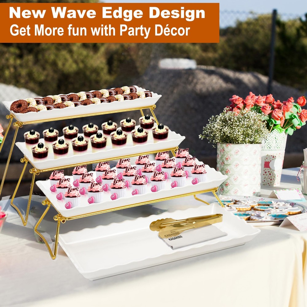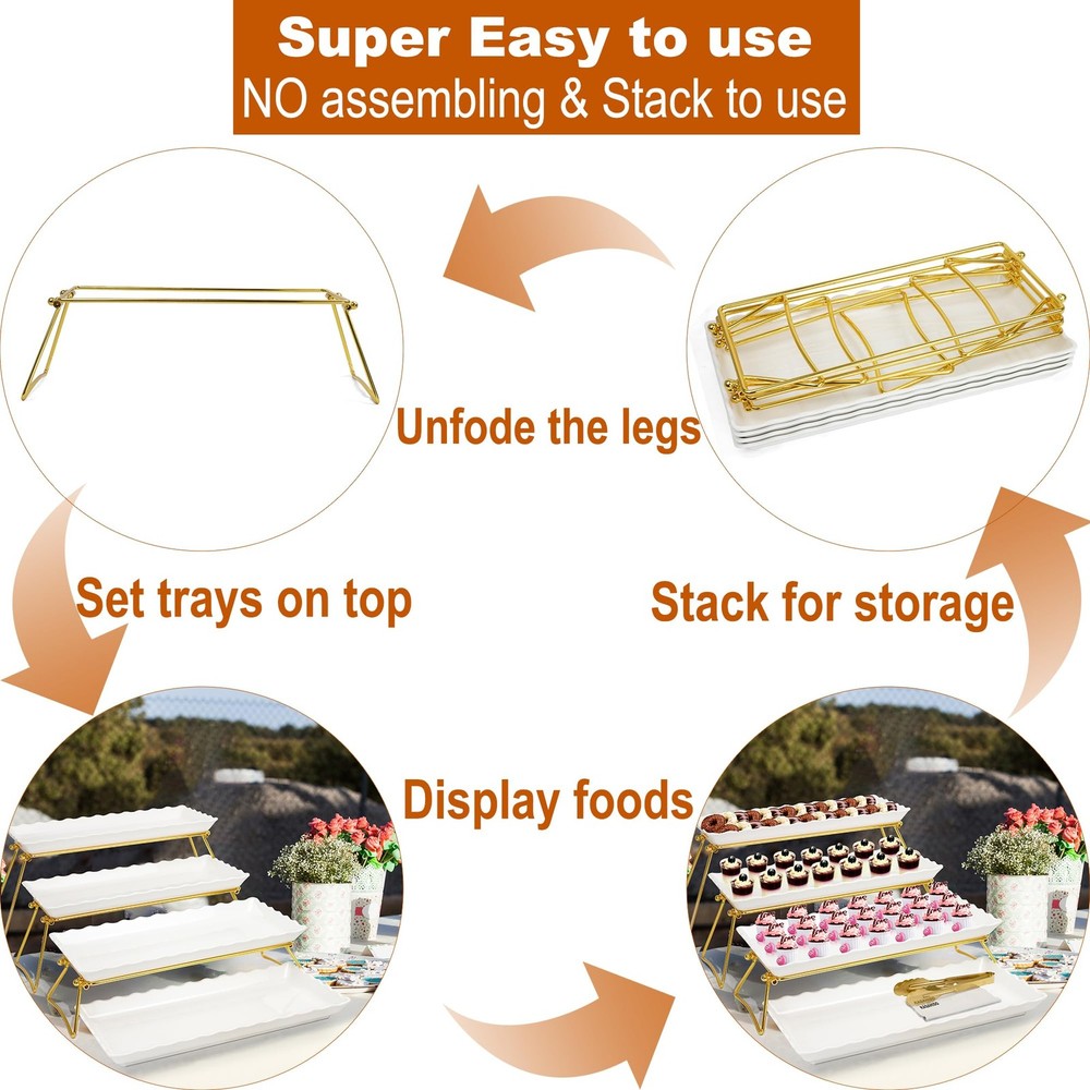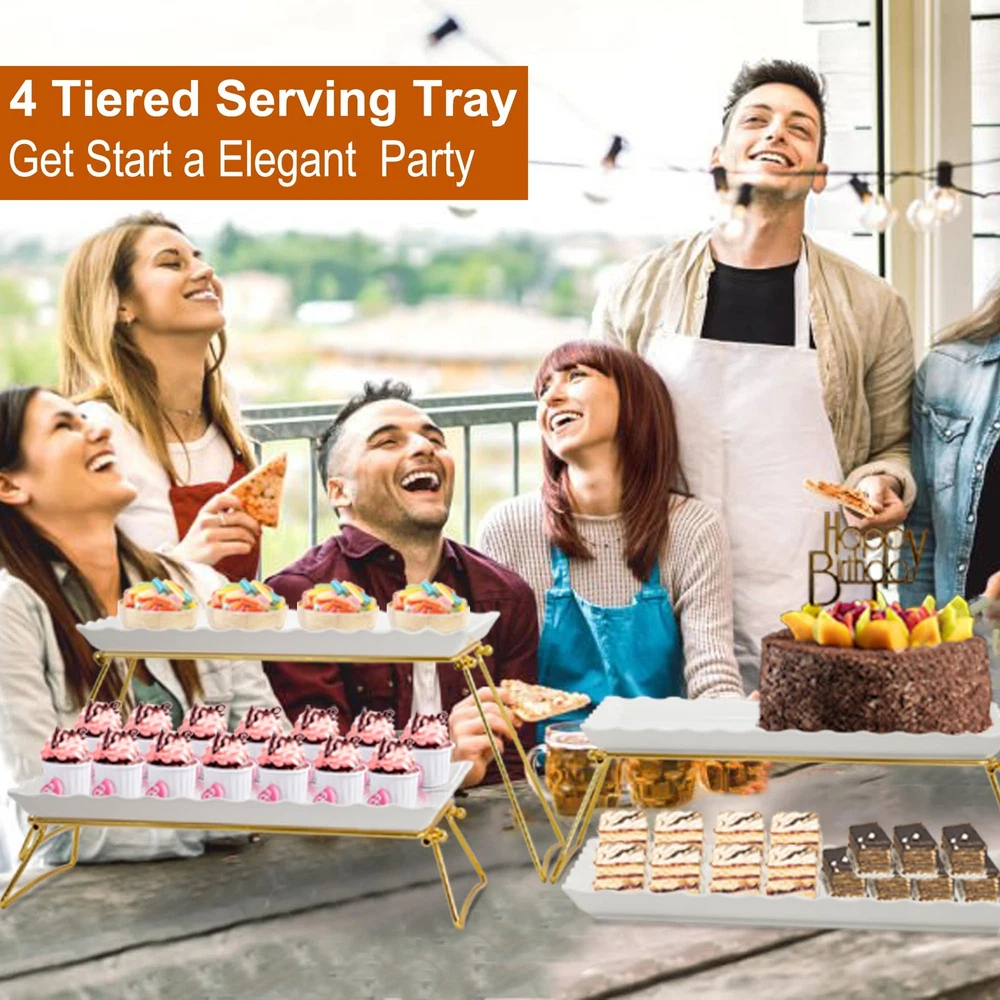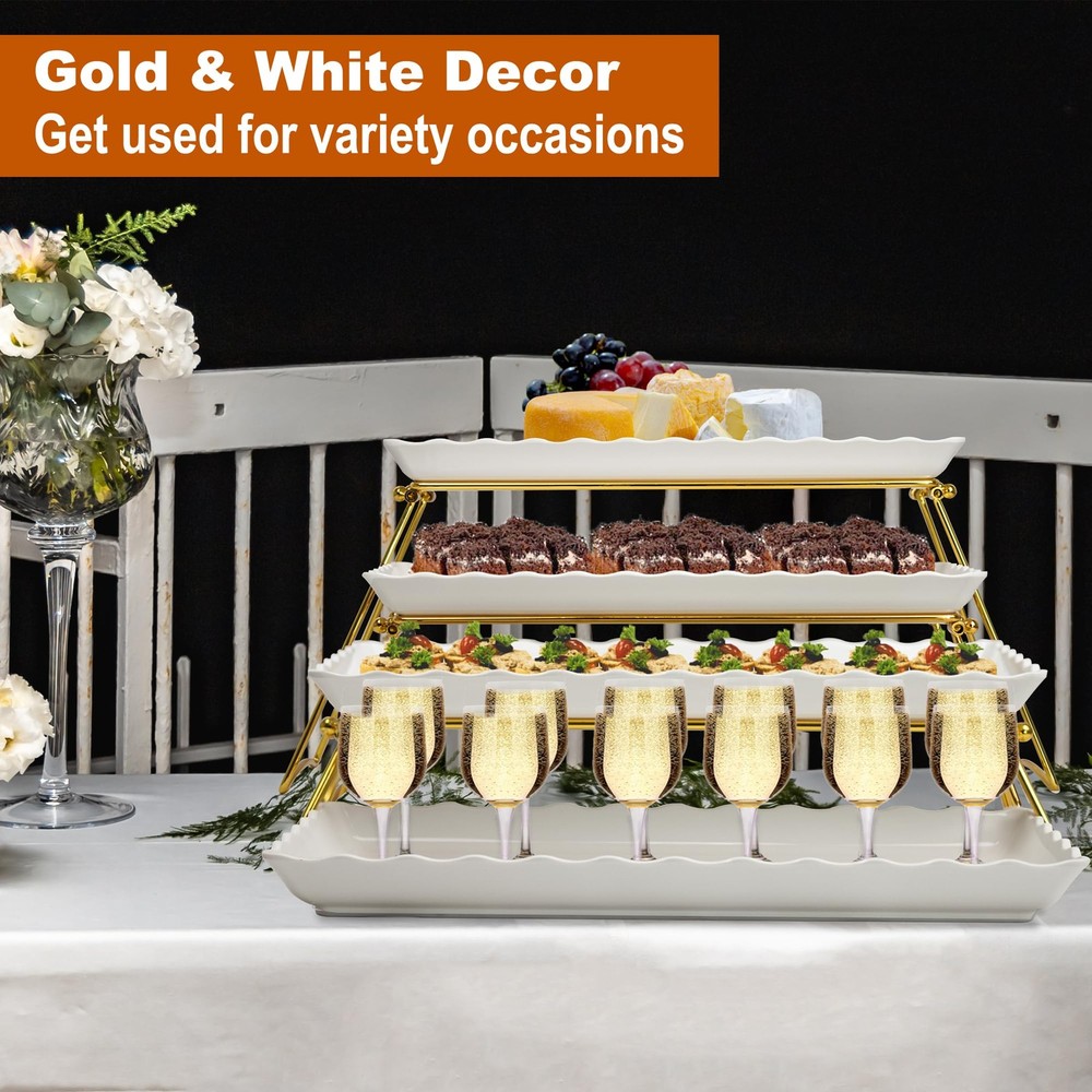 tiered trays and platters EXTRA LARGE TIERED SERVING TRAY: The whole dimension of this 4 food display tower set reach to 34’’x20’’x10’’ (normal style) and it is extra larger displaying size among other tiered serving set, and large enough to use in big family gatherings and great gift for Christmas HEAVY DUTY & STURDY STAND: No assembling, just simply unfold the legs of the stands and set a tray on top, in space by folding the legs and stacking the plates; The weight of the platters with nicely finished metal are stable enough for the tiered dessert stand, it remains sturdy whether there is food on the serving platter or if they are just on food display waiting & preparing for use, is able to withstand holding most of your favorite snacks, cakes, or meats VERSATILE TIERED SERVING STAND GETS USED FOR ANY OCCASIONS: The food stand adds height to your tablescape, makes the food appear more appealing. Enhanced any special event with this elegant serving platter set for party. It's perfect for birthdays, weddings, Bridal Shower, anniversary, holidays, hospitality business, and adult parties, formal gatherings, dances balls, buffets, dessert bar, retirement party and more entertaining. There is no limit but your imagination on how to use these trays and stands, either together or apart QUALITY PLATTERS: This party buffet set comes with 4pcs 17 X 8 X 1.5’’ wave edge white platters, made of 100% melamine, a of premium BPA-and non-material, which can serve cakes, cupcakes, cheesecakes, sushi, desserts, hors d'oeuvres, veggies, strawberry, cheeses, meats, cookies, chocolates, sandwiches. Unlike the tray or wooden tray stained easily, these pieces are dishwasher safe, and won't easily break or chip than porcelain Trays for displays OUR BRAND: helps to provide excellent tray serving solutions for customers, offers a stylish display for dessert items, saves space for extra food, and makes a great addition to party table. Notes: Each of 1pcs golden tong and cleaning clothes are in this 4 tier stand set. And do not use the food tray in the microwave