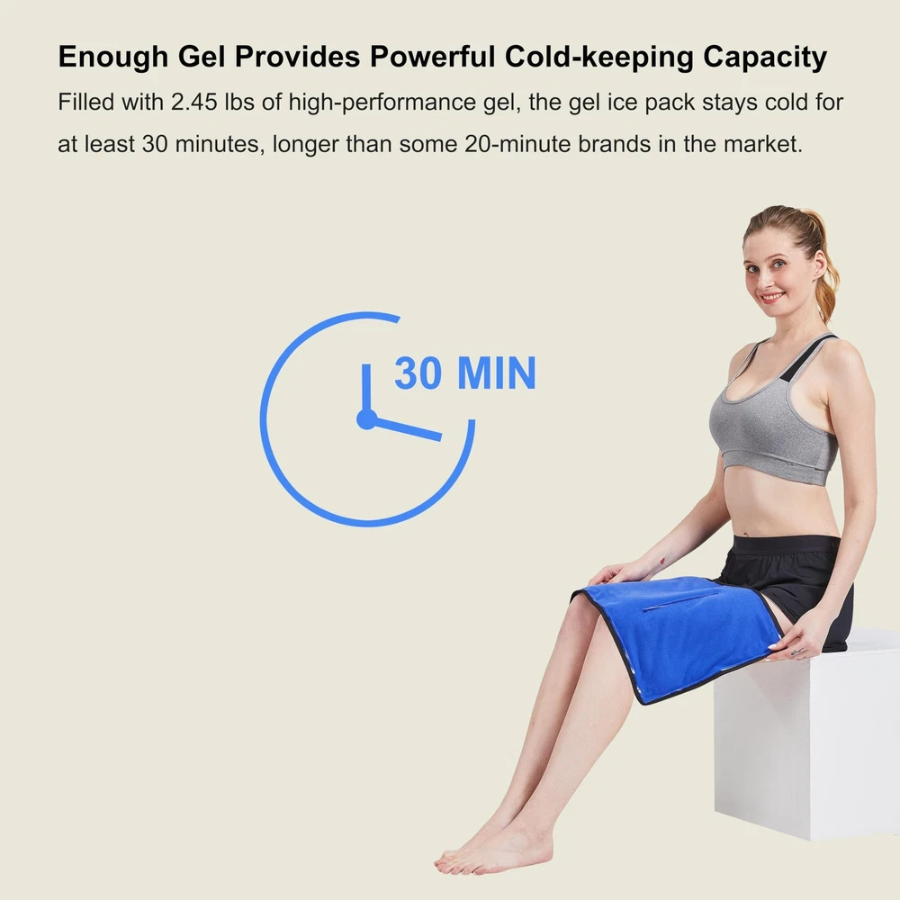 XL Ice Pack, the right ice pack you are looking for. Don't settle for a small or lighter gel pack. Grab large all-in-one ice pack for hot & cold therapy! Features: ✓ 25% larger than 11" x 14" (L) ✓ Double-sided materials—nylon and fabric ✓ Excellent cold-keeping ability ✓ Reusable and microwaveable ✓ Flexible and soft at -4°F(-20°C) ✓ Compatible for shoulders & arms, back, belly, Hips, thighs, knees, shins etc. Cold therapy instructions Cold therapy is perfect for sports injuries, back ache, joint pain, fever, headaches, toothaches and minor burns etc. and should be applied in the first 48 hours after the injuries. ✓ Store the gel ice pack in the freezer for at least 2 hours. Hot therapy instructions Hot therapy is perfect for sprains, strains and stiffness, muscle pain and spasms, mild arthritis, menstrual cramps etc. and should be applied 48 hours after the injuries. Microwave heating ✓ Heat the gel pack in the microwave according to the detailed instructions on the gel pack. Includes: 1 nylon gel pack (13.1" x 14.7", 2.45 lbs) 3 elastic straps of different length OUR GUARANTEE ✓ With , you're taking on absolutely no risk. 1-Year Warranty (Free No-Hassle Replacement!) ✓ Best customer service. Please get in touch with us for any questions. Warm Prompt Use the fabric side first for several minutes to adapt the ice and then the other side. If you use the nylon side directly when it is taken from the freezer, please place a towel between the ice pack and the skin in case of burns. XL Hot Cold Dual-use Ice Pack. This XL ice pack measures 13.1 x 14.7 inch and is 25% larger than the common large ice pack (11 x14 inch). It can cover about 70% of the whole back and 75% of the knee circumference. Unlike most single-cold ice pack, this gel ice pack supports microwaving heating for hot therapy. Innovative Dual-temperature Ice pack. Crafted from durable nylon and special fabric, this ice pack can innovatively provide two-level coldness. The nylon side provides intense coldness and the fabric side provides soothing coldness. You can use the ice pack directly without wrapping a towel. Use the fabric side first for several minutes to adapt the ice and then the other side. Hands-free Application of Cold Therapy. This ice wrap is versatile and can be used around many body parts such as the shoulder, back, belly, hip, thigh, knee, shin etc. Moreover, it comes with 3 removable elastic straps which help secure the ice pack in place. Even you can keep moving when applying the cold pack. Flexible and Long-lasting Ice Pack. Containing premium gel with unique formula, this gel ice pack remains pliable after frozen even at -4°F (-20℃), easy to morph into the shape fits the specific body parts. In addition, filled with enough 2.45 lbs of high-performance gel, this ice pack can absorb more energy in the freezer, thus can deliver up to 30 minutes of pain relief. Compared to some 20-minute brands, this ice pack has clear advantage. One Year Warranty. Wide edge and double-seam construction enable the ice pack to withstand hundreds of quality cold treatments. 30-day unconditional return and free replacement within one year. Your 100% satisfaction is always our goal. Please purchase with confidence.