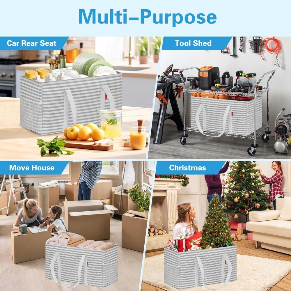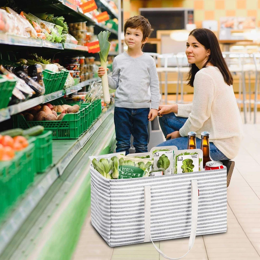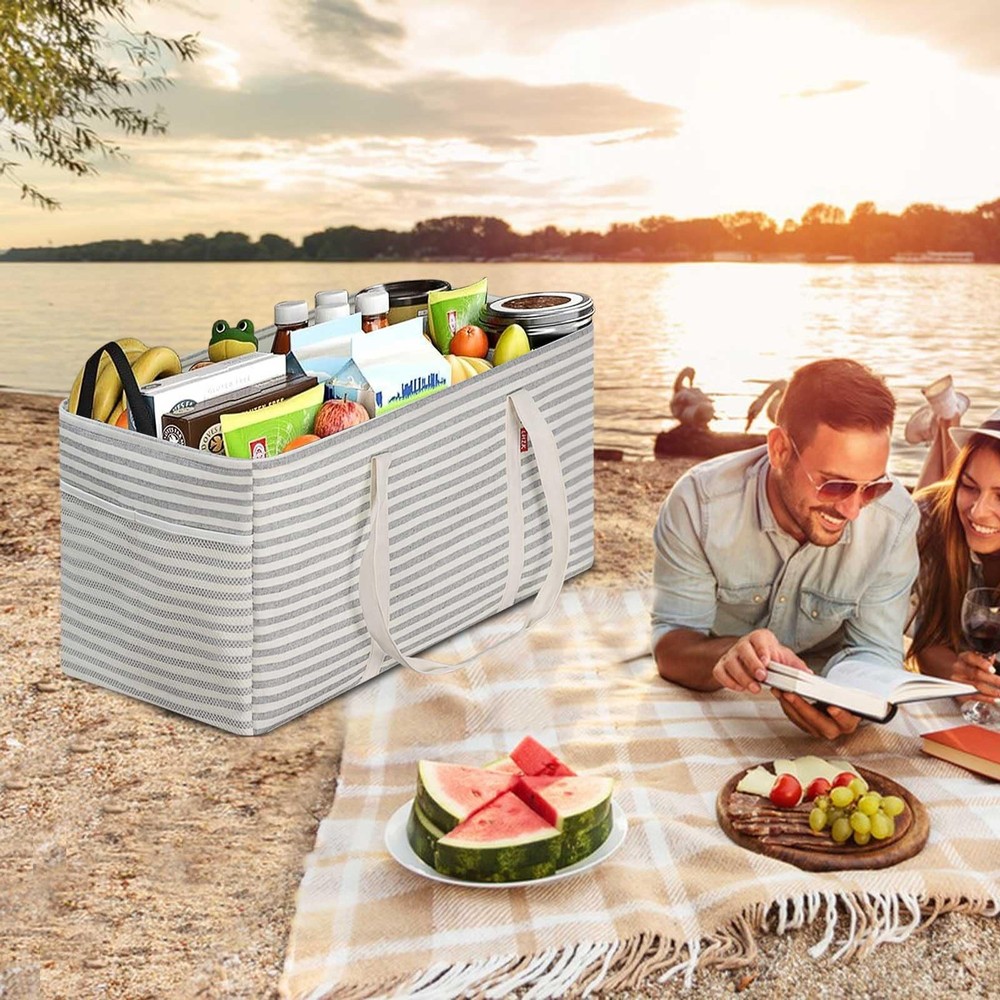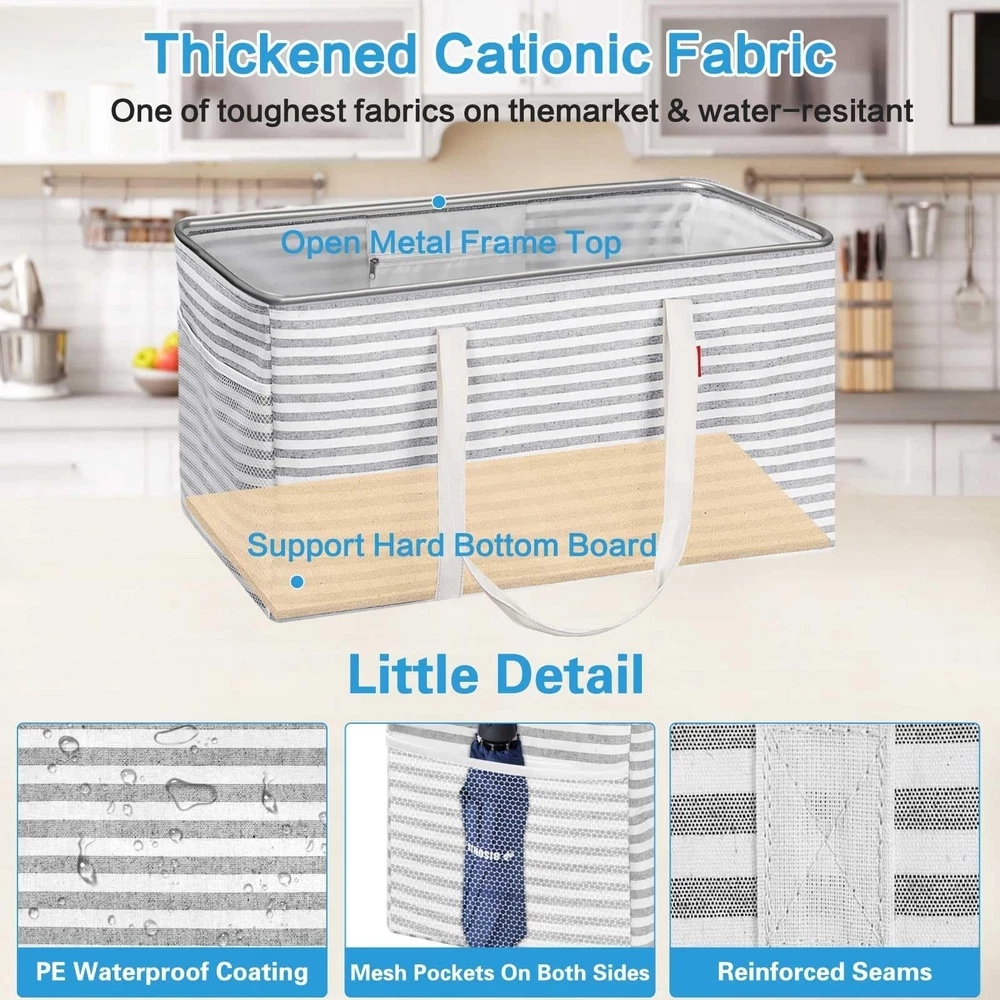 About This Item ๐งต Material: Thick Polyester with PE Waterproof Coating | Origin: China ๐ Stand-Up Design for Easy Use Simply stretch the utility tote out and it will stand upright on its own . Designed with a foldable bottom support plate , the bag maintains its shape and wonโt collapse even when fully loaded , making it extremely convenient with no installation required . This reusable shopping bag helps eliminate disposable plastic bags and works perfectly with shopping carts. ๐ Reinforced & Sturdy Construction The grocery tote bag features a metal wire frame along the open top , allowing it to stay open for easy loading and unloading . Rigid sides provide added structure while remaining lightweight and durable . Made from thick polyester , the interior includes a PE waterproof coating that offers excellent water resistance to keep stored items dryโideal for groceries, shopping, luggage, picnics, and storage. ๐ Up to 50 lbs Load Capacity This eco-friendly, large foldable grocery tote bag provides generous storage space with a 12-gallon (46L) capacity . Dimensions: 22.5 ร 10.5 ร 12 inches Handle drop: approx. 13 inches Supports up to 50 lbs when fully loaded , with enough space to store up to 18 bottles of 1.25L soda , making it perfect for heavy grocery runs. ๐ Multipurpose & Highly Versatile A true carry-all tote bag with an open-top design, suitable as a shopping basket, oversized collapsible beach or pool bag, laundry basket, gym bag, picnic bag, or car trunk organizer . Includes an interior zipper pocket to keep your phone, purse, and cards secure, plus two exterior pockets for sunscreen, goggles, beach toys, or other essentials. ๐ What You Get & Customer Support You receive 1 multi-purpose utility tote bag , backed by our permanent worry-free warranty and friendly customer service . Our 24-hour online email support is always ready to assist, ensuring 100% satisfaction with after-sales service . We wish you a happy shopping experience!