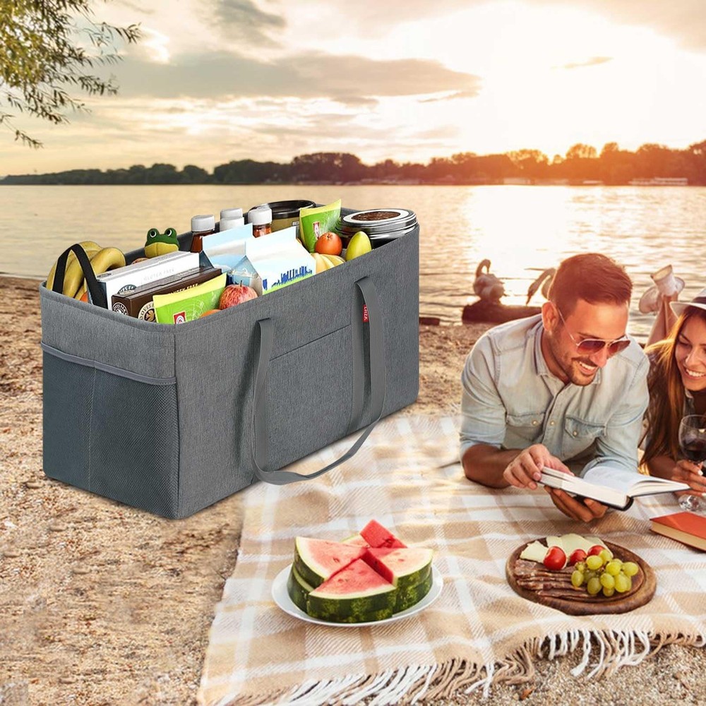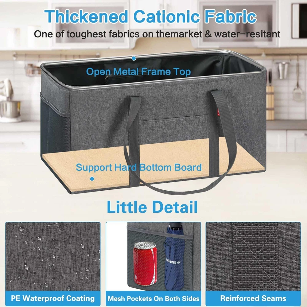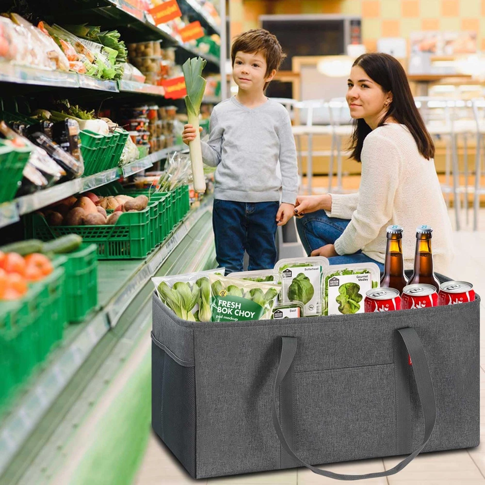 About This Item Thick Polyester with PE Waterproof Coating Made from thick, durable polyester , this utility tote bag features an interior PE waterproof coating that delivers excellent water resistance to help keep stored items dry. The bag is lightweight yet long-lasting, making it suitable for groceries, shopping, luggage, picnics, and everyday storage. Stand-Up Design – No Installation Needed Simply stretch the tote open and it stands upright on its own . A foldable bottom plate is built into the base, allowing the bag to maintain its shape and prevent collapsing even when fully loaded . This self-standing design is convenient and easy to use, especially when paired with a shopping cart. As a reusable shopping bag , it helps eliminate the need for disposable plastic bags. Reinforced & Long-Lasting Construction The grocery tote bag features a reinforced metal wire frame along the open top , keeping the bag wide open for easy loading and unloading. The rigid sides add structure while remaining lightweight and highly durable , making the tote ideal for frequent use. Up to 50 lbs Load-Bearing Capacity This eco-friendly, large-capacity foldable grocery tote bag offers approximately 12 gallons (46L) of storage space. Dimensions: 22.5 × 10.5 × 12 inches Handle drop: Approx. 13 inches Weight capacity: Up to 50 lbs when fully loaded Spacious enough to hold up to 18 bottles of 1.25L soda , it provides ample room for heavy grocery runs or bulk shopping. Multipurpose & Everyday Versatility This open-top utility tote works as a carry-all shopping bag , multifunctional basket, oversized collapsible beach or pool tote , laundry basket, gym bag, picnic bag, or car trunk organizer for groceries and cleaning supplies. Interior zippered pocket keeps your phone, purse, cards, and valuables secure Two exterior pockets offer space for sunscreen, goggles, beach toys, or small accessories Designed Specifically for Shopping Convenience Designed with grocery shopping in mind, simply place the tote in a shopping cart and organize items as you shop. When finished, move the tote directly into your car trunk and then straight into your home —no repacking needed. The inner zippered pocket protects personal items, while the front pocket and two side mesh pockets help keep smaller items neatly organized. For cleaning, simply wipe with a wet cloth as needed.