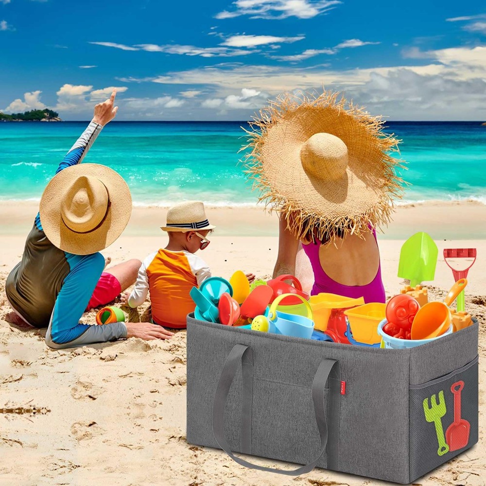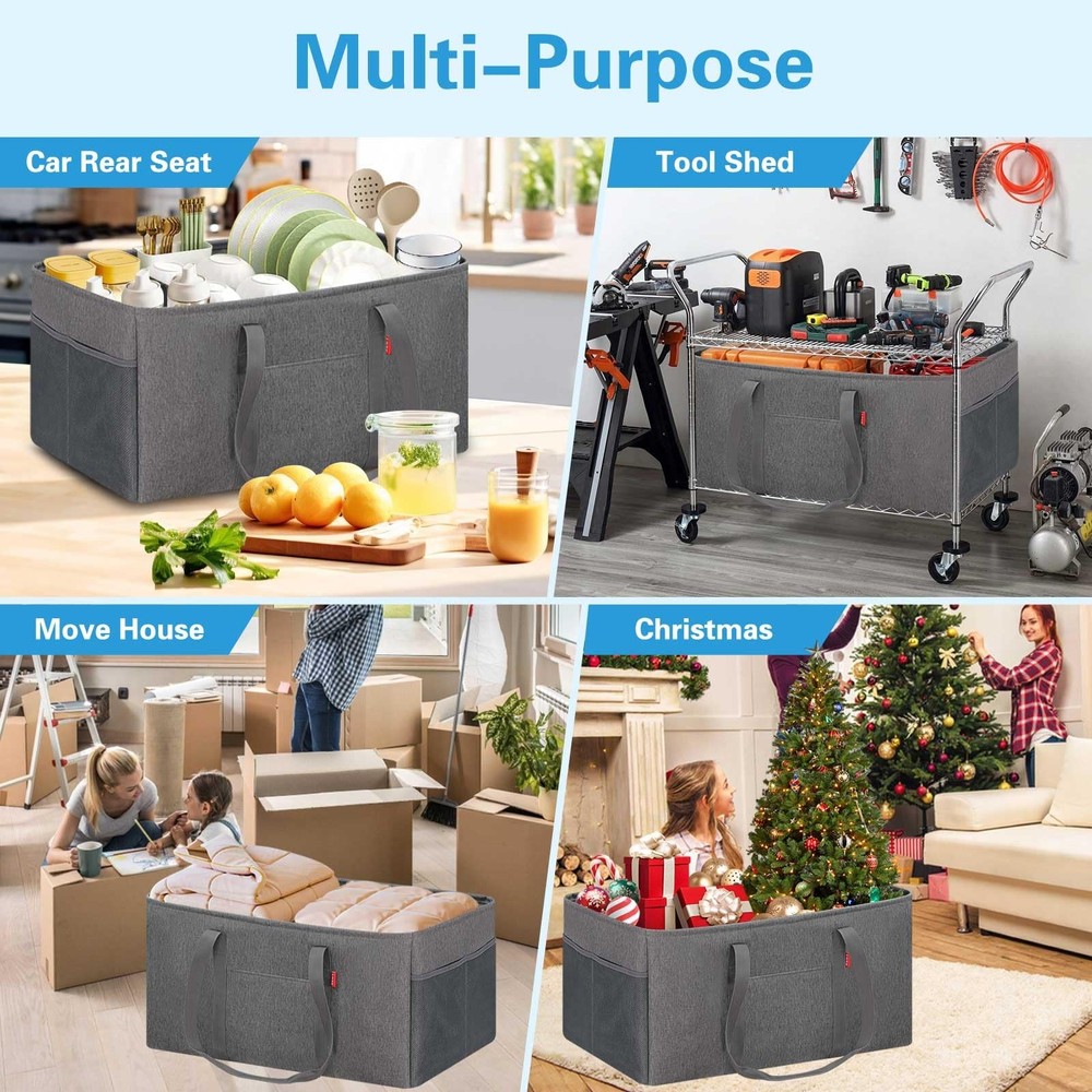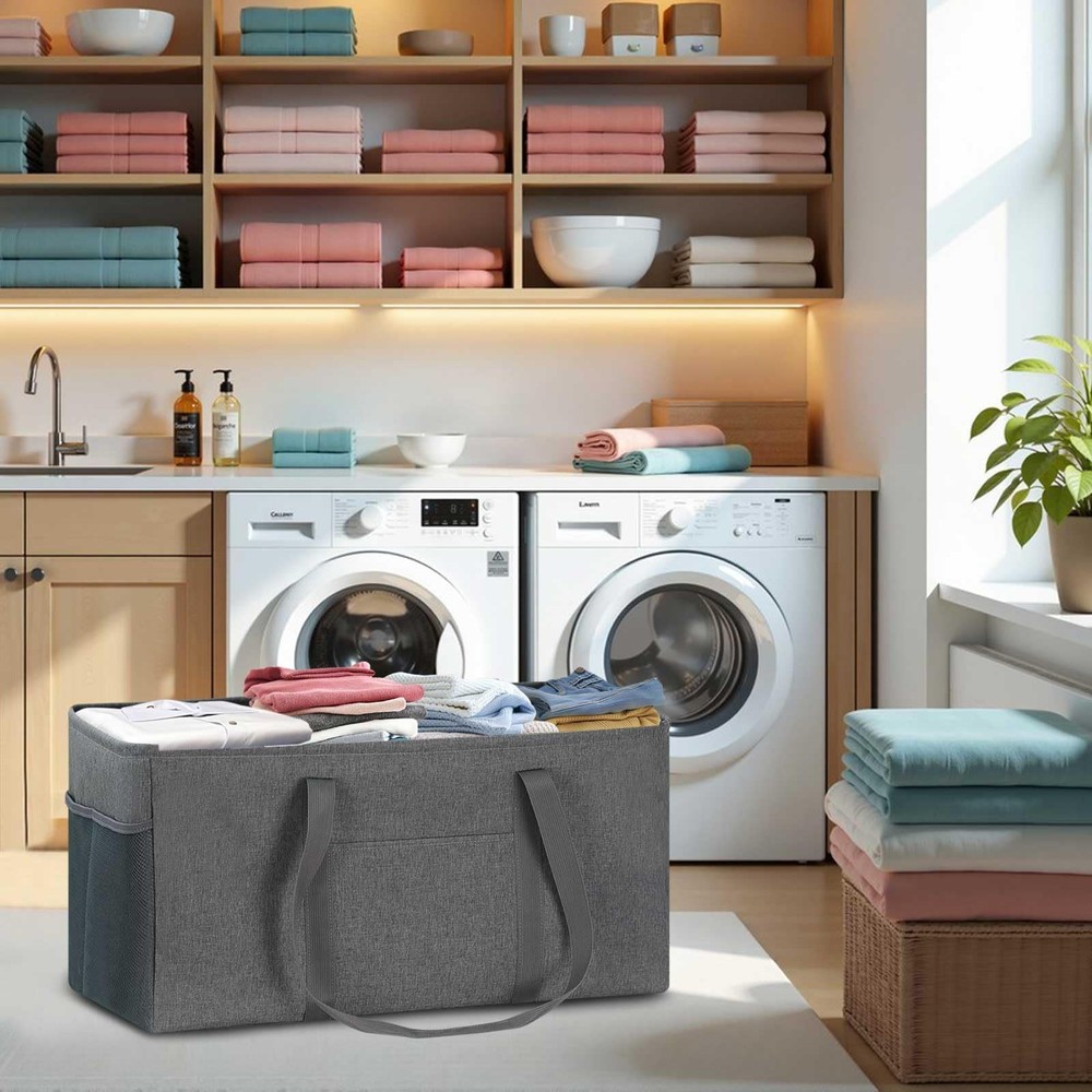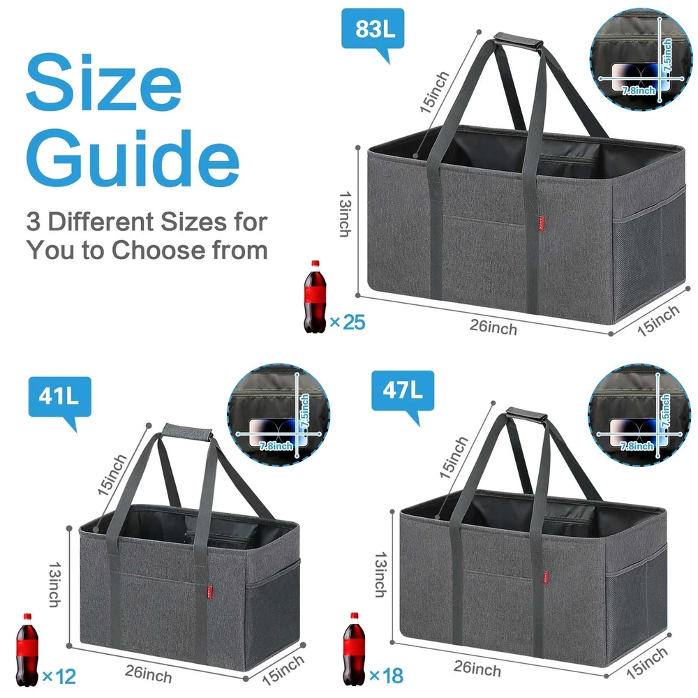 About This Item Thick Polyester with PE Waterproof Coating Made from thick, durable polyester , this utility tote bag features an interior PE waterproof coating that delivers excellent water resistance to help keep stored items dry. The bag is lightweight yet long-lasting, making it suitable for groceries, shopping, luggage, picnics, and everyday storage. Stand-Up Design – No Installation Needed Simply stretch the tote open and it stands upright on its own . A foldable bottom plate is built into the base, allowing the bag to maintain its shape and prevent collapsing even when fully loaded . This self-standing design is convenient and easy to use, especially when paired with a shopping cart. As a reusable shopping bag , it helps eliminate the need for disposable plastic bags. Reinforced & Long-Lasting Construction The grocery tote bag features a reinforced metal wire frame along the open top , keeping the bag wide open for easy loading and unloading. The rigid sides add structure while remaining lightweight and highly durable , making the tote ideal for frequent use. Up to 50 lbs Load-Bearing Capacity This eco-friendly, large-capacity foldable grocery tote bag offers approximately 12 gallons (46L) of storage space. Dimensions: 22.5 × 10.5 × 12 inches Handle drop: Approx. 13 inches Weight capacity: Up to 50 lbs when fully loaded Spacious enough to hold up to 18 bottles of 1.25L soda , it provides ample room for heavy grocery runs or bulk shopping. Multipurpose & Everyday Versatility This open-top utility tote works as a carry-all shopping bag , multifunctional basket, oversized collapsible beach or pool tote , laundry basket, gym bag, picnic bag, or car trunk organizer for groceries and cleaning supplies. Interior zippered pocket keeps your phone, purse, cards, and valuables secure Two exterior pockets offer space for sunscreen, goggles, beach toys, or small accessories Designed Specifically for Shopping Convenience Designed with grocery shopping in mind, simply place the tote in a shopping cart and organize items as you shop. When finished, move the tote directly into your car trunk and then straight into your home —no repacking needed. The inner zippered pocket protects personal items, while the front pocket and two side mesh pockets help keep smaller items neatly organized. For cleaning, simply wipe with a wet cloth as needed.
