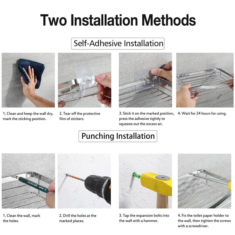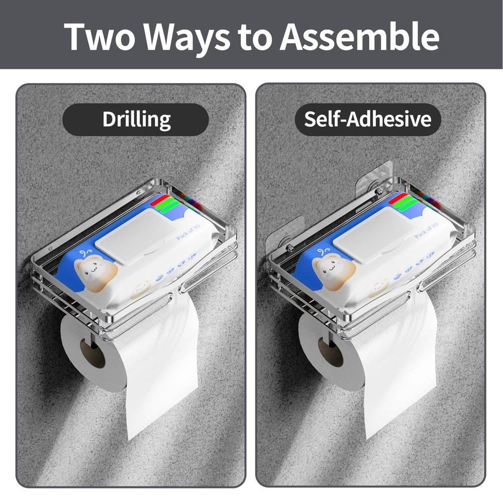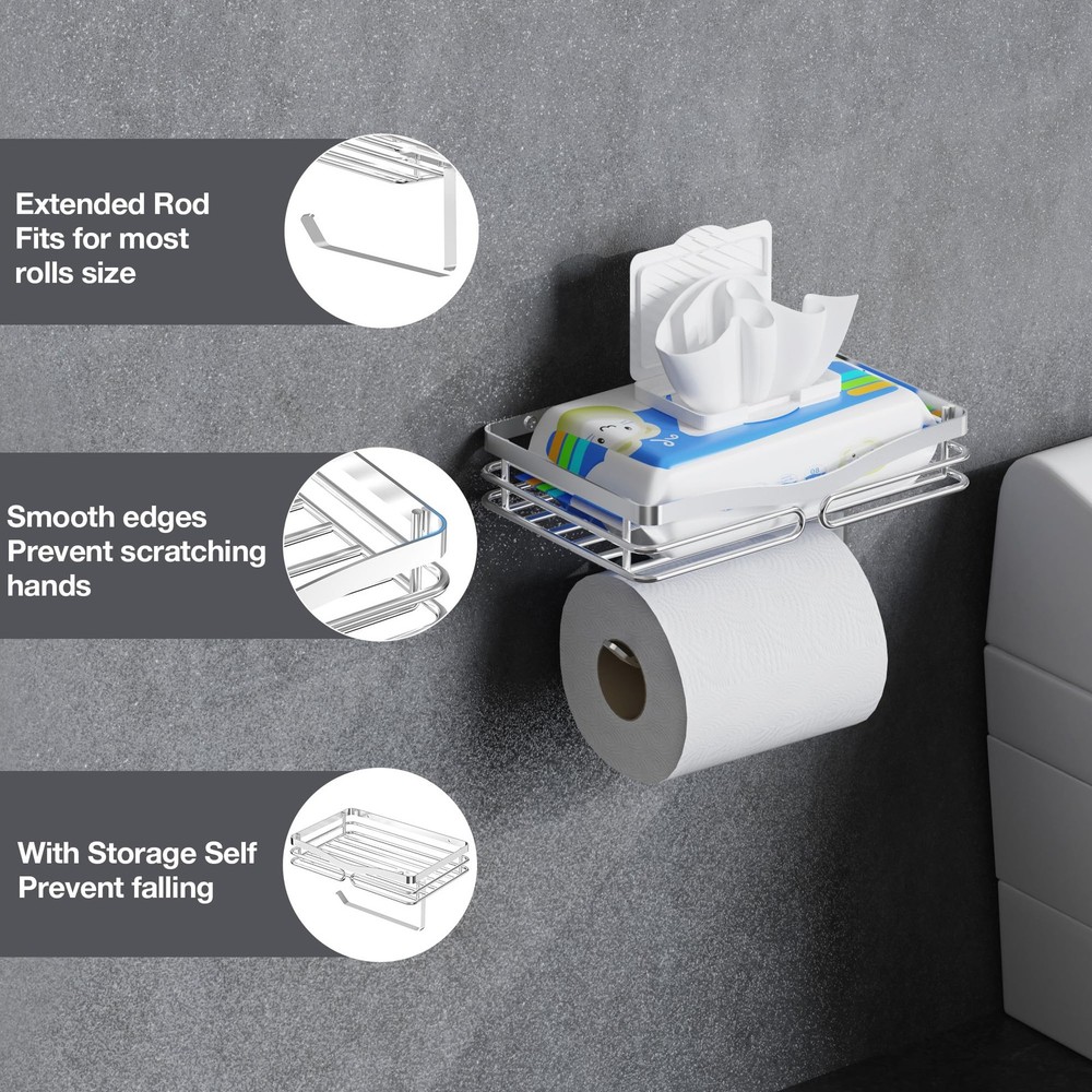 Extra Large Wipes Holder - Adhesive & Wall Mounted Toilet Paper Holder with Shelf, Stainless Steel Toilet Rolls Holder, Silver Waterproof 【Wall-Mounted & Self Adhesive Toilet Paper Holder】Extended rod fits for large TP rolls; Smooth, rounded edges for comfortable, scratch-free use; Extra-long shelf securely holds bathroom essentials, prevents phone or other stuff from falling off 【Toilet Paper Holder with Shelf】's innovative TP holder with shelf design combines convenience and organization: lower rack stores spare rolls within easy reach while upper storage basket keeps bathroom essentials such as phone, keys, small plants neatly organized 【Premium Stainless Steel Construction】Crafted from high grade 304 stainless steel, this TP holder resists rust and corrosion even in steamy bathroom environments. The satin-brushed finish delivers a premium look that complements any decor, while the protective coating ensures effortless maintenance – a quick wipe keeps it looking pristine. Unlike cheaper alternatives, it maintains its luster for years without tarnishing or discoloration 【Two Installation Methods】AILIDI tissue paper holder with shelf offers two installation methods: 1. Using expansion screws for a secure fit, 2. Utilizing high-adhesive tape for mounting. Whether your wall surface is smooth, such as tiles, glass, or wood panels, or if it's a rougher surface like concrete or wallpaper-covered walls, there's a suitable installation method available for you 【After-sales service】Your Assurance for Peace of Mind: With years of expertise in the bathroom essentials category, we boast a dedicated factory ensuring stringent quality standards for our products and services. Should any issues arise, contact us immediately toilet paper holder fit for bathroom, kitchen, washroom, laundry room, and living room. Shipping We offer FREE shipping on all orders! We ship within Three business days of payment, usually sooner. We use a selection of shipping services such as UPS, FedEx, USPS etc. We only ship to the lower 48 states, no APO/FPO addresses or PO Boxes allowed. Local pickups and combined shipping options are not provided at this time. Return You can return a product for up to 30 days from the date you purchased it. Any product you return must be in the same condition you received it and in the original packaging. Please keep the receipt. Payment We accept payment by any of the following methods: PayPal Please pay as soon as possible after winning an auction, as that will allow us to post your item to you sooner! Feedback Customer satisfaction is very important to us. If you have any problem with your order, please contact us and we will do our best to make you satisfied. Contact Us If you have any queries, please contact us via ebay. We usually respond within 24 hours on weekdays. Please visit our eBay store to check out other items for sale! Thank you for shopping at our store.