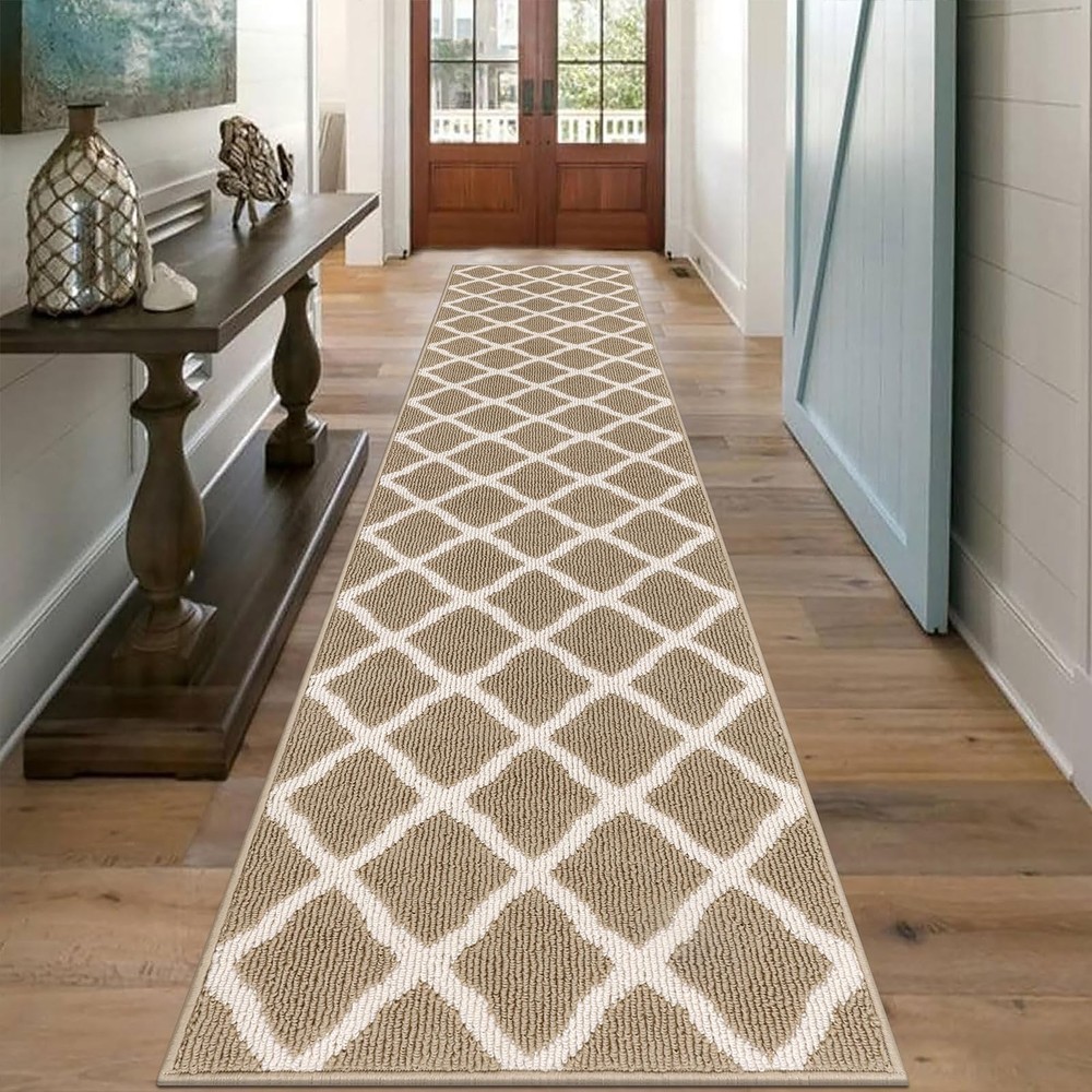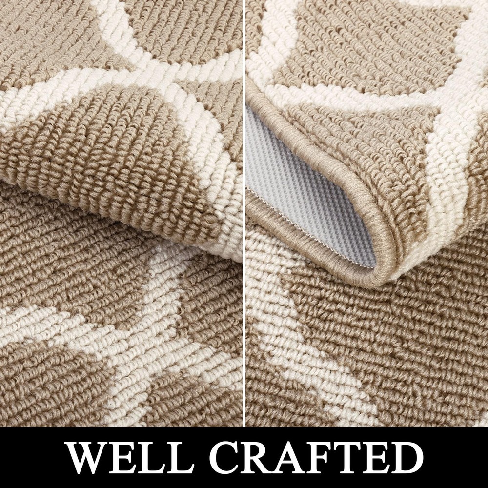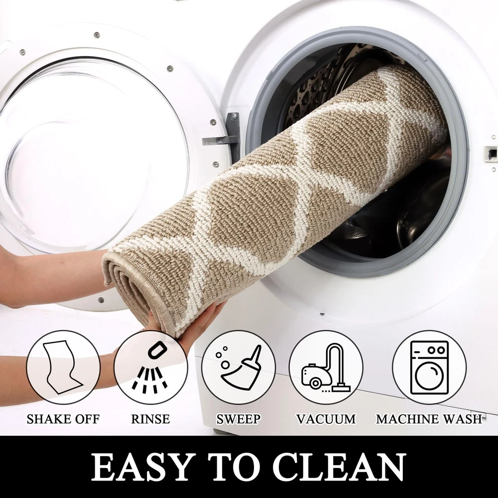 SHACOS Indoor Doormats Runner Rugs Non Slip Long Entryway Rug Washable Door Mats Front Door Rug Mats Water Absorbent Dirt Trapper Floor Mat Rubber Backing Runners for Kitchen Hallway Mud Room Porch Garage Laundry Room Material: Made of sturdy polypropylene fabric Surface, absorbs water and mud. Non slip TP rubber Backing keeps the mat in place. Features: Raised fabric loops effectively scrape off dirt, dust, mud, sand, grass or snow and absorb moisture from shoes and fur paws, protect the floors and dampen the noise. Well finished edges prevent the mat from falling apart and ensure longevity. Waterproof back prevents liquid from seeping through the mat. Multi-purpose floor mats for indoor outdoor, front door welcome mat, back door mat, inside doormat, entry rug, entrance rug, mud room rug and kitchen sink rug, floor mat in front of oven, laundry room mat in front of washer and dryer, long rug runners for hallway. How to clean: Simply vacuum clean, sweep with a broom or use a garden hose to rinse the mat outdoors. For a deeper clean,machine wash and dry. Long Runner Size: 2x10 ft/ 60x305 cm. Low Profile. 0.4 inch thickness. Simple Elegant Moroccan Trellis Lattice pattern. A beautiful welcome door mat. Looks great on wood or tile floors. Dirt & Water Absorbent Hallway Runner Rug. Dense polypropylene loops surface catches and absorbs dirt, sand, grime, snow, mud, water and other debris from shoes and boots. Protecting your floor from water, stains and scratches. Non Slip and Waterproof Rubber Backing. Textured TP rubber backing stays firmly in place and prevents tripping hazards, provides extra safety for you and your family. Multi-purpose runner rug for home and office, can be used as runner rug for entryway, doorway, hallway, kitchen rug in front of sink and oven, laundry room mat in front of washer and dryer, accent rug for high foot traffic area. Easily cleaned up by shaking, vacuuming, hosing off. Machine wash, cold water, gentle cycle, tumble dry on low heat. Low maintenance and quick drying. Note: Rugs may contain temporary creases upon arrival, allow time for creases to flatten and settle