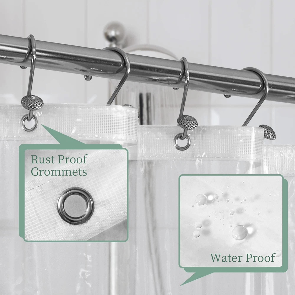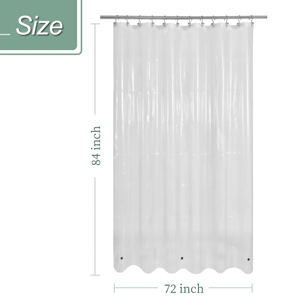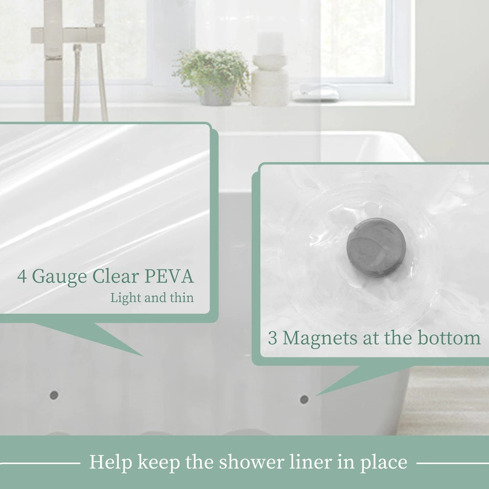Premium PEVA shower curtain/liner with magnets delivers a special taste to the bathroom, water proof and easy to maintain: Wipe and clean with a damp cloth only. *Qualified: High quality PEVA shower curtain liner is a good choice for the person who requires heavy duty liner for bathtub. Made of clear plastic, the liner plays a function to better hold back water in a shower. Can be used as a liner or curtain simply *Water Proof: The liner has the advantage of plastic material properties like PVC free. It performs water proof well, allowing form water beads on the surface and easy to clean with a damp cloth *Encased magnets: Comes with 3 magnets at the bottom, especially good for cast/iron bathtub, in respect that it's easy to stick to the tub and keep the liner from blowing or clinging to body *Durable: Reinforced top header along with 12 rust proof metal grommets helps the shower curtain liner long-lasting use *72 inch width by 84 inch height, long size is suitable for your bathroom