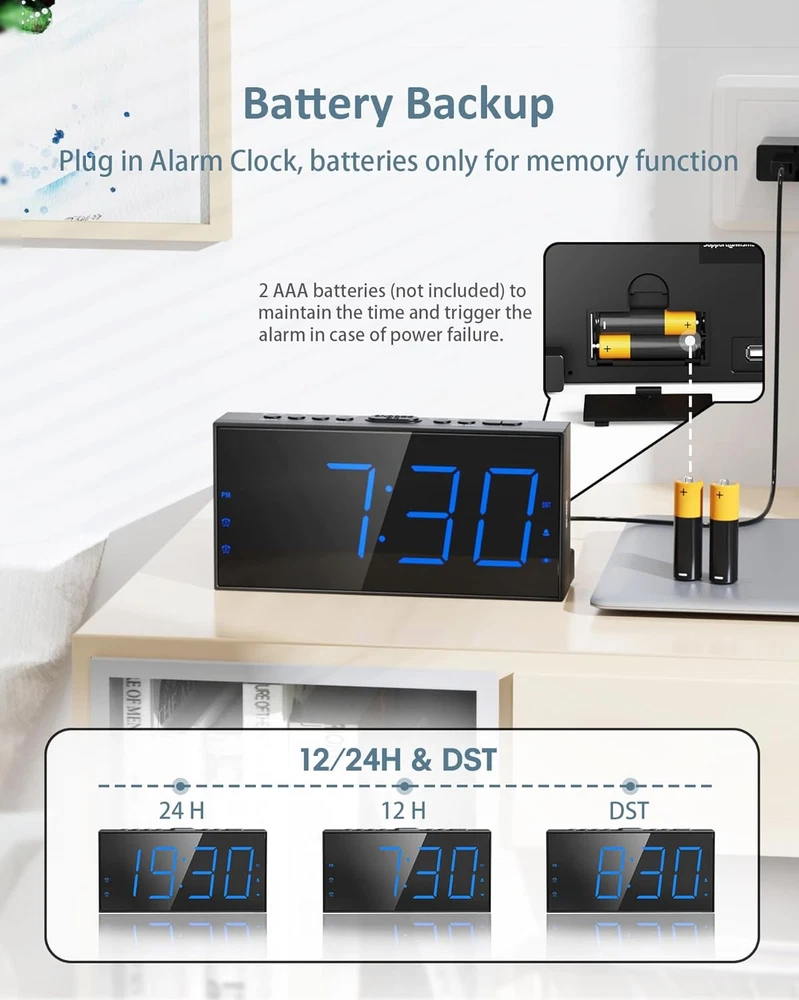 โฐใWake by ๐ฆ๐๐ฟ๐ผ๐ป๐ด ๐๐ฒ๐ฑ ๐ฆ๐ต๐ฎ๐ธ๐ฒ๐ฟ & ๐๐ผ๐๐ฑ ๐๐๐๐๐ฒ๐ฟใ- Differ from regular alarm sound clock, our ๐น๐ผ๐๐ฑ ๐ฎ๐น๐ฎ๐ฟ๐บ ๐ฐ๐น๐ผ๐ฐ๐ธ comes with 3 innovative alarm methods: loud buzzer, super bed shaker or both sound and shaker, actually make it easier to wake you up from deep sleep. Simply press the โBUZZ/VIBโ button to choose your favorite wake-up modes for maximum impact. The bed shaker alarm clock is also a perfect option for heavy sleepers, hearing impaired, deaf or hearing loss. ๐ใStrong Wired Vibration Shaker & Adjustable Volumeใ- The ๐๐ถ๐ฏ๐ฟ๐ฎ๐๐ถ๐ป๐ด ๐ฎ๐น๐ฎ๐ฟ๐บ ๐ฐ๐น๐ผ๐ฐ๐ธ features with 71โ wired bed shaker which is long enough to be placed under the mattress. It can produce a strong vibration to shake you awake without disturbing others. The alarm sound volume is 4-level adjustable to meet your different needs. Combing the highest volume level and powerful bed shaker, you can be reliably waken up on time even for heavy sleeper. ๐ดใDual Alarm Clock & Big Snooze Functionใ-The ๐ฑ๐๐ฎ๐น ๐ฎ๐น๐ฎ๐ฟ๐บ ๐ฐ๐น๐ผ๐ฐ๐ธ allows you to set two separated alarms easily especially handy for couples or roommates who keep different schedules. When the alarm goes off, lightly touch the big snooze button to turn off temporarily and get extra 9 minutes sleep before alerting you again. You can also press the โALARM PAUSEโ or โALARM OFFโ to turn off the alarm for 24hours or permanently respectively. ๐ ใ7.5โโ Large Display & 5 levels Brightness Dimmerใ-With 7.5โโ big LED display, the numbers on the ๐ฏ๐ฒ๐ฑ ๐๐ต๐ฎ๐ธ๐ฒ๐ฟ ๐ฎ๐น๐ฎ๐ฟ๐บ ๐ฐ๐น๐ผ๐ฐ๐ธ are ultra-clear to see from a long distance or across the bedroom even without glasses. 5 level adjustable screen brightness help you avoid high-intensity light while you are asleep or easily view the time in the daytime. ๐ใElectric Powered with Battery Backupใ- All functions of the ๐ฏ๐ฒ๐ฑ๐ฟ๐ผ๐ผ๐บ ๐ฎ๐น๐ฎ๐ฟ๐บ ๐ฐ๐น๐ผ๐ฐ๐ธ work under AC power (input power 100-240V), 2pcs AAA backup batteries (NOT Included) are only used to memorize time and alarm settings when encountering power outage. During the backup battery, the screen will go blank but the alarm will still be triggered. ๐ฑใUSB Charger Port Design & 12/24H Formatใ- The ๐ฎ๐น๐ฎ๐ฟ๐บ ๐ฐ๐น๐ผ๐ฐ๐ธ ๐๐ถ๐๐ต ๐จ๐ฆ๐ ๐ฐ๐ต๐ฎ๐ฟ๐ด๐ฒ๐ฟ port (5V/1A) provides the convenience for charging your phone or other device safely while you sleep. The 12/24H format and DST function are also available by pressing the corresponding buttons. ๐ใEasy to Operate & Wide Applicationใ- With the intuitive setting buttons, the ๐ฎ๐น๐ฎ๐ฟ๐บ ๐ฐ๐น๐ผ๐ฐ๐ธ ๐ณ๐ผ๐ฟ ๐ต๐ฒ๐ฎ๐๐ ๐๐น๐ฒ๐ฒ๐ฝ๐ฒ๐ฟ is easy to use even for kids or elders. Updated features such as vibration, dual alarm, dimmer, USB charging port and modern design, the digital alarm clock can be as a perfect choice for your family, friends, kids. Product Description Roxicosly Digital Alarm Clock with Bed Shaker & Buzzer Sound Whether you have the bother of hearing the sound when you use the sound alarm clock or simple want to get up without disturbing others, our Roxicosly loud vibrating alarm clock is a great choice for meet your requirements for simple sound alarm clock . Based on the original ring alarm clock , we developed this digital alarm clock with bed shaker which not only can make loud sound buzzer but also produce strong vibration to wake you up. Especially helpful for heavy sleeper, hearing loss, hearing-impaired, deaf or hard of hearing. Excellent Features- 3 wake-up modes option: buzzer or shaker or buzzer & shaker. Dual alarm clock function allows you to set two separate alarms to meet different routines. Alarm volume is 5-Level adjustable to make a gently or loud alert for waking you up. 7.5โโ ultra-large display for you to see the numbers clearly and 5 different brightness levels. Touch big snooze button to get extra 9mins sleep. Alarm clock with USB charging port makes it conveniently to charge smartphone safely. Alarm clock backup battery is used to memorize time & alarm setting in case of power failure. 12/24H Format and DST function by hold press the โ12/24Hโ and โDSTโ buttons separately. Extra loud alarm clock for heavy sleepers , hearing-impaired or deaf. Easy to use the smart loud alarm clock with simple interface and conspicuous buttons. New Ways to Wake Up Comes with a powerful bed shaker, Roxicosly bed shaker alarm clock owns 3 wake-up modes: buzzer or shaker or buzzer & shaker to meet different needs. Simple place the bed shaker with 71'' long wired under any mattress or pillow without causing discomfort to your head and it will produce strong vibration to shaken you awake without disturbing your couples or roommates. The vibrating alarm clock is especially a good choice for heavy sleeper, hearing loss, hearing-impaired, deaf or hard of hearing. ๐๐ฒ๐ฎ๐๐ ๐๐น๐ฒ๐ฒ๐ฝ๐ฒ๐ฟ ๐ฎ๐น๐ฎ๐ฟ๐บ ๐ฐ๐น๐ผ๐ฐ๐ธ is a smart choice for those who want to wake up without disturbing their partners or roommate With the portable size, our ๐๐ถ๐บ๐ฝ๐น๐ฒ ๐ฎ๐น๐ฎ๐ฟ๐บ ๐ฐ๐น๐ผ๐ฐ๐ธ is perfect for those who are normally travelling and wake them up without affecting others when on board. No matter which wake-up modes you choose, the icons on the display which show sound or shaker will show clearly on the screen interface. With the excel