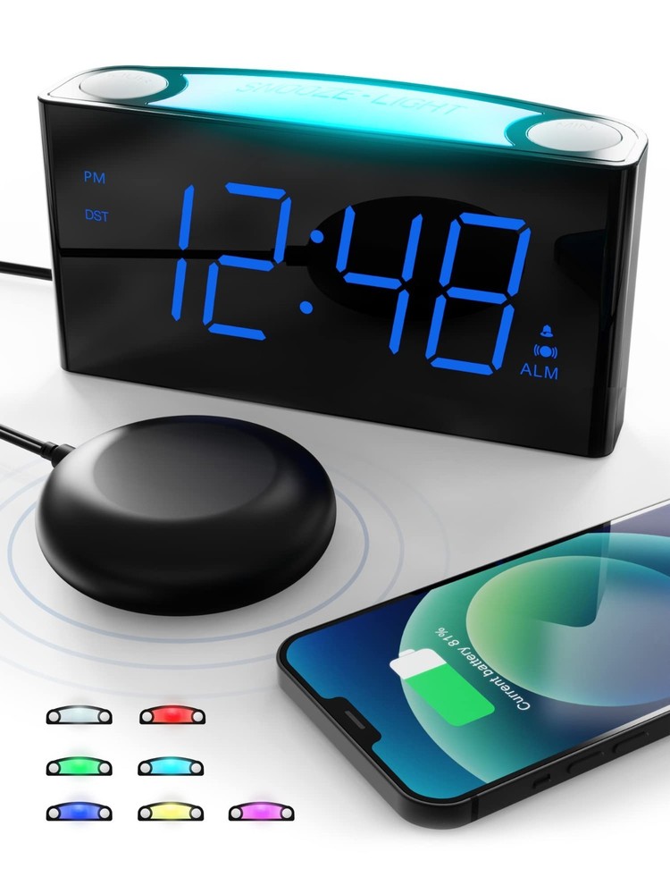 Vibrating Alarm Clock with Bed Shaker Wake up on time, every time, with the innovative Vibrating Alarm Clock with Bed Shaker . Designed to shake you awake without disturbing others, this clock is perfect for heavy sleepers, deep sleepers, and those with hearing loss. Key Features: Unique Bed Shaker: Place it under your pillow or mattress for a gentle yet effective wake-up call. Extra Loud Alarm & Large Snooze Button: Choose from 3 wake modes: Alarm Sound, Bed Shaker, or both. Enjoy 9 extra minutes of sleep with the easy-to-reach snooze button. Clear Large Display & Adjustable Brightness: Easily read the time from anywhere in the room. Adjust the display brightness from 0-100% to suit your comfort level. 7 Colored Night Light & Dual USB Charging Ports: Select from 7 night light colors to brighten your room. Use it as a bedside reading lamp or charge your devices with dual USB ports. Battery Backup: Maintain alarm and time settings even during power outages. Note: Batteries not included. This compact alarm clock is ideal for bedrooms, offices, and kitchens. Ensure you're always on schedule with this reliable and feature-packed alarm clock.