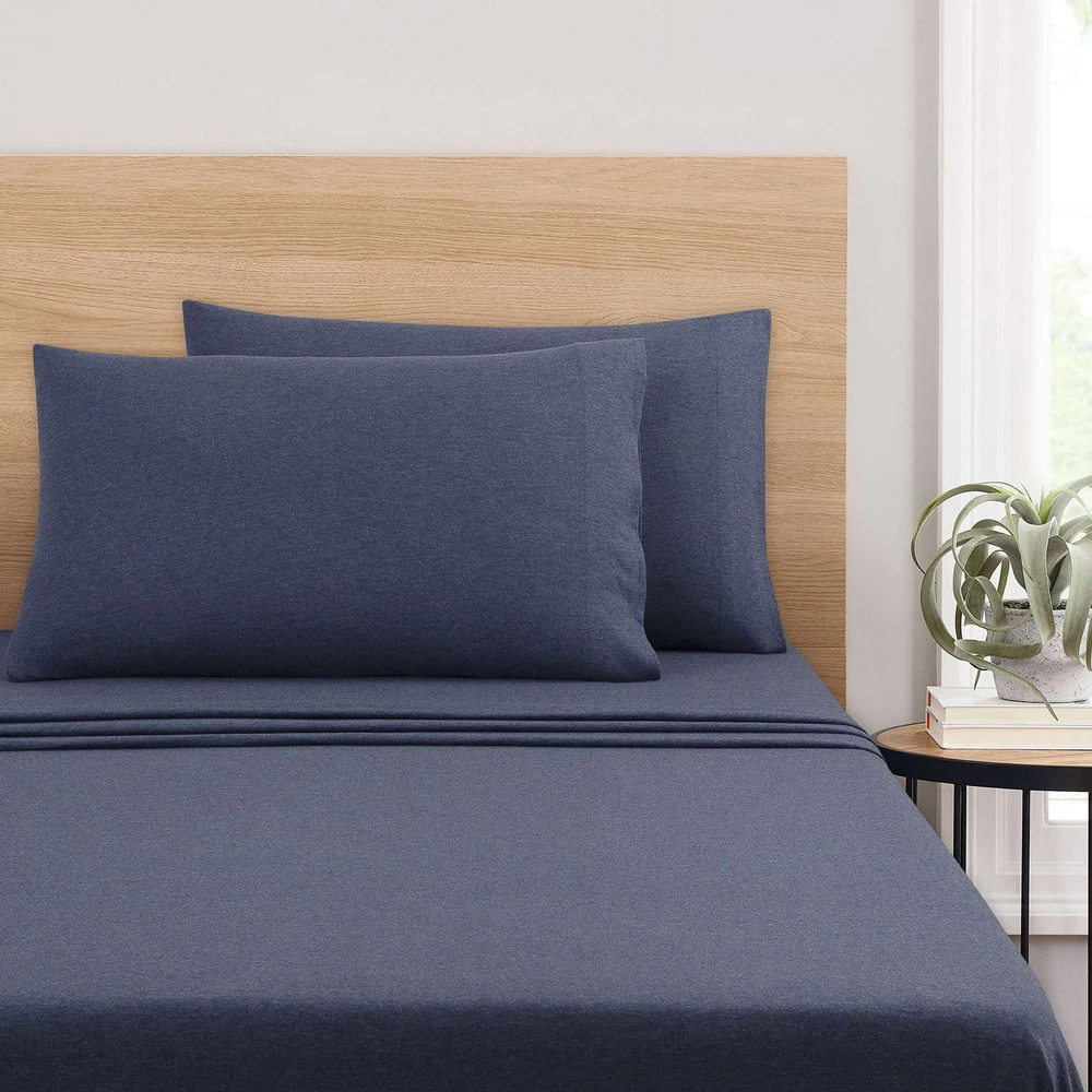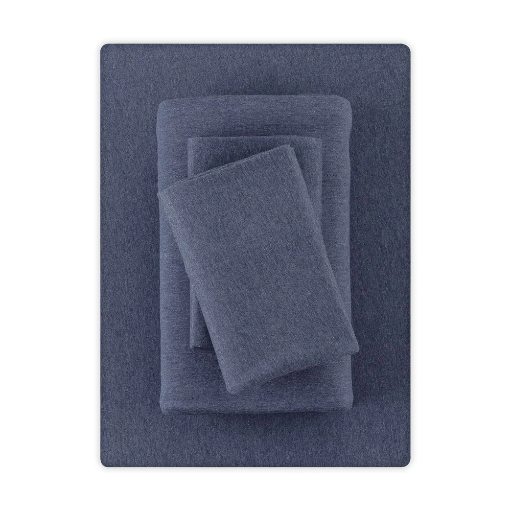 This sheet set provides the utmost live-in comfort with a touch that's as soft as your favorite T-shirt, which offers natural stretch and coziness. Items included are flat sheet, a fitted sheet with all around elastic that stretches to fit mattresses up to 15 inches deep, and two pillowcases, (one pillowcase in twin set). These adaptable bed sheets come in a variety of sizes, vibrant colors, and entertaining designs to match any decor. QUEEN SIZE. Dyed Jersey Sheet Set, 150 GSM, Blue Cove, 4-Piece • Assembled Product Contents & Dimensions: Queen is a set of 4-Pieces: 1-Flat Sheet 90" x 102", 1-Fitted Sheet 60" x 80" with 15" Drop & 2-Standard Pillow Cases 20" x 32" • Package dimensions: 6" x 9" x 11" • Assembled Product Weight: 5.75 LBS Product Material: 60% Cotton & 40%