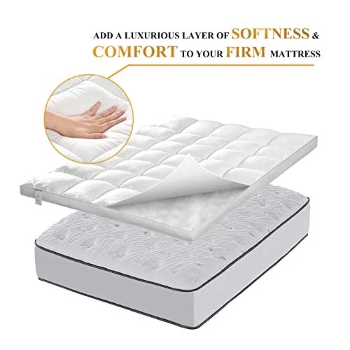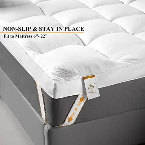 Return Policy Fast Delivery Trusted seller Extra Thick Mattress Topper King for Back Pain & Cloud-Like Sleep, Soft & Plush Mattress Pillow Top Bed Topper for Firm Mattress, Cooling Overfilled 1400GSM Mattress Pad, Fit to 6”-22” Mattress Product Description ***** THE PERFECT ADDITION TO A FIRM MATTRESS. Generously filled with 194oz super soft down alternative gel-fiber, this king size mattress topper is TRULY EXTRA THICK and offers the ultimate in softness to provide cloud-like sleep comfort to your body during the night. With its exceptional loftiness and plushness, this plump mattress topper is the perfect addition to a firm mattress. *****BEST REPLACEMENT FOR MEMORY FOAM OR FEATHER-DOWN MATTRESS TOPPER: Featuring breathable down alternative gel-fiber filling and skin-friendly soft brushed polyester fabric, this mattress topper is a great solution for people who are sensitive to feather-down mattress toppers or suffering from the odors or the heat retaining of a memory foam mattress topper. No more sweaty night with a memory foam mattress topper. Noted: It's filled with polyester, not down. *****ULTRA COMFORTABLE PILLOW TOP MATTRESS TOPPER FOR BACK PAIN RELIEF: The generously filled and evenly distributed gel-fiber filling adds an layer of extra thick cushion on your mattress delivering instant relaxation and providing best relief and support to shoulders, back, and hips. It is ideal for side, back or stomach sleepers and can greatly relieve the back pain. It's great for Mother's Day gift. *****SECURE FIT & BOX QUILTING CONSTRUCTION. Our mattress topper with 4 corner elastic straps adapts to mattress depths from 6" to 22" and ensures a secure fit to allow you toss and turn freely. The box quilting construction prevents the fillings from shifting as you sleep to offer you the most consistent comfort. *****TIPS FOR USE. It is not necessary to wash your pillow top before use as it is clean. For best results, tumble dry it on a low heat before use to fluff up the fibers. To extend your bed topper’s life and reduce the need to wash it, position a mattress protector/ fitted sheet over it. Wash bi-annually in a front loader machine on a cool wash. *Please do not use a top loader machine as the agitators destroy the fibers. Shipping Returns Payment Shipping Shipping is FREE to all addresses other than APO/PO boxes in the lower 48 states. All our stock ships from US-based warehouses. Shipped via USPS or UPS (depending on location and package weight) Unless stated otherwise, all orders will ship within 24-72 hours of your payment being processed. Check our feedback to see the great reviews of FAST shipping we offer. Returns Seller does not accept returns Payment We currently accept payment via eBay managed payments only. Once payment is cleared, we will dispatch your shipment within 1-3 business days. Please refer to the "Shipping" tab for more information regarding shipping speed to your destination.