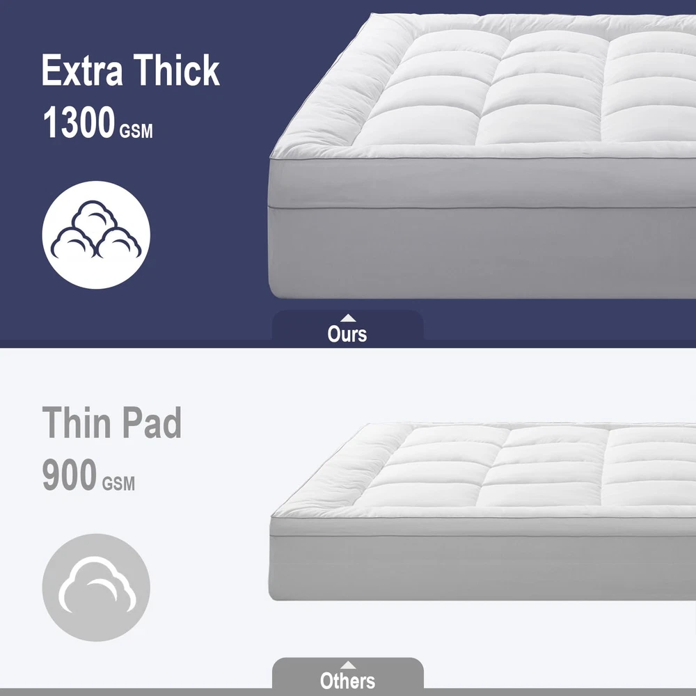 Extra Thick Mattress Topper - Our Mattress Topper is filled with 1300 GSM down alternative fiber, which is twice as much as many other mattress toppers on the market. With this extra filling. 100% Cotton Top & Premium Filling Fibre - The topper's shell is made of 100% cotton, providing a soft and durable surface that wicks away moisture for a comfortable night's sleep. Our cotton mattress topper boasts a premium filling fiber. Non-Slip and Deep Pocket - Our pillow top mattress topper comes with a non-slip, all-around stretchable elastic skirt that fits any mattress up to 24" deep. which ensures a snug fit and prevents the topper from popping off at the corners. Instantly Upgrade Your Old Mattress - Adding a fluffy mattress topper could be the easiest way to personalize your mattress and get the ultimate in luxury slumber. With our cloud-like plush down alternative mattress topper. Product Care - Delivered in a vacuum sealed package, the mattress topper may look thinner after opening. To fluff it up quickly, just shake it, and leave it for several hours.