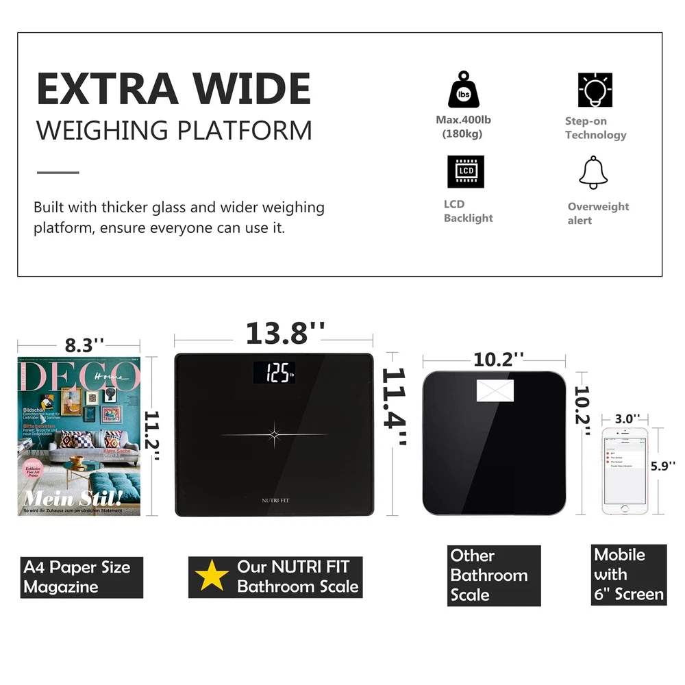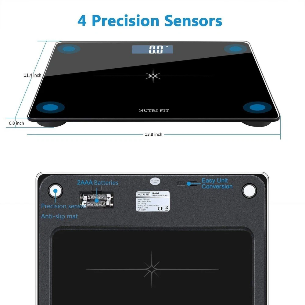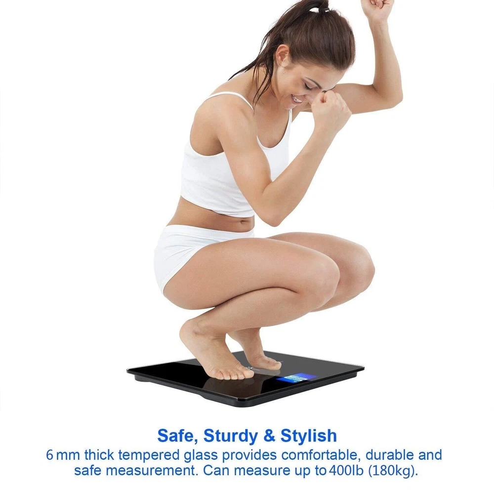 Staying fit and healthy is just a step away. First, you need a Digital Body Weight Scale. The digital scale uses 4 high-precision G sensors to instantly deliver trustworthy results with a 0.1 lb accuracy resolution. Its step-on technology, sizeable and bright backlit LCD display and seamless unit conversion with the push of a single button mean you can immediately read your weight as soon as you step on the scale. The stylishness you want, the safety and sturdiness you need... Thanks to its rounded corners, anti-skid pads and rollover protection, the large 6 mm-thick tempered glass platform is not only durable and safe, but also has auto on/off/zero, low battery and overload indication features for superior convenience.this scale is suitable for everyone to use especially for taller people or people with balance issue. Specification: Weight Capacity: 400 lb (180 kg) Graduation: 0.05kg/0.1lb Units: Kg / Lb Dimensions:13.7"x11.4"x0.9" Platform: 6mm tempered glass LCD Display-3.25" Care and Maintenance Tips: 1.Keep standing still during the course of weighing. DO NOT strike, shock or drop the scale. 2. For best accuracy, please lay the digital weight scale on hard and flat surface, and stand on the central area. Avoid carpet or soft surface. 3.Clean the scale with a damp cloth and avoid water getting inside the scale.DO NOT use chemical/abrasive cleaning agents. 4.If there is error on display or can not turn off the scale for a long time, please take off the battery for about 3 seconds, then install it again to remove soft-fault.If you can not resolve the problem, please contact your dealer for consultation. 5. Body weight naturally fluctuates throughout the day. People are lighter when they wake up, heavier in the middle of the day, and lighten again toward the end of the day. IF THE UNIT IS FOR KG ONLY, please contact us for fully refund or replacement. Extra Wide Platform- Erxtra Wide Suiface and Ultra-Think 6mm Tempered Glass for Weight Up to 180kg(400lb); Also Provide an Accuracy of +/- 50g(0.1lb) and Stable Readings. LCD Display & Step-on Technology- Step-on technology,Large numbers and backlit 3.25 inch LCD display deliver immediate readings as soon as you step on the weight scale. Durable, Sturdy & Steady Platform: 6 mm-thick tempered glass, rounded corners, anti-skid pads and rollover protection not only provide exceptional sturdiness but also make the bathroom scale more durable and safe. Its large platform is comfortably accommodating and suitable for everyone to use, especially taller people and those with balance issues. Multifunction: Auto-power-off, Auto-zero, Auto-calibration; Low battery and overload indication; measures in both lb and kg.