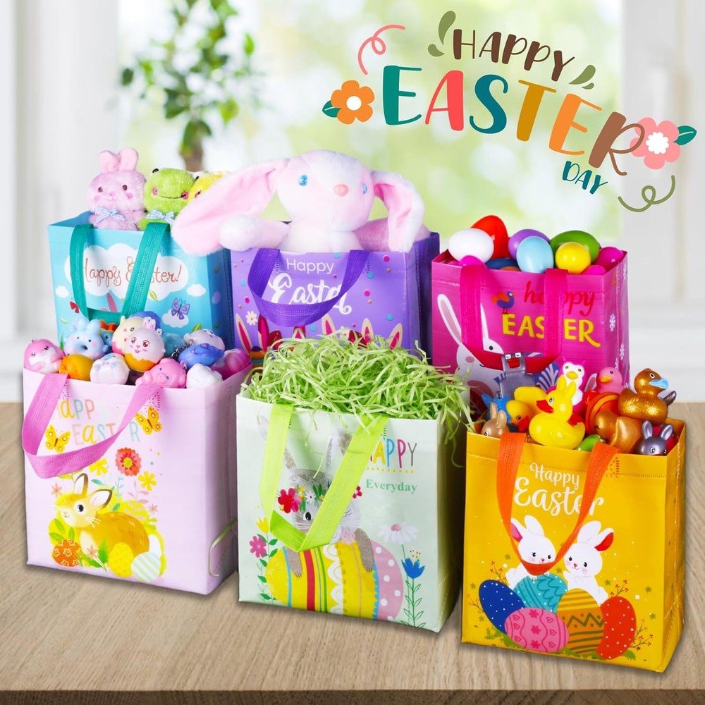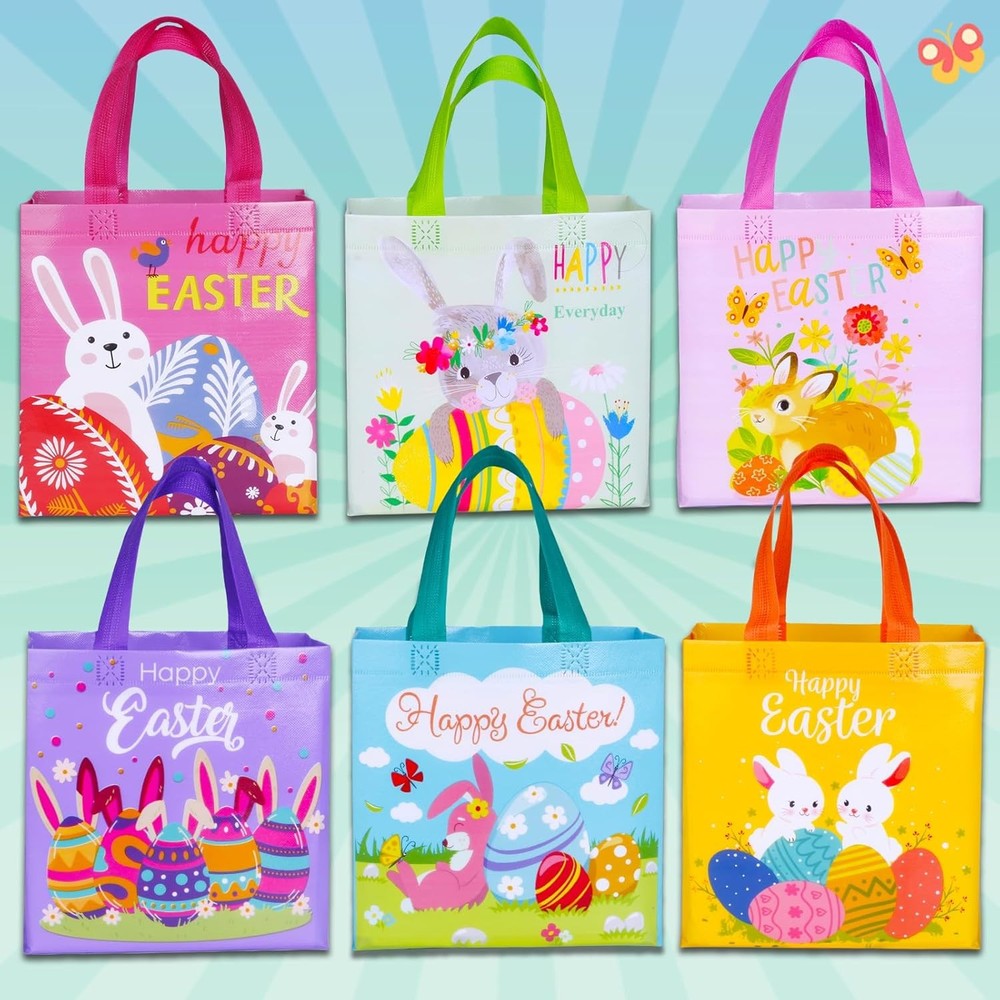 Theme: Easter Type: Does not apply Brand Name: Exun Customer Reviews: 4.9/5 Material: Non-Woven Paper Finish: Metallic Color: Red,Purple,Orange,Blue,Green,Pink Brand: Exun Unit Count: 6.0 Count Item Form: Bag Department: all Country of Origin: United States Size: 1 Count (Pack of 6) Total Eaches: 6 Item Dimensions L x W x H: 8.7"L x 4.5"W x 9.1"H UPC: Does not apply gtin13: Does not apply Occasion: Easter Number of Items: 6 Product Dimensions: 8.7"L x 4.5"W x 9.1"H Pattern: Cartoon