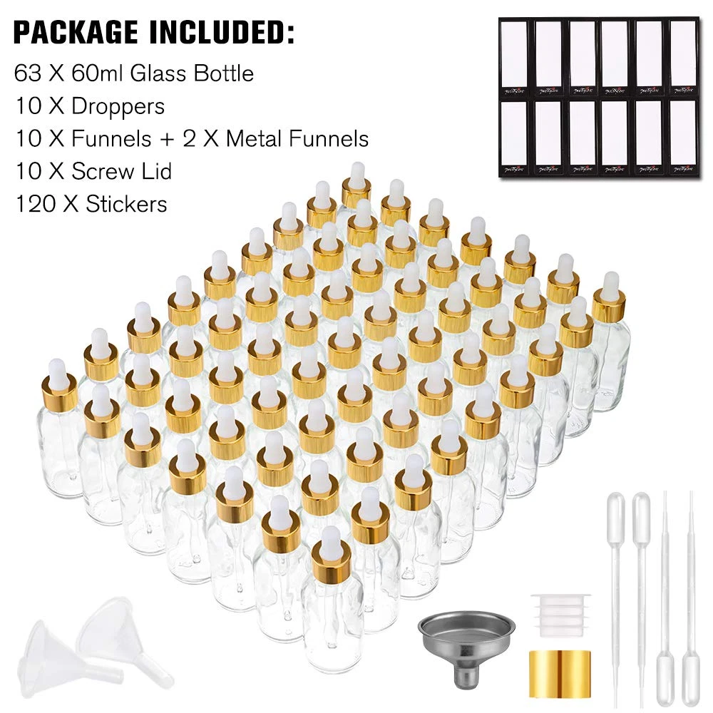 Eye Dropper Bottle 2 Oz (63 Pack Clear Glass Bottles 60Ml with Golden Caps, 2 Ex