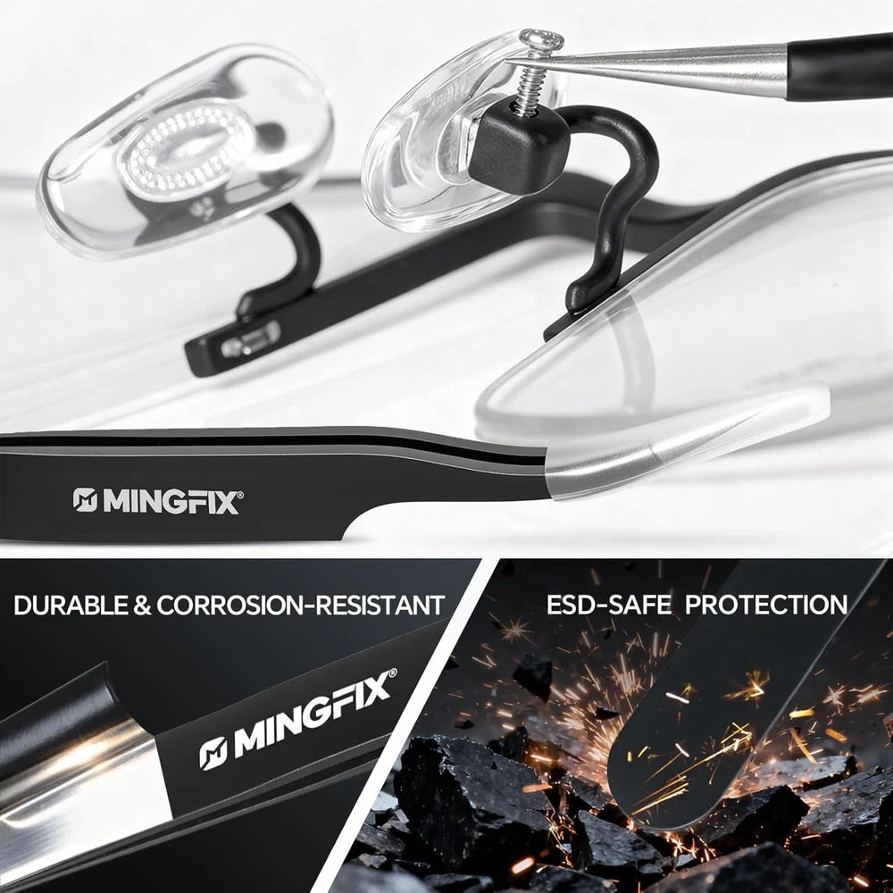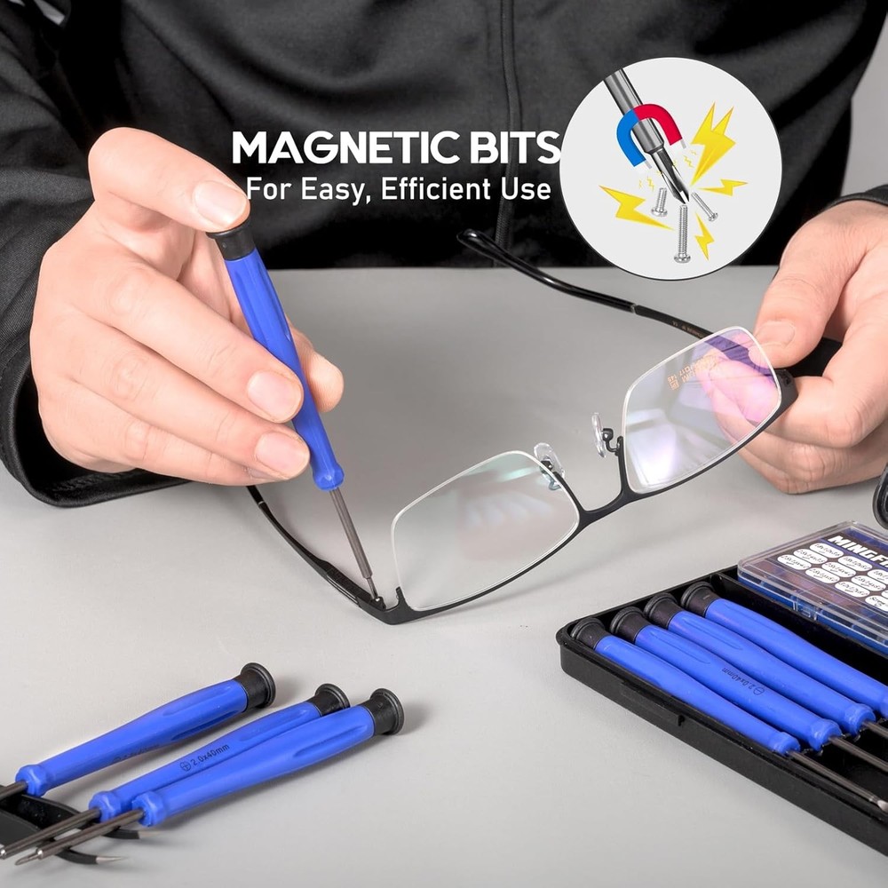Free eBay listing template designed by dewiso.com Eye Glasses Repairing Kit, MINGFIX Magnetic Eyeglass Repair Tool Set with Multiple Size Screws,8 Precision Screwdrivers,Nose Pads,Ear Grips and Tweezer with Travel Case for Glasses,Sunglasses FREE AND FAST SHIPPING! Comprehensive All-in-One Eyeglasses Fixing Kit - It comes with every essential tools for eye glass repairing and part neatly organized in a compact case: from 8 magnetic screwdrivers and 15 different-sized screws to 12 pairs of assorted nose pieces replacement, 3 pairs of anti-slip ear grips, and handy extras like a thin pvc magnifier, tweezers,a packet of lens wipe and a cleaning cloth. Magnetic Eyeglasses Tightening Screwdrivers Set - You get 8 magnetic-tip screwdrivers designed specifically for delicate eyewear. The magnetic screwdriver set for eyeglass repair includes 4pcs Phillips screcrivers with size PH0000/1.2mm, PH000/1.5mm, PH00/2.0mm, PH0/2.5mm, and 4pcs Flathead screwdrivers with size 1.2mm, 1.5mm, 2.0mm, 2.5mm. The magnetic tips make handling tiny screws effortless, whether you're replacing nose pads or eyeglasses repairing. Extensive Selection of Screws for a Perfect Fit Eyeglass - The kit includes a wide variety of 15 types screws, with diameters ranging from 1.0mm to 1.7mm . These screws are suitable for most eyeglass repairs, including nose pad replacements, frames, hinges, frameless glasses, and both reading and prescription glasses. Comfort Variety of Nose Pads - Choose the perfect feel for your nose bridge. The kit provides 12 pairs of nose pads across 6 different styles which come in sizes of 13mm, 14mm, and 15mm,It includes 2 pairs of soft, air-chambered silicone nose pads, 4 pairs of standard plastic nose pads in two colors, and 6 pairs of regular silicone nose pads. , allowing you to replace worn-out pads and customize your glasses for all-day comfort. Compact, Organized Case for Easy Storage & Portability - All tools and parts are securely stored in a durable, pocket-sized case. This keeps everything organized, easy to find. It's the perfect portable helper to keep in your desk, car, or bag, ready for quick eyeglasses sunglasses repairs anytime, anywhere.Good choices for Christmas and New Year gifts. Product We offer a 30-Day Return Policy on items which you are not completely satisfied with. You have the option for a full-refund or an exchange of the item. No returns are available on items shipped outside of the US . Shipping We offer Free Shipping to the US and ship within 2 business days of payment, usually sooner. We use UPS express shipping. That's why your products are usually delivered within 3 days . Contact We try our very best to make sure every customer is completely satisfied. If there's a problem , message us! We're happy to help. 24/7 live chat available.