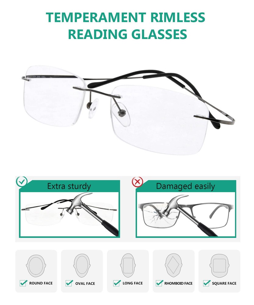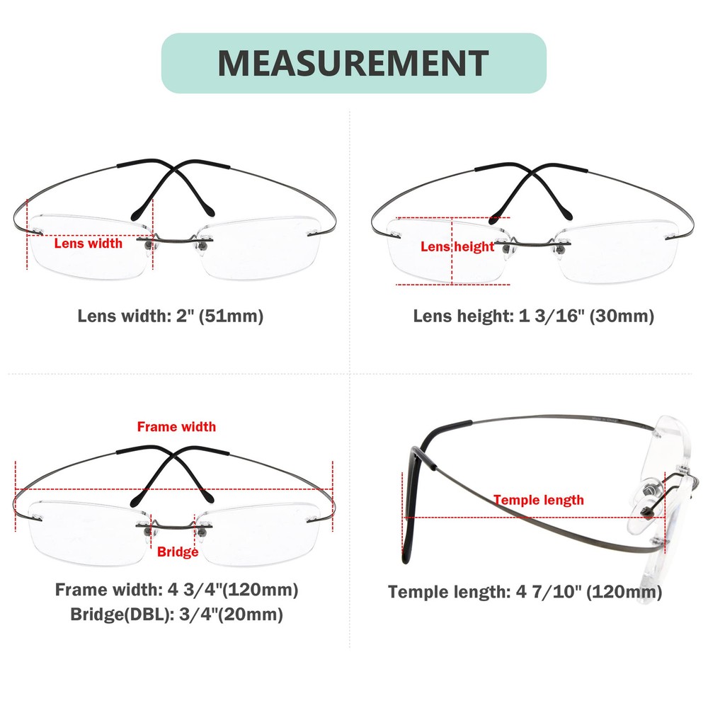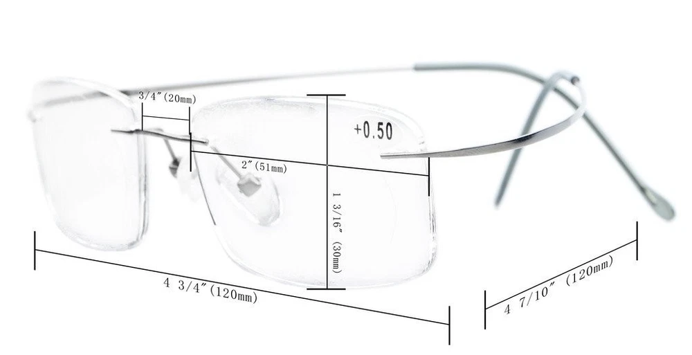 PRODUCTS DIMENSION - Frame material: metal,Lens width: 2"(51mm),Frame width: 4 3/4"(120mm),Lens height: 1 3/16" (30mm),Bridge (DBL): 3/4"(20mm),Temple length: 4 7/10" (120mm),Spring hinge:No,Lenses: Aspheric,Head size: Narrow to Medium. EYEKEPPER TITANIUM RIMLESS READING GLASSES EYEKEPPER READING GLASSES - included a microfiber cloth and hard zipper case,There are no hinges at the edge of the lenses, just bent wires from the side to go to your ears.very very lightweight. QUALITY TITANIUM FRAME - FDA Registered Reading Glasses and Eyewear In case any broken problem happens, contact the seller of Eyekepper without hesitation to solve the problem until satisfaction. Eyekepper provides lifetime after sale service for all Eyekepper reading glasses. Customers can return and get refunded for any reason. You have no risk to try