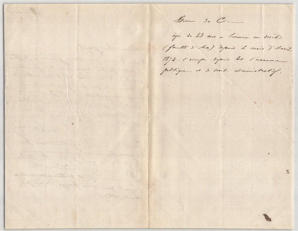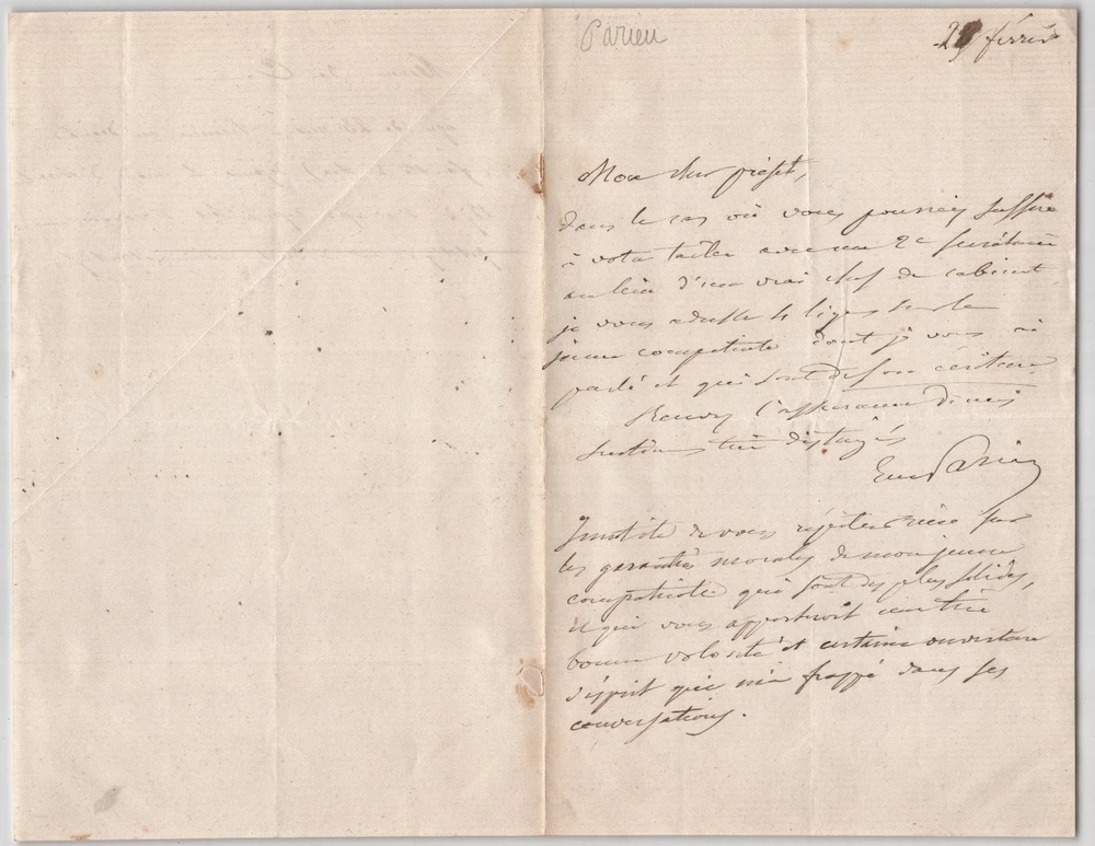 Free eBay listing template designed by dewiso.com Félix Esquirou de Parieu. Lettre autographe signée Homme d'État français Lettre autographe signée de Félix Esquirou de Parieu, non datée, rédigée à l'encre brune sur un double feuillet de papier vergé. Lettre de recommandation adressée à « Mon cher préfet », dans laquelle il présente à son correspondant un « jeune compatriote » qu’il souhaite recommander pour un poste de secrétaire. Ce type de correspondance témoigne du réseau d’influence de Parieu au sein de l’administration impériale. Félix Esquirou de Parieu (1815-1893) fut économiste, jurisconsulte et homme politique français. Conseiller d’État sous la Monarchie de Juillet, puis vice-président du Conseil d’État sous le Second Empire, il participa activement à la réforme monétaire européenne et présida la Commission des monnaies en 1865, qui posa les bases de l’Union monétaire latine. Dimensions : 13,4 x 20,9 cm État : Voir photos et description pour plus de détails. Nombre de pages : 2 pages Félix Esquirou de Parieu Félix Marie Louis Pierre Esquirou de Parieu, né le 13 avril 1815 à Aurillac et mort le 8 avril 1893 à Paris, est un homme d’État français. Wikipédia Contactez-nous Lettres autographes, vieux papiers, livres anciens, photographies, gravures, timbres... Nous expertisons et/ou rachetons dans toute la France vos lettres, collections de lettres et livres anciens. Une question ? Une précision ? N'hésitez pas à me contacter Paiement Sont acceptés les paiements par eBay, par PayPal, par virement ou par chèque. Envoi Envoi soigné dans un emballage rigide et étanche sous trois jours. Prévoir les délais postaux habituels en plus. Retour Satisfait ou remboursé. Si vous n'êtes pas entièrement satisfait, retour à la charge du vendeur pour l'Europe. À la charge de l'acheteur pour le reste du monde. Lettre autographe signée de Félix Esquirou de Parieu, non datée, rédigée à l'encre brune sur un double feuillet de papier vergé.Lettre de recommandation adressée à « Mon cher préfet », dans laquelle il présente à son correspondant un « jeune compatriote » qu’il souhaite recommander pour un poste de secrétaire. Ce type de correspondance témoigne du réseau d’influence de Parieu au sein de l’administration impériale.Félix Esquirou de Parieu (1815-1893) fut économiste, jurisconsulte et homme politique français. Conseiller d’État sous la Monarchie de Juillet, puis vice-président du Conseil d’État sous le Second Empire, il participa activement à la réforme monétaire européenne et présida la Commission des monnaies en 1865, qui posa les bases de l’Union monétaire latine.