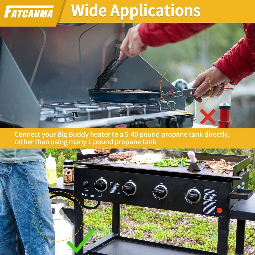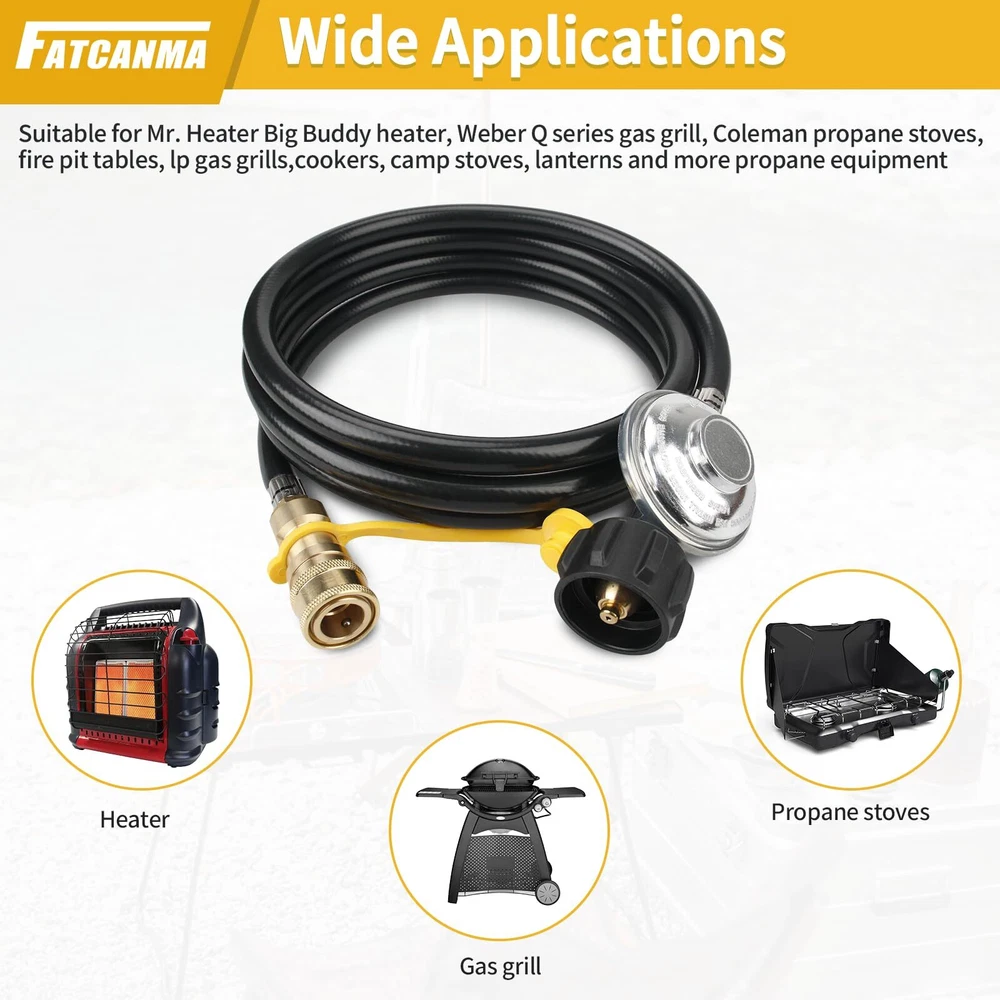 Only fit for Mr. Heater Big Buddy: The propane regulator hose assembly replacement for use on Mr. Heater MH18B & F274830 Big Buddy indoor / outdoor heater. This quick connect hose only work on Big Buddy models, so please don't be for other heater models buy it 3/8” Quick Connect & QCC1 connection (Type 1) & Regulator. Female quick connect fits standard 3/8 male quick connect (SAE fitting). QCC 1 connection hook to a 5lb-40lb propane tank cylinder Quality Propane Hose Regulator: High hose is made of high-quality brass and rubber tubing connection, high-quality air tightness, can prevent air leakagecan prevent air leakage Easy to Install: The 8 feet propane hose with regulator are ready to use right out of the box. Connect the POL connector directly to the propane tank and tighten the connector by hand, no tools required Note:Please confirm the model and size before purchasing. If you have any questions about our F271803 8 FT propane hose with regulator, whether it is pre-sales or after-sales, please feel free to contact us through Amazon support for greater assistance