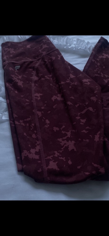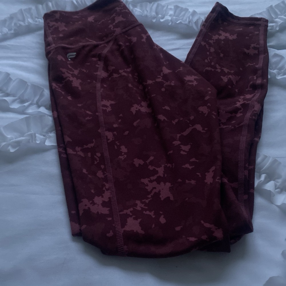 Fabletics Define Powerhold High Waisted 7/8 leggings in pink/red, size 2XS. These ankle-length leggings feature a leopard print design, made from a polyester blend material. They have a high-rise waist for a secure fit. The leggings are part of the Fabletics brand and are made in Haiti.
