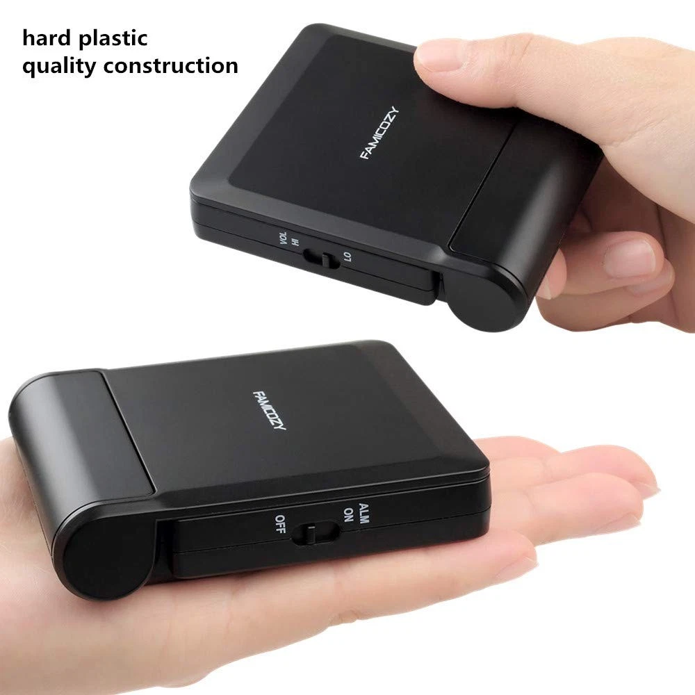 Simple Folding Travel Alarm Clock COMPACT LIGHTWEIGHT This clock has a flip-out stand that can fold over to make a cover to protect the screen and your settings when packed.It is compact and lightweight.Perfect for travelling and can be used every day at home too EASY-TO-READ BOLD NUMBERS Bold numbers on the clear screen make it easier to see the time even across the room ALARM VOLUME HIGHT/LOW OPTIONS The alarm is reasonably loud without being shocking.It starts to beep slowly and then gets faster for 2 minutes to gently wake you up.Moreover the alarm volume has high and low options to meet your need EASY TO STOP THE ALARM No more fumbling.Just press any of the four buttons on front to stop the alarm for fast access especially when you are half awake.And it is very easy to set the time and alarm,it is just simple and clear SNOOZE BACKLIGHT Big light button on the top can be easily reached out and touched to light up the screen for a few seconds to see the time in dark.The welcome snooze function offers you another 5 minutes sleep each time it is initiated Product Specification Size:2.83*3.42*0.78in Weight:0.15lb Requires 2 AAA battery(NOT INCLUDED) Package include 1 x clock 1 x instruction manual Warranty Money back guaranteed with no question asked if not satisfied with the product COMPACT LIGHTWEIGHT-The flip-out stand can fold over to make a cover to protect the screen and your settings when packed.This folding clock is compact and lightweight,perfect for travelling as well as for everyday use at home.It only requires 2 AAA battery(not included) with low power consumption EASY TO SET UP-It is very easy to set up without tricky operations.The buttons dont beep when you press them while setting.Bold numbers on the clear screen make it easier to see the time even across the room.User friendly for children and seniors ALARM VOLUME HIGH/LOW OPTIONS-The alarm is reasonably loud without being shocking.It starts to beep slowly and then gets faster for 2 minutes to gently wake you up.Moreover the alarm volume has high and low options to meet your need EASY TO STOP ALARM-No more fumbling.Just press any of the four buttons on front to stop the alarm for fast access especially when you are half awake.And it is very easy to set the time and alarm which is more accurate than analog alarm clock SNOOZE BACKLIGHT-Big light button on the top can be easily reached out and touched to light up the screen for 5 seconds to see the time in dark.The welcome snooze function can offer you another 5 minutes sleep each time it is initiated