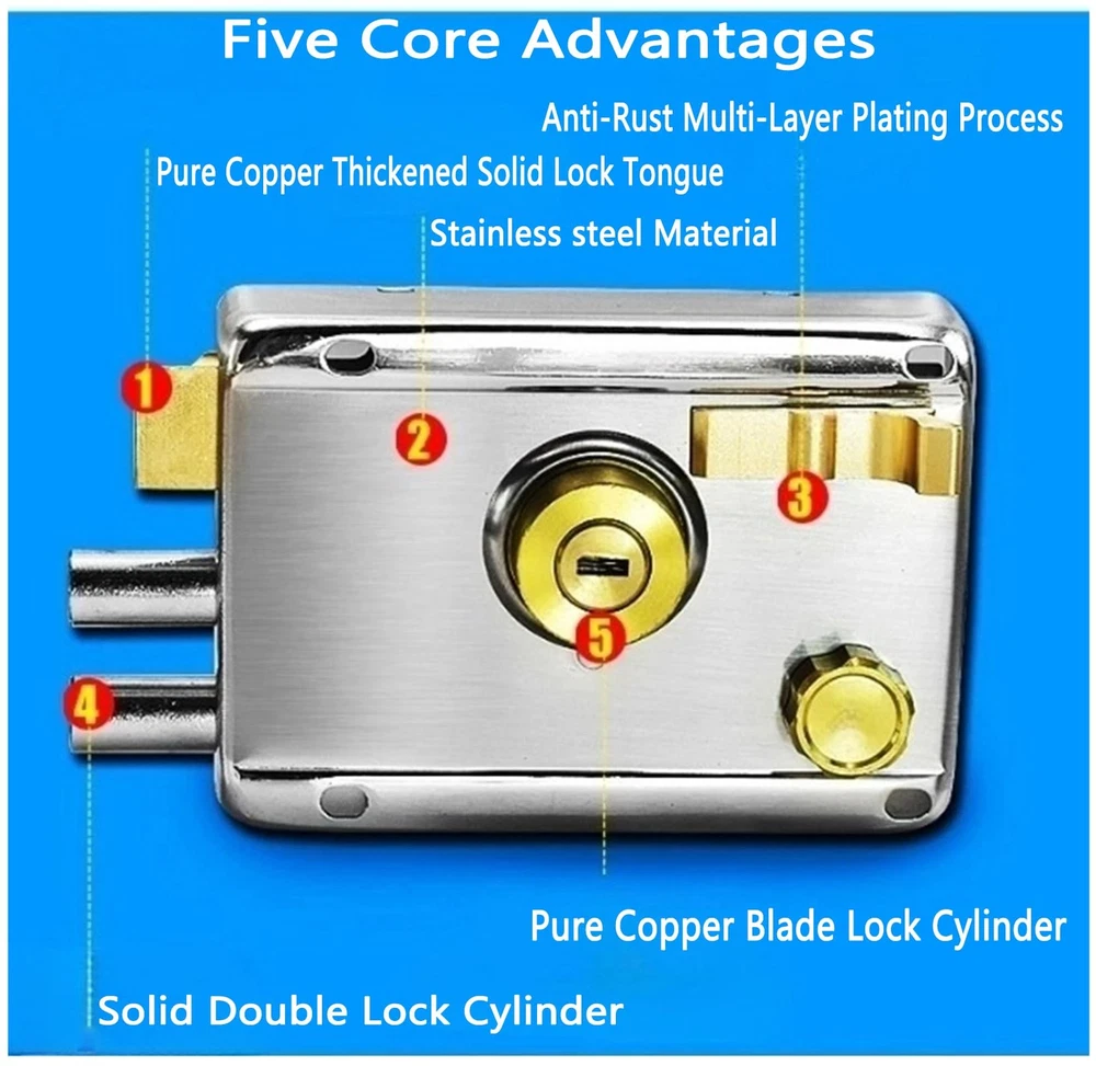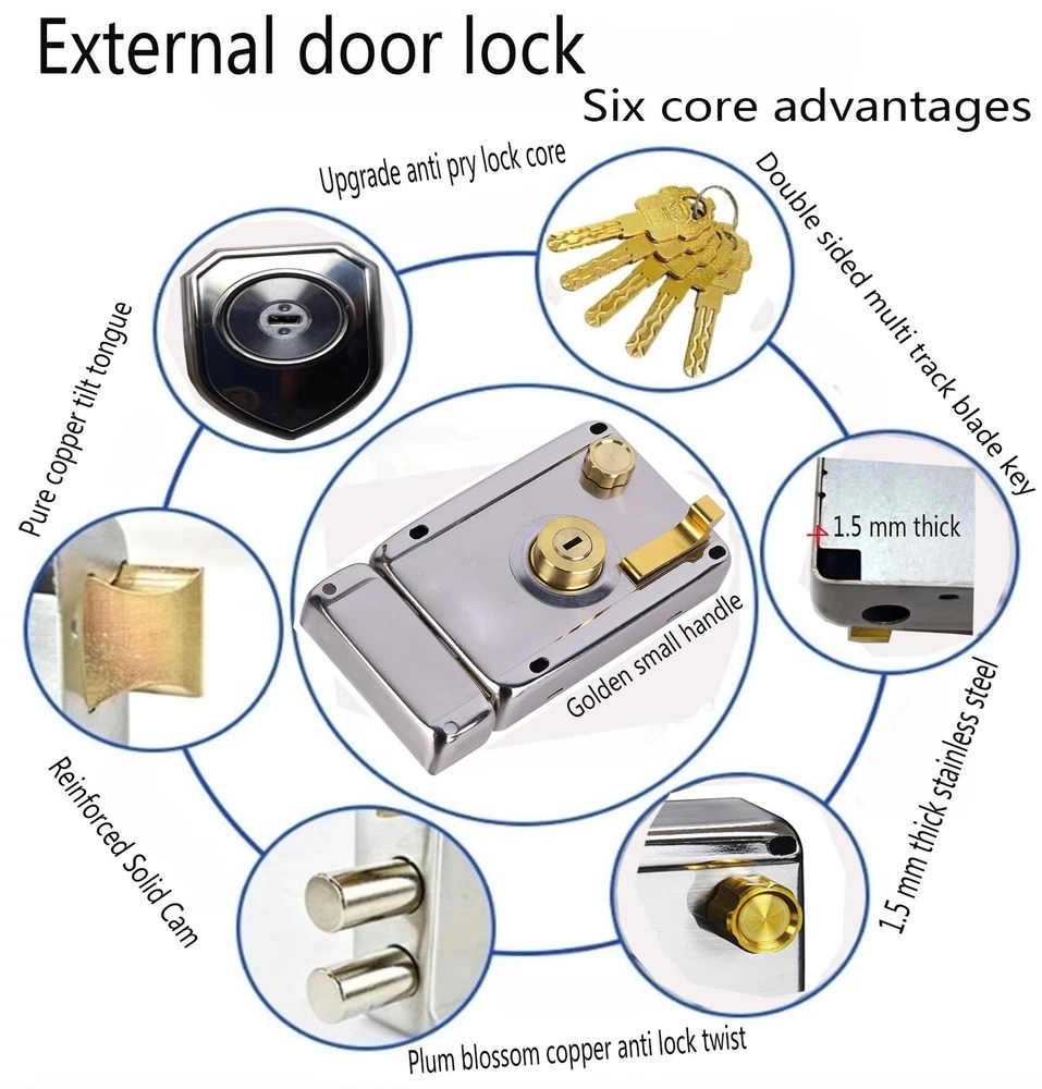 This lock set is a fantastic upgrade for any door! The solid stainless steel and brass construction feels sturdy and secure. The double-bolt system adds extra safety, and the smooth operation makes locking effortless. Perfect for homes, offices, or gates—installation was quick, and it looks sleek in silver or gold. Highly recommended for durability and peace of mind!
