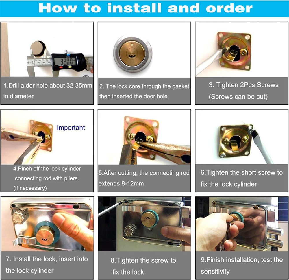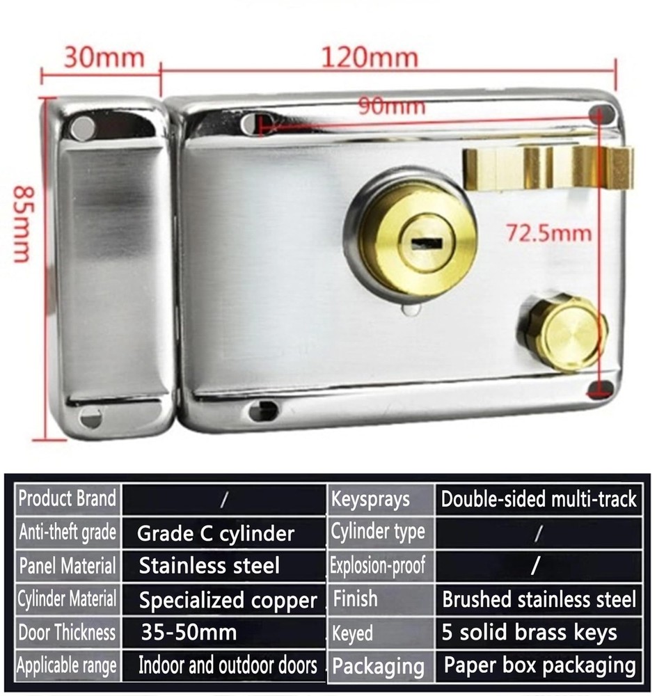 Designed With Double bolt,Deadbolt and Latch, This Lock set Will be Perfect for Family House,Flat Gate,Office Door, etc, Made of 1.5 mm Thick Stainless steel and Brass Material Main Material: Stainless steel and Brass Main Color: Silver Tone,Gold Tone Double bolts: Deadbolt and Latch Bolt Lock Cylinder Length: 2.36" / 60 mm Lock Cylinder Diameter: 1.18" / 30 mm Fit Door Thickness: No more Than 2.36" / 60 mm Overall Size: 5.2" x 3.35" x 1.77" / 132 x 85 x 45 mm Packing Weight: 850g; Packing Size: 145 x 90 x 70 mm 1 Pcs Hand Ring Lock set, Including 1 pcs Rim Lock, 5 pcs Keys,1 pcs Lock Cylinder and Some Installation Accessories Quality Selection: Vertical Cylinder Deadbolt Rim Lock Made of 1.5 mm Thick Stainless steel and Brass.Surface layer Comes Painted in an Aluminum Finish, Internal Solid Gold Tone Brass Lock Cylinder Using Design: Deadbolt Rim Lock,Keys with double-sided multi-track slot design,Exterior Side Locking,Keyed with Manual Interior Side Exiting Which can Also be Locked With Key,More Effectively Securing Both Sides Practical Application: Deadbolt Rim Lock Installation is Quick and Easy, And the Package Includes an Installation Template and Instructions,Perfect for Dwelling House, Flat Gate, Office Door Security use Overall Size: Deadbolt Rim Lock Size 132 x 85 x 44 mm/5.2'' x 3.3'' x 1.73''(L*W*H);Lock Cylinder Dia.: 27 mm/1.06''; Backset Center Distance: 60 mm/2.4'',Fit Door Thickness: 35 mm-55 mm/1.38''-2.17'' Package Content: 1 x Rim Lock, 5 pcs x Key, 1 x Lock Cylinder, 1 x Shield Type Locking Ring,Some Install Parts; Product Name: Deadbolt Rim Lock Set,Weight: 750g;