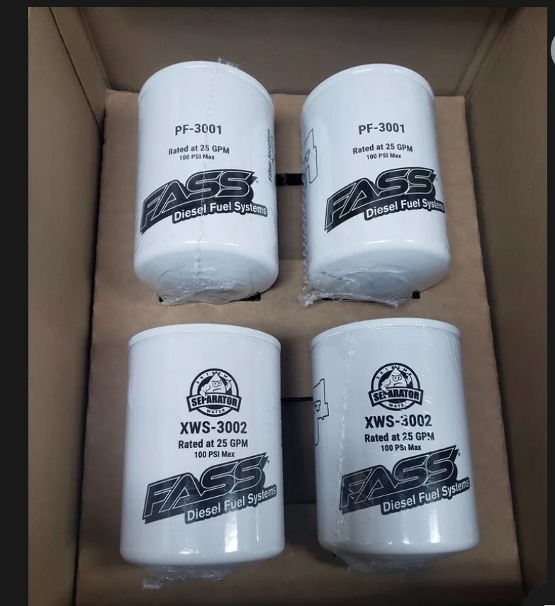 FASS Fuel Filters Pack (2) XWS-3002 & (2) PF-3001. Brand: Fass Condition: New Manufacturer: Fass Perfect for the shop or keeping your garage stocked, each FASS Fuel Filter Pack contains two (2)(XWS-3002) Extreme Water Separators and two(2)(PF-3001) Particulate Filters! Designed with convenience in mind, our new filter packs make it easy to maintain multiple FASS Fuel Systems! The XWS-3002, our new more efficient extreme water separator is rated at 2 micron absolute! Because the filter element traps over 99 percent of the water, a drain is no longer needed on our water separator. When replacing the discontinued filters with the new XWS-3002 and PF-3001, the XWS-3002 will now be placed on the pressure side of the pump and the PF-3001 will be placed on the suction side. Our new Particulate Filter is rated at 144 microns. The 144 micron Particulate Filter on the suction side will drastically reduce cavitation, increase flow properties, lower the sound output of the FASS System, and removes larger fuel particulates. Please see the location diagram on the new filters for proper placement. Each FASS Fuel Filter Pack contains two(2)(XWS-3002) Extreme Water Separators and two(2)(PF-3001) Particulate Filters. Details: Filter Pack contains two (2) (XWS-3002) Extreme Water Separators and two(2)(PF-3001) Particulate Filters Designed with convenience in mind, our new filter packs make it easy to maintain multiple FASS Fuel Systems! More efficient extreme water separator is rated at 2 micron absolute! Filter element traps over 99 percent of the water, a drain is no longer needed on our water separator. Must be uséd in conjunction with the PF-3001, the new filters cannot be uséd in combination with the FF-3003/FF-3010 or FS-1001/FS-1020. Our new Particulate Filter is rated at 144 microns Particulate Filter on the suction side will drastically reduce cavitation, increase flow properties, lower the sound output of the FASS System, and removes larger fuel particulates.
