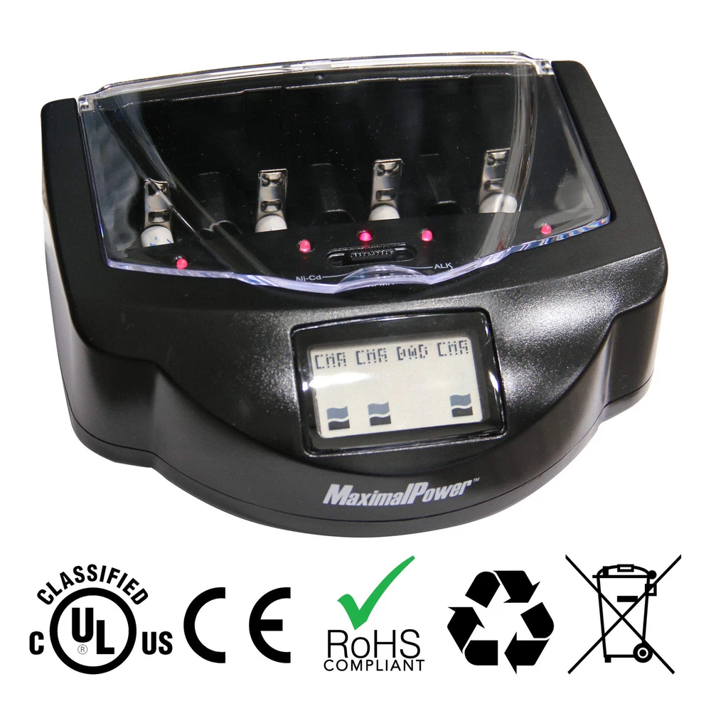 Universal Charging: Give your household batteries more life with this Universal Battery Smart Charger (Mark I) built with 4 independent charging slots to simultaneously charge AA/AAA/C/D and 9V batteries Compatible With: Sliding spring-loaded negative poles on the dock can adjust to differently sized batteries and includes a switch button that changes modes between Ni-Cd, Ni-MH, and Alkaline/RAM charging Charge Protection: Built-in protection circuit prevents batteries from overcharging, over-discharging and over-heating while stopping sudden current fluctuations for a maximized battery charge Smart Display: LCD Display shows a clear and fast reading of the battery mode and charging status of working rechargeable batteries while also being able detect defective or non-rechargeable batteries Backed by Company: provides 1-Year Warranty and Customer Service Support on all of our brand products; Package includes 1x Charger Unit, 1x AC Power Adapter, and 1x User’s Manual (batteries and other accessories not included!)