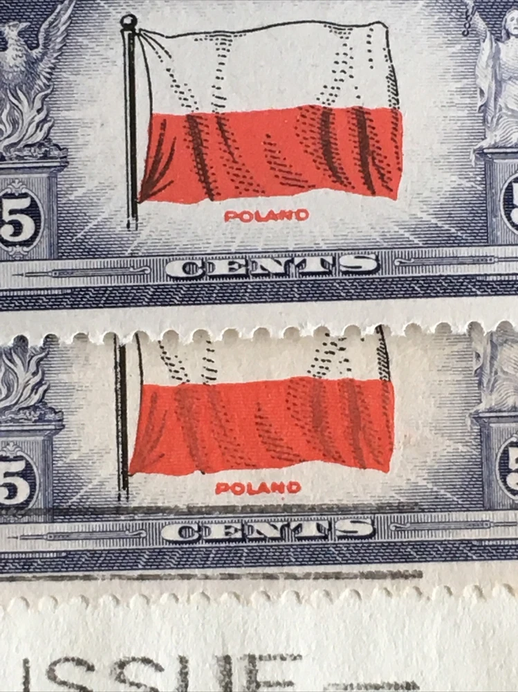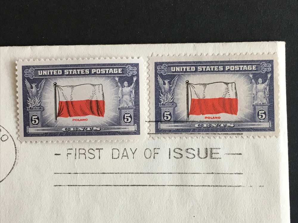 22 June 1943 cancelled FDC at Chicago, IL; the stamp is a Sc# 909c which shows the red color of the flag printed over the black color. A regular Sc# 909 is shown in the second picture for comparison. Chicago FDC carries a premium and of course the reverse printing has a CV of $150. That combination should make this a very desirable FDC.
