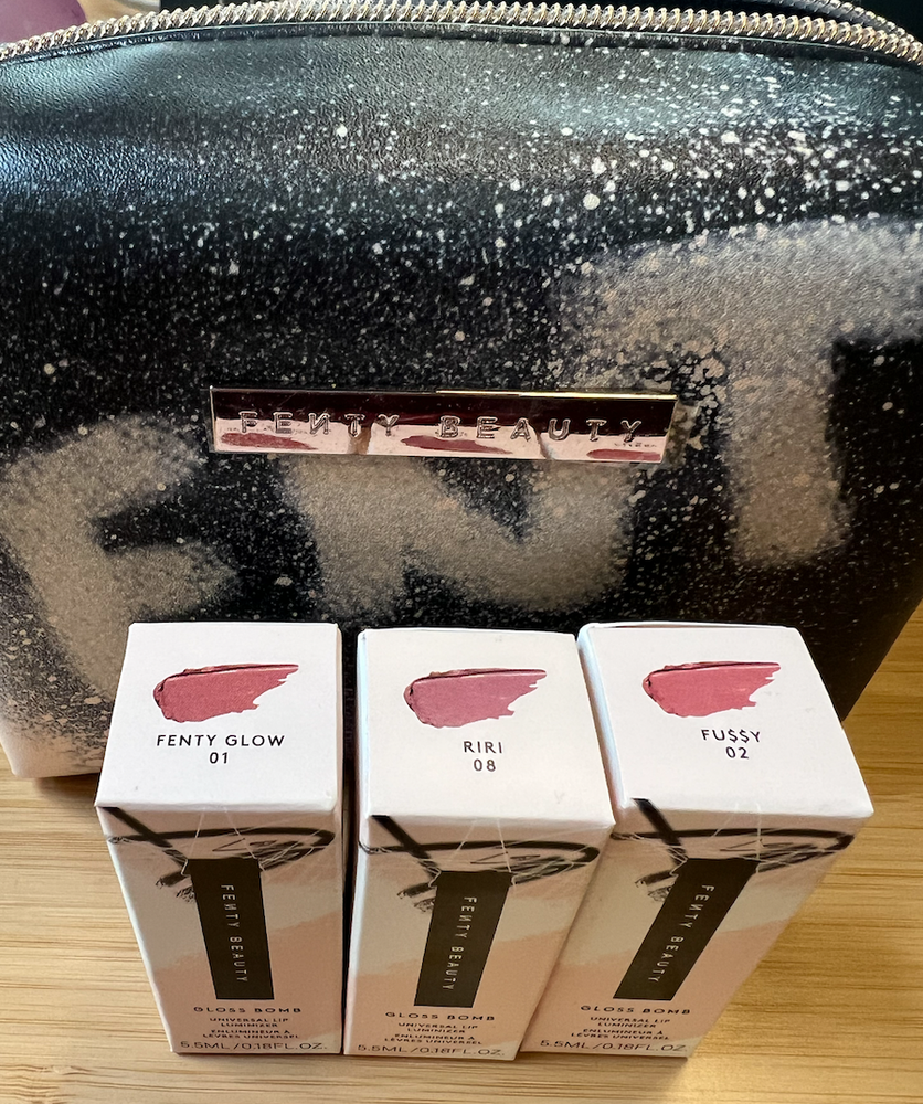 NEW FENTY BEAUTY Black Makeup Bag Cosmetic Travel Pouch + (3) 0.18oz Gloss Bombs. • Limited edition travel pouch - Brand new • Gloss Bomb - Universal Lip Luminizer (Fenty Glow 01) • Gloss Bomb - Universal Lip Luminizer (Riri 08) • Gloss Bomb - Universal Lip Luminizer (Fu$$y 02) All new - All glosses are in new in OG packaging.