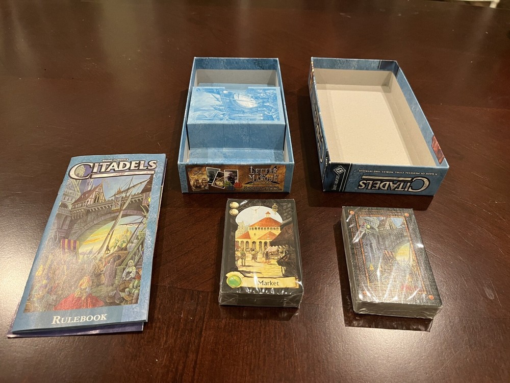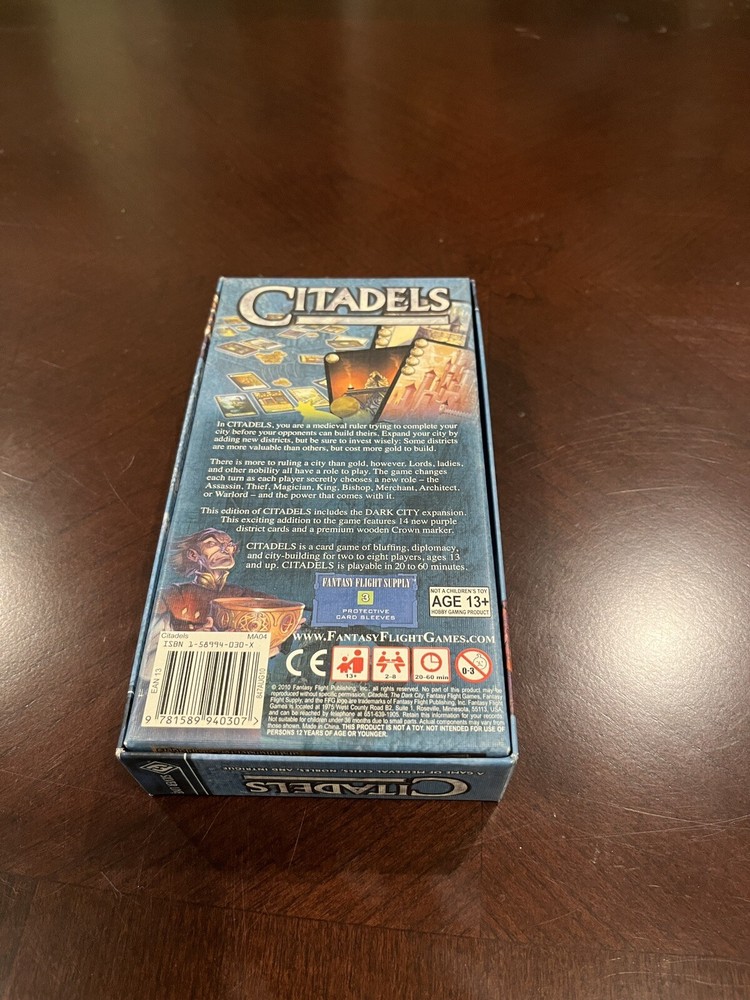 Explore the mystical city-building realms with Fantasy Flight Games' Citadels, a card game that invites players to assume the roles of fantasy city-dwellers. This 2004 release comes with the Dark City Expansion (2nd) and is presented in an excellent condition, protected by sleeves for added safeguarding. Ideal for 2 or more players aged 14 and up, this game promises to deliver hours of imaginative fun. The game's theme is steeply rooted in fantasy, featuring the Character Family of Citadels, and it is perfect for those who enjoy the strategic depth of card games. The EAN 9781579621577 ensures authenticity, and the MPN indicates that it's a standard edition for enthusiasts and collectors alike. Gather your friends and embark on an epic adventure with Citadels!