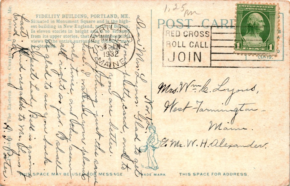 MAKE AN OFFER. THE MORE YOU BUY THE BETTER DEAL I WILL ACCEPT The postcard is from Fidelity Building in Portland, Maine, dated 1932. The building is located in Monument Square and is the tallest building in New England at eleven stories high. The postcard mentions the Red Cross Roll Call, urging recipients to join. The sender, Mrs.