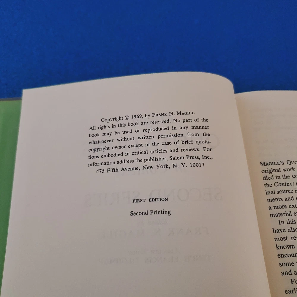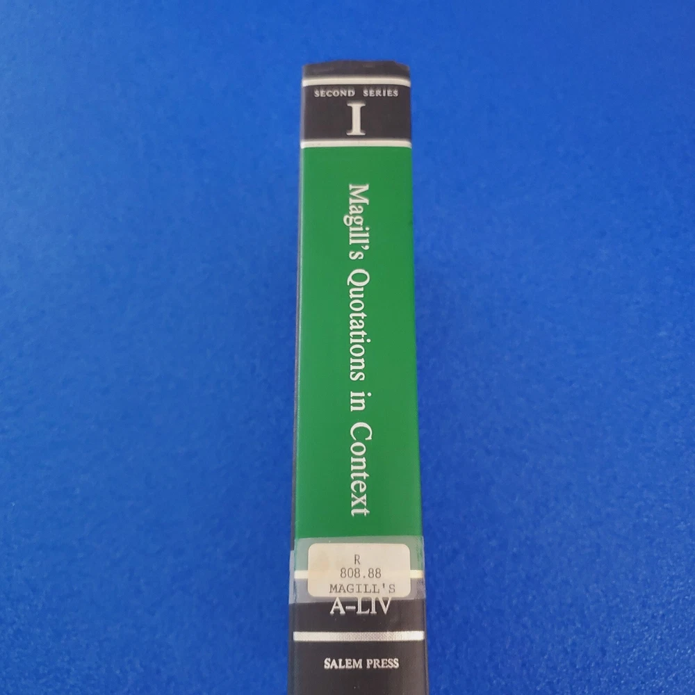 YOU GET THE VINTAGE HARDCOVER BOOK YOU SEE IN THE PICTURES - IT CAME FROM A U.S. AIR FORCE BASE LIBRARY IN NEBRASKA. I PURCHASED IT AT A MILITARY SURPLUS AUCTION TO SELL HERE IN MY STORE - I HAVE SEVERAL MORE BOOKS FROM THE SAME COLLECTION LISTED HERE ON MY SITE SO TAKE A LOOK! - MAGILL'S QUOTATIONS IN CONTEXT SECOND SERIES I A-LIV - EX-LIBRARY BOOK - GOOD CONDITION - PLEASE READ ITEM CONDITION ABOVE FOR MORE DETAILS - LOCC NUMBER: 65-21011 - SHIPPING IS FREE