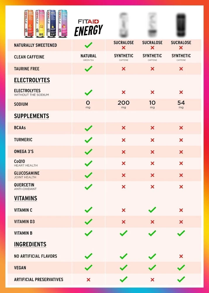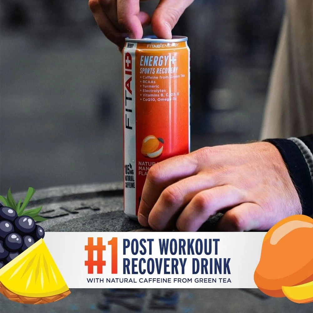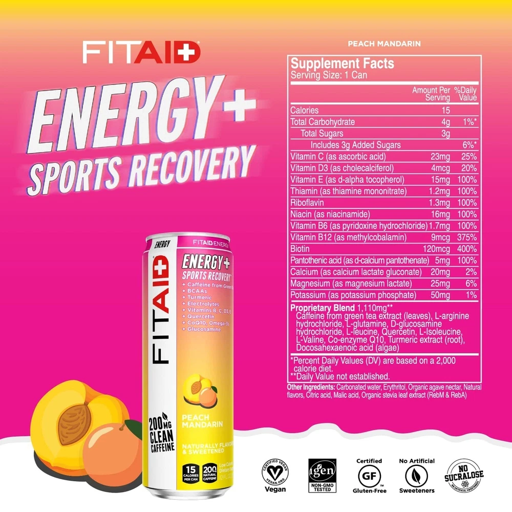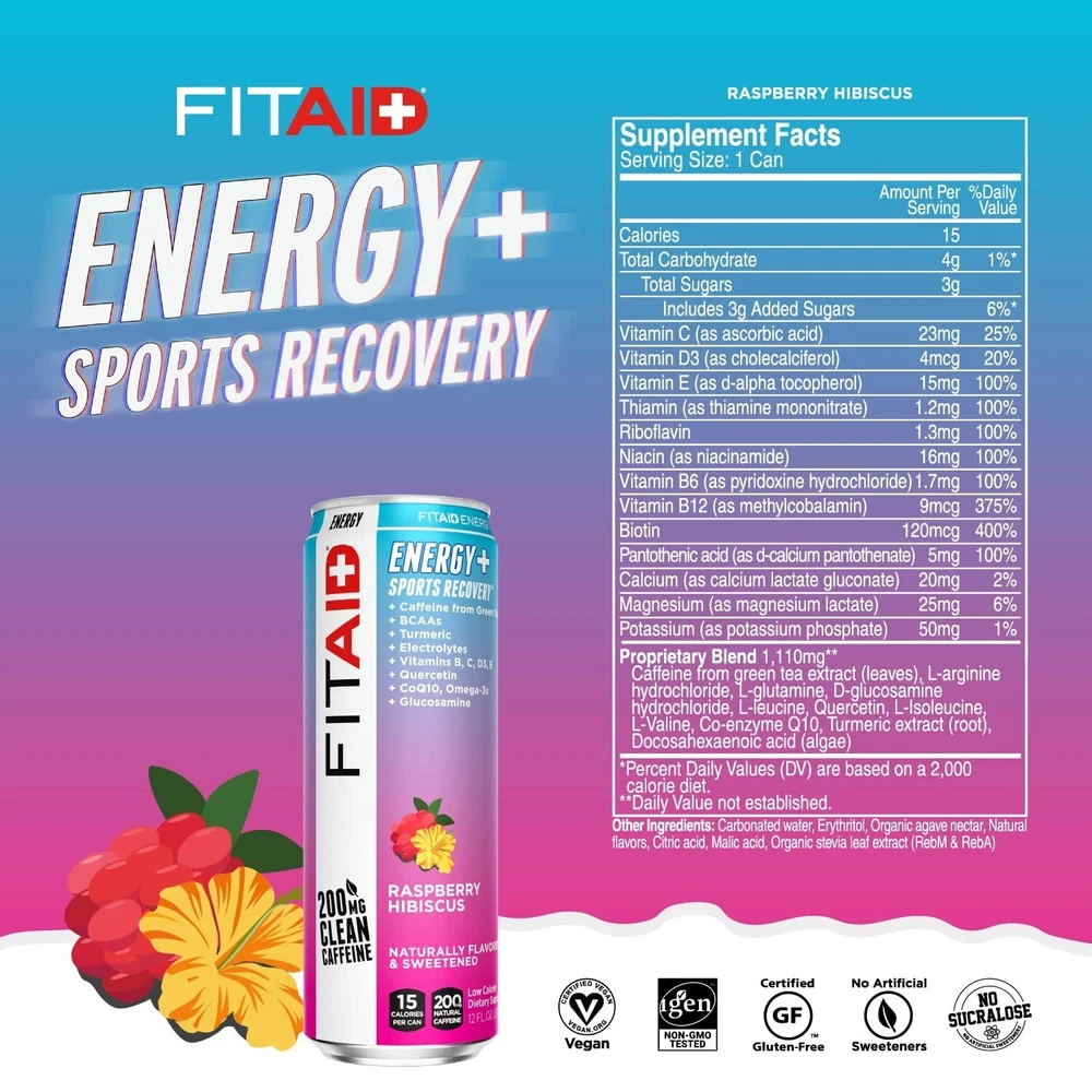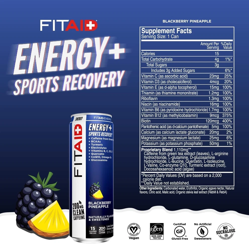 FITAID Energy Drink, 200mg Natural Caffeine, Keto, 15 Calories, Variety Pack, BCAAs, Quercetin, Electrolytes, Omega-3s, Paleo, Vegan & Gluten-Free, 12-oz. cans Pack of 24 Customers may receive FITAID ENERGY VARIETY with either Grape Acai or Raspberry Hibiscus. Low Calorie. Naturally sweetened with only 15 calories in 4 amazing flavors. Ketogenic Friendly, Paleo and Vegan Certified. has sold over 100 Millions Cans. The New FITAID ENERGY has been intentionally crafted with only the best recovery vitamins and supplements. Recharge AND Recover with this all-in-one product. Bright and crisp natural flavors with a clean finish and no aftertaste. No Sucralose Drink ice-cold when you need a pre-workout or post-workout boost, FITAID ENERGY helps you fight off your fitness fatigue, with 4 electric natural flavors. FITAID Energy is the High Caffeine (200mg) version of the #1 Selling Post Workout Drink FITAID. Ideal for HIIT, Weight Training, Pilates, Yoga, or after intense sports like Football, Basketball, Soccer, Baseball, Lacrosse, Swimming, Softball, Wrestling, Hockey, e-Gaming. Get more explosive in your workouts and movements with a bang! Can be taken pre-workout, during and post-workout. As well as Long Drives, Studying, Getting Energized at Work, College Students, Tired Parents. Comes in Variety Mix of all Flavors as well as 24 Bulk Value Packs. FITAID ENERGY is BPA Free. 3g of Net Carbs. Why do we pick these specific ingredients? BCAAs, Glutamine Amino Acids are the building blocks of protein and are essential to the repair of muscles and ligaments. Arginine and Glutamine help develop and maintain two types of strength: power (for max effort lifts) and speed (for Olympic lifts). BCAAs (branched-chain amino acids) reduce protein and muscle breakdown during intense exercise. Omega 3s, CoQ10. Glucosamine, Quercetin, Turmeric The mechanics of high-intensity fitness training can lead to issues with joint and muscle, thus causing unnecessary pain and stiffness. Glucosamine is widely used for its benefit to maintain healthy joints, while Turmeric and Quercetin can help reduce that common post-workout soreness. You’ll be ready to hit the box again right away. B-Complex, Green Tea. A demanding WOD requires stamina and endurance along with bursts of intense power and speed. B vitamins provide the reliable, consistent energy your body demands during an intense workout, and the mild dose of caffeine provided by our Green Tea Extract supplies the boost needed for quick movements. Vitamins C, D, E Powering through an exhaustive workout creates tremendous stress on the body. Calcium, Magnesium, Potassium - Electrolytes regulate nerve and muscle function, the body’s hydration and help the rebuilding of damaged tissue — without the sodium. Best served chilled at 40 Degrees Fahrenheit or 4 Degrees Celsius. Vegan. Supplement your lifestyle.