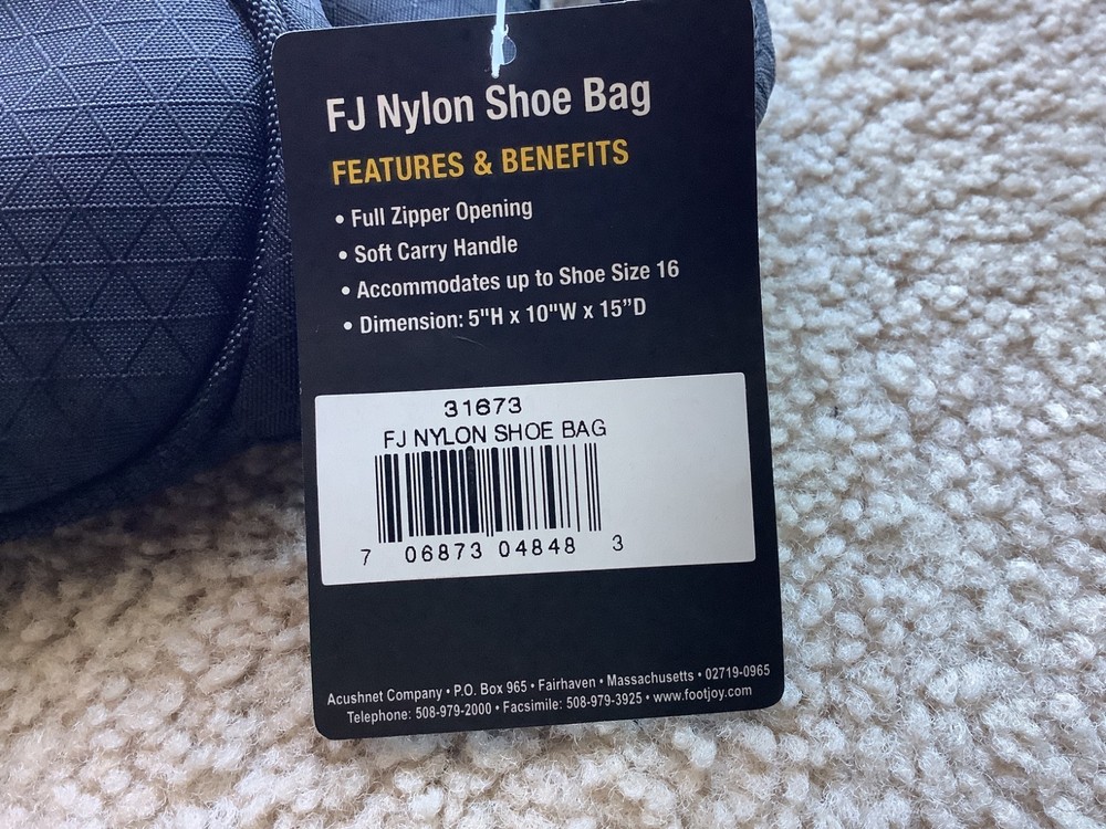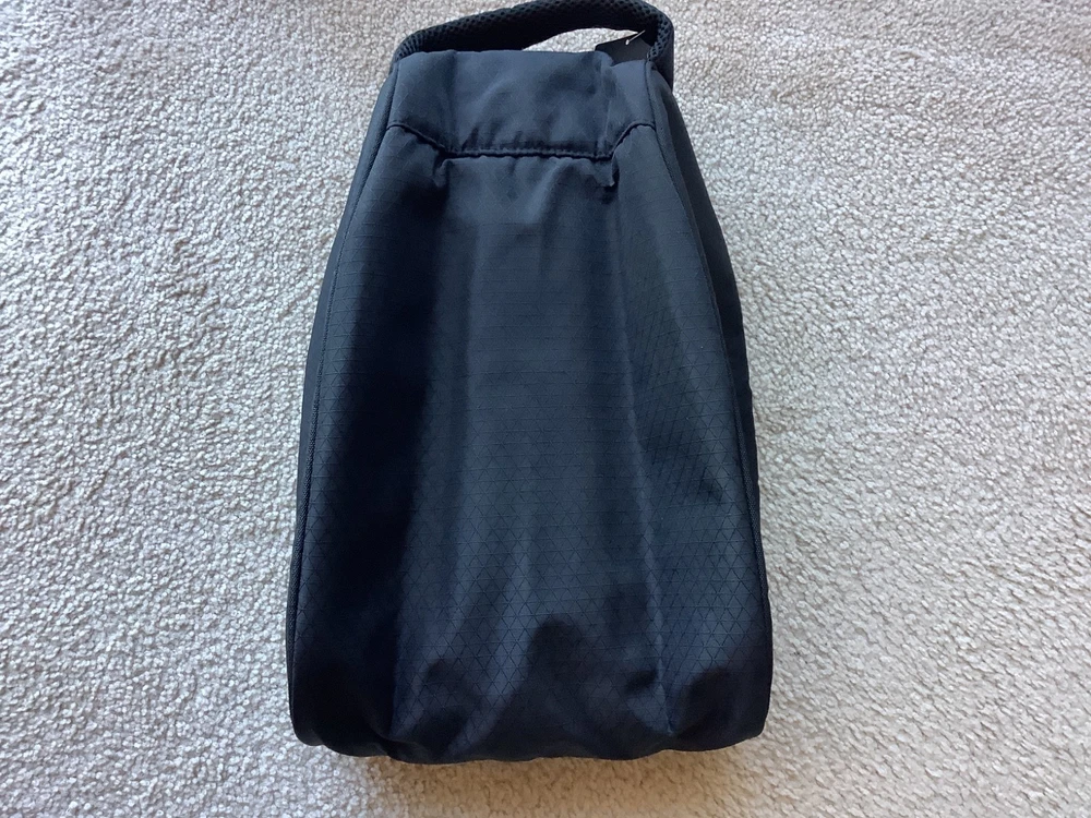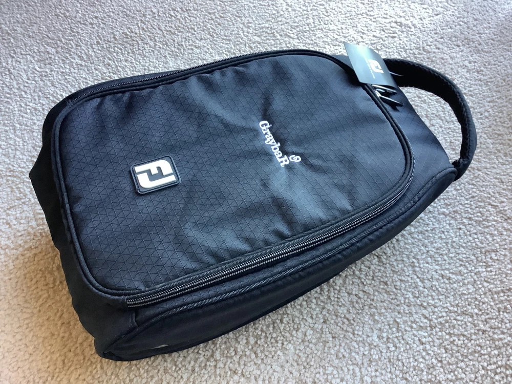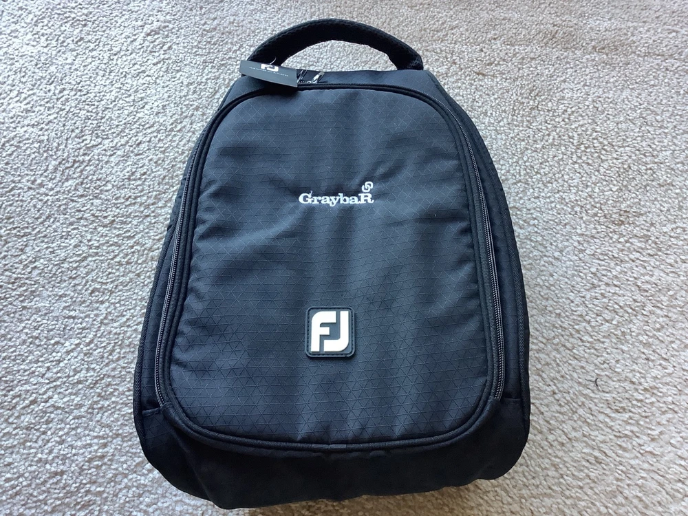 New FJ Footjoy Nylon Black Golf Shoe Bag,Graybar embroidered logo, Vented , padded , DIMENSIONS = 5” H X 10” W X 15” D, accommodates up to size 16, self Cary handle,excellent condition.